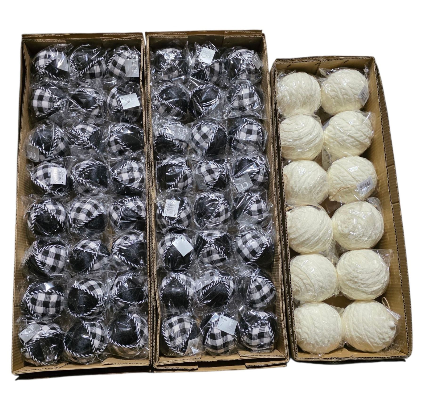 12 Pcs Ball Knitted 4.5" Cream, 48 Pcs Ball Fabric Black/White (Christmas Forever - XM-JC6261, XM-BA4252)