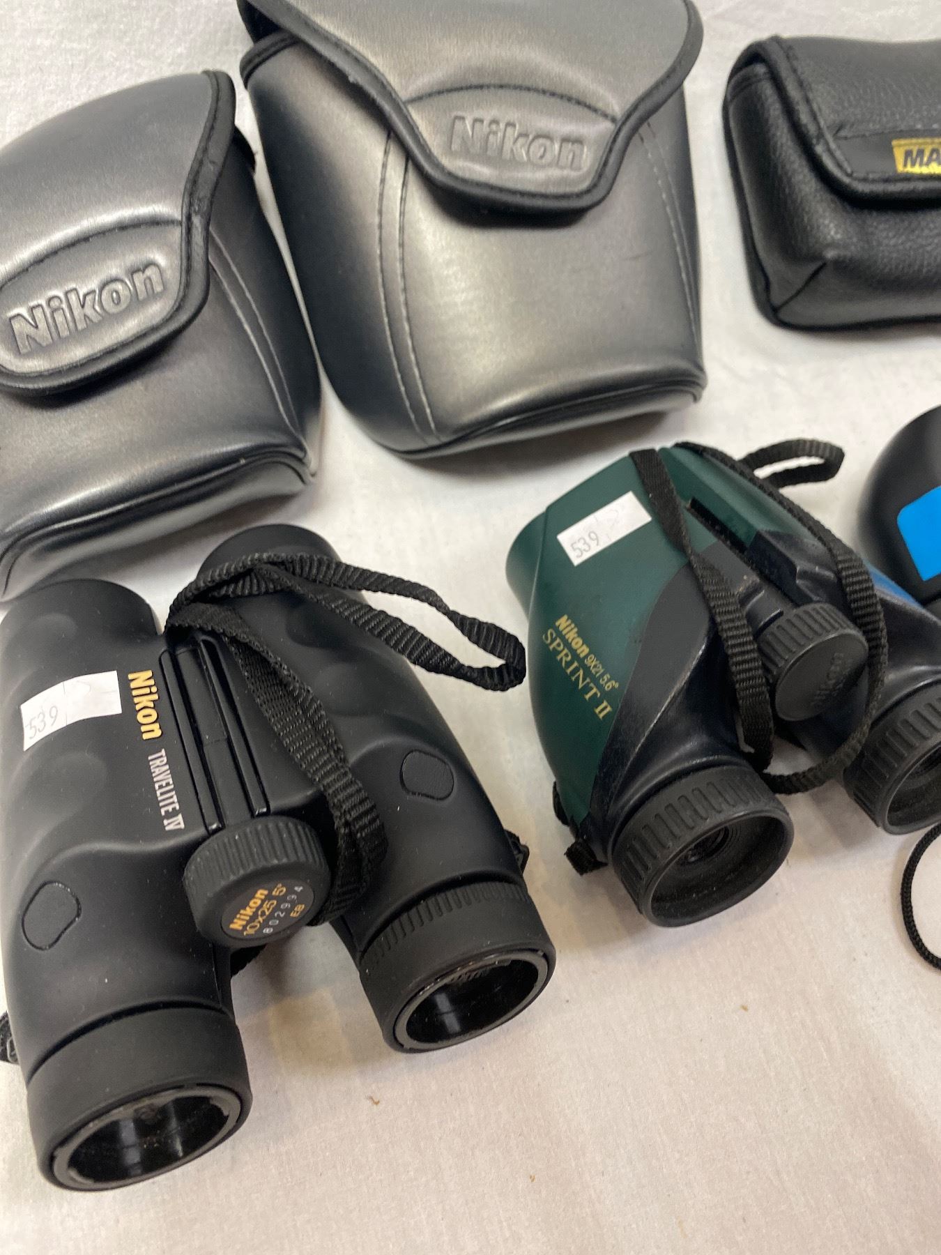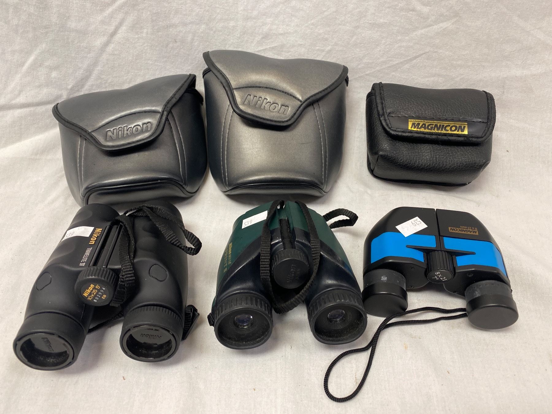 3 Binoculars, Nikon Trave Lite IV, Nikon Sprint II, And Magnicon With Original Carrying Cases