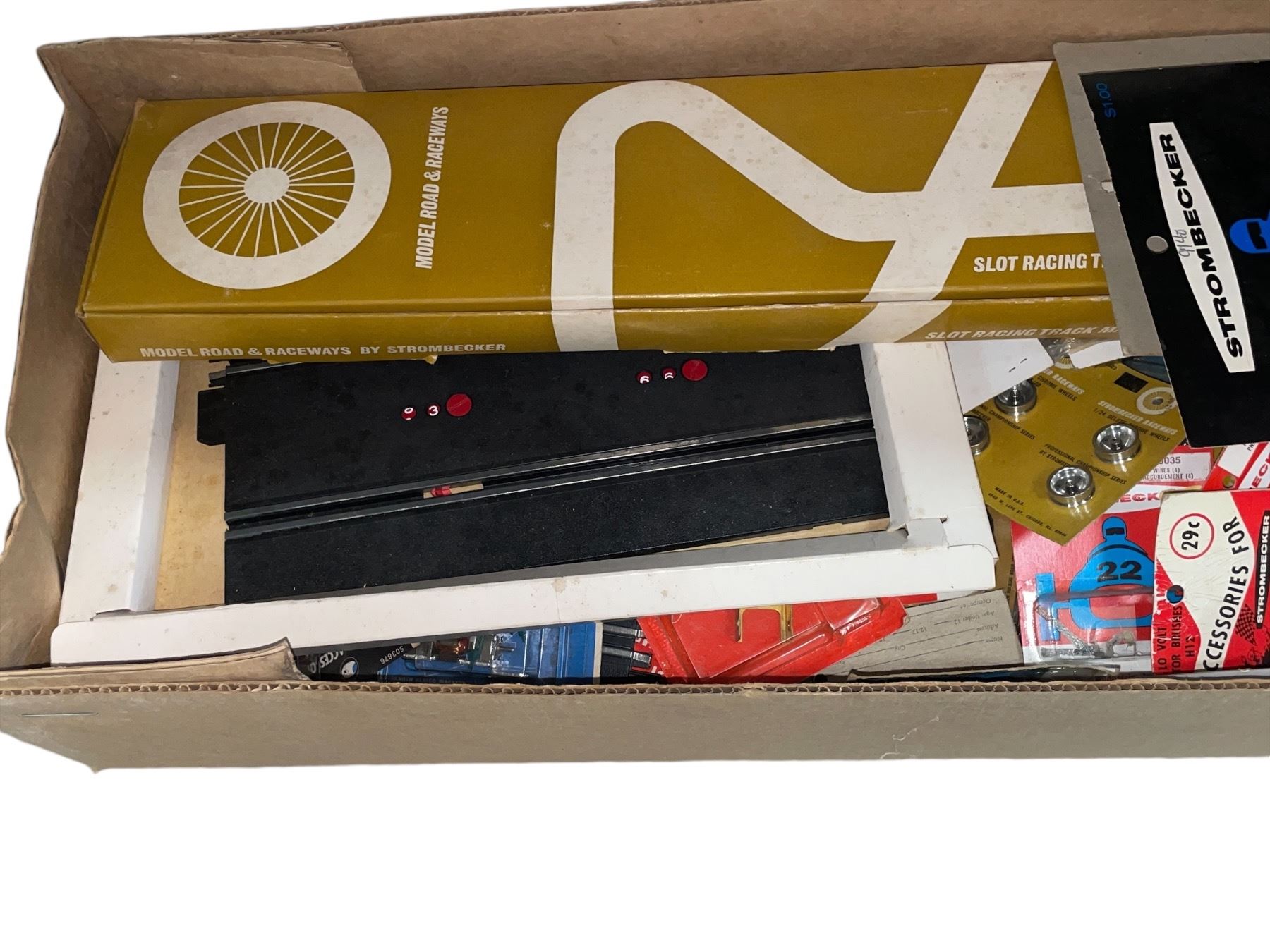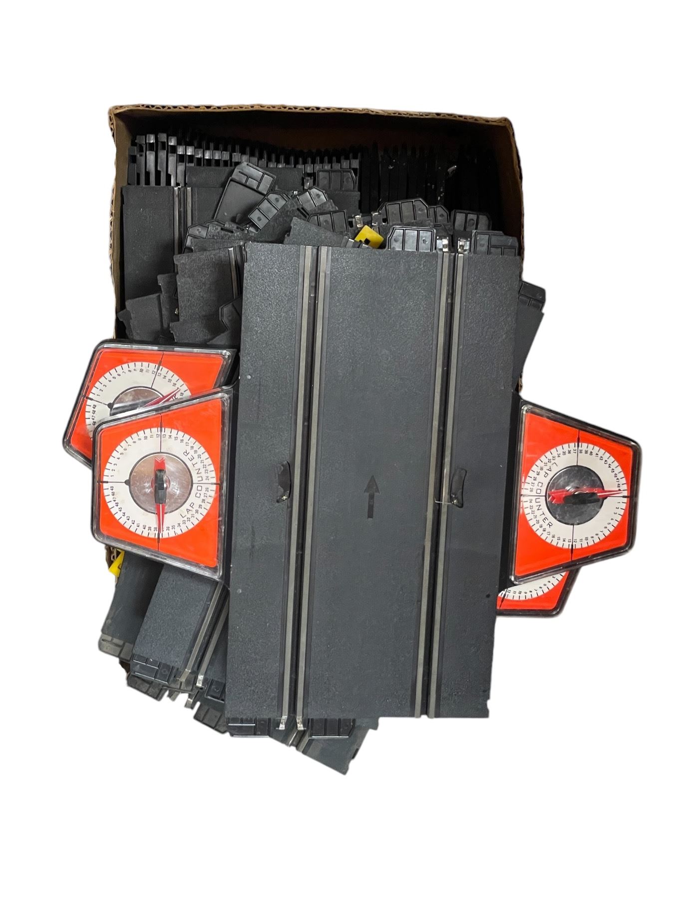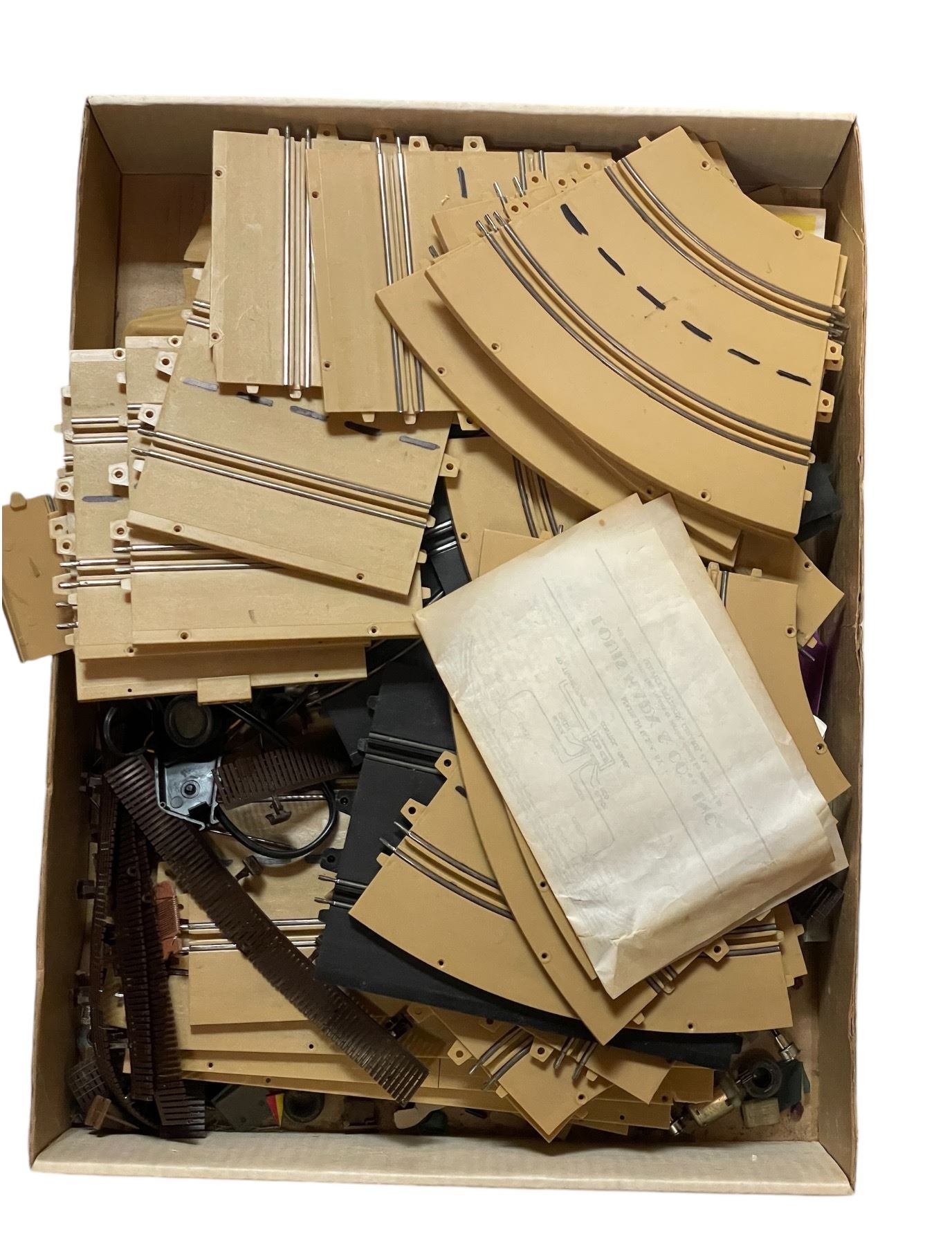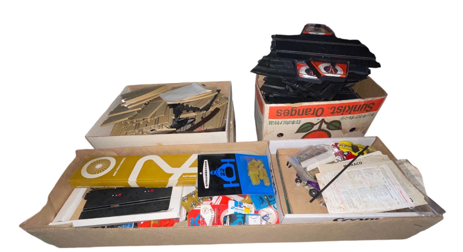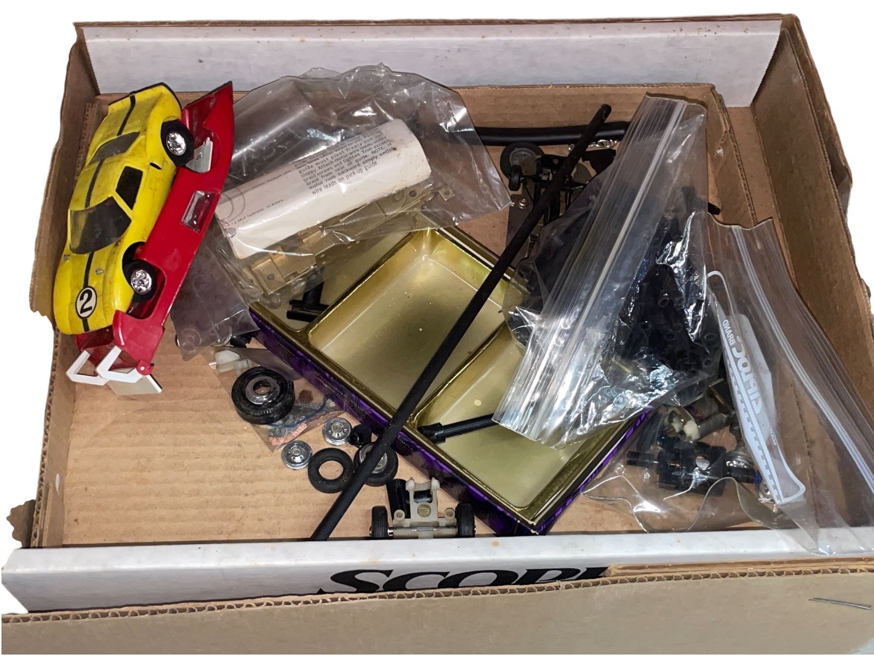 3 Boxes Of Slot Car Related Items: Track, Wheels, Tires, Wiring, & More