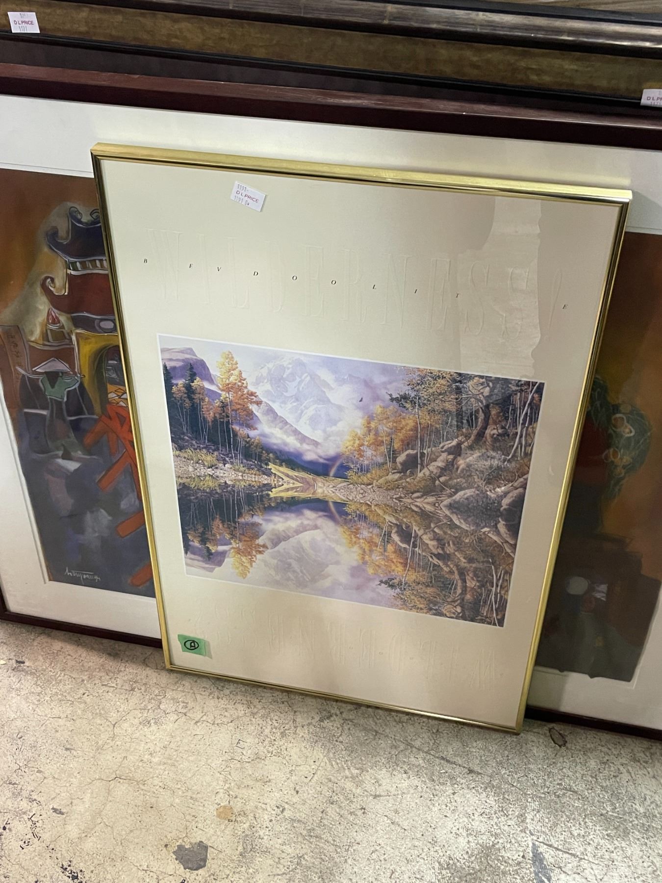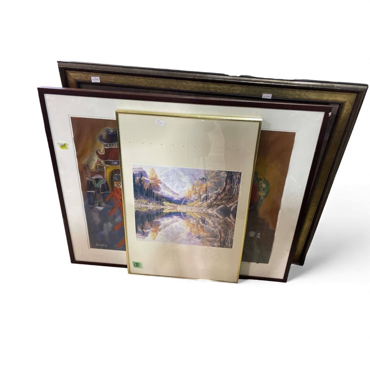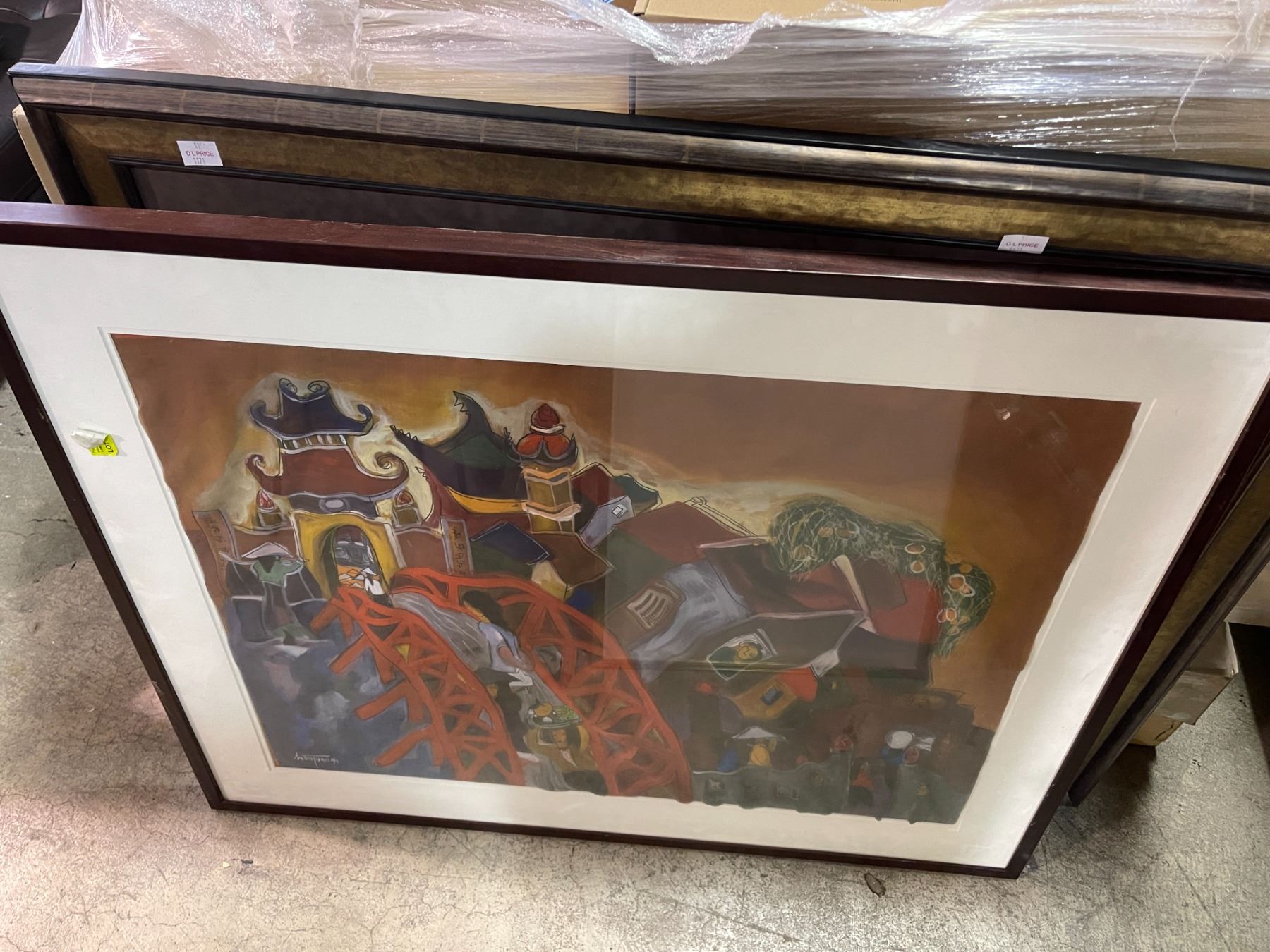 3 Framed Artworks: Abstract Village Scene and Landscape Themes