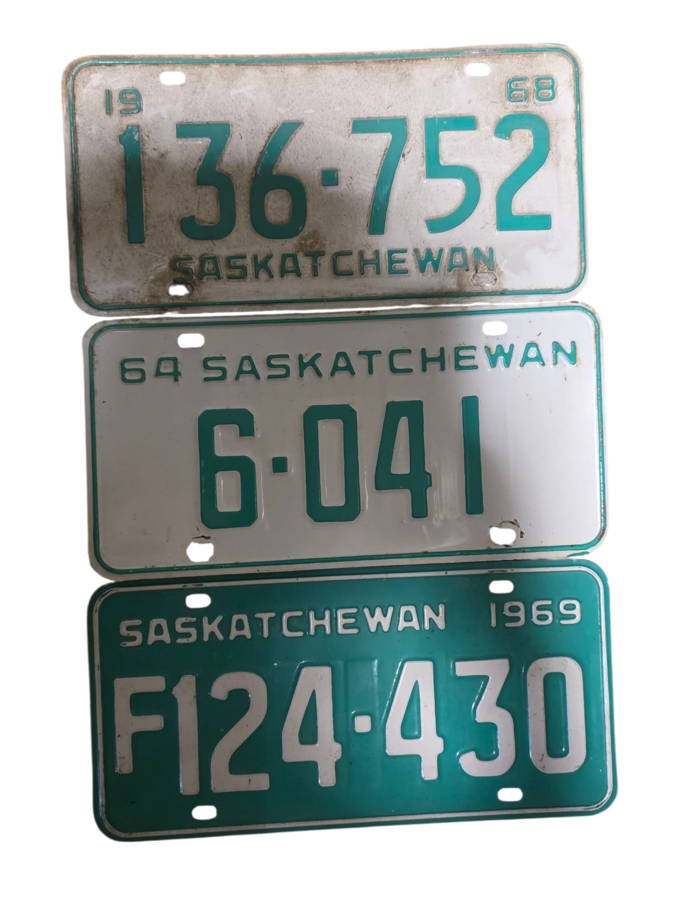 3 Saskatchewan 1960s Single License Plates - 1965 #139-752, 1964 #6-041, & 1969 #F124-430