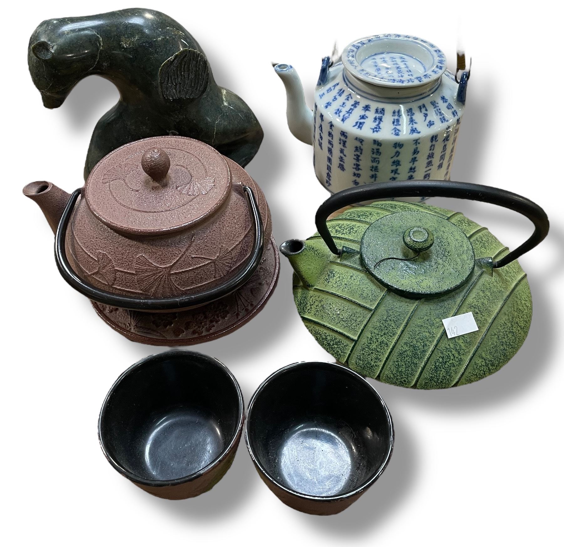 3 Teapots, 2 Cups and a Soapstone Bear with Chipped Ears