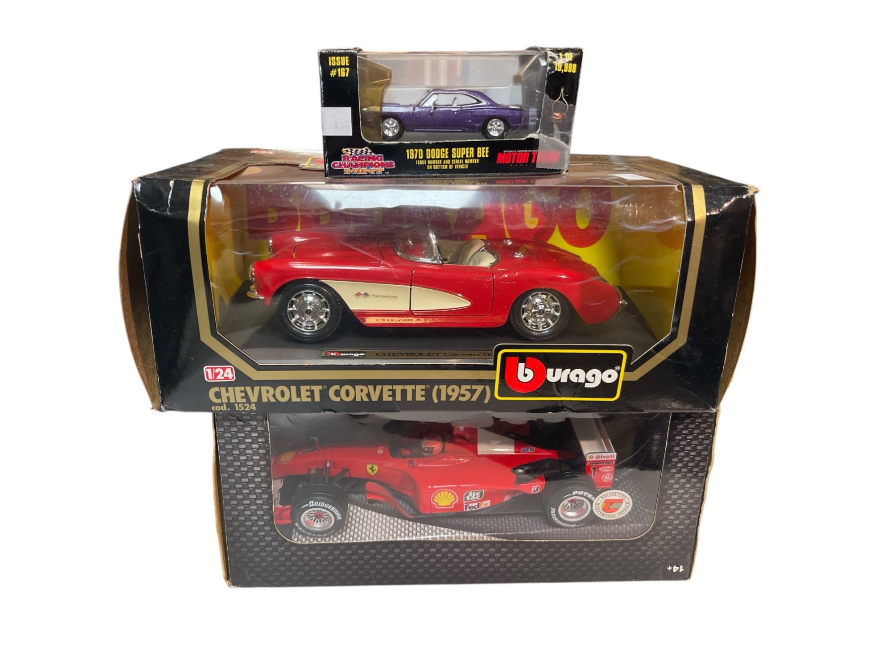 3x Collectible Cars: Burago Chevrolet Corvette (1957), 1970 Dodge Super Bee, & Hot Wheels Race Car