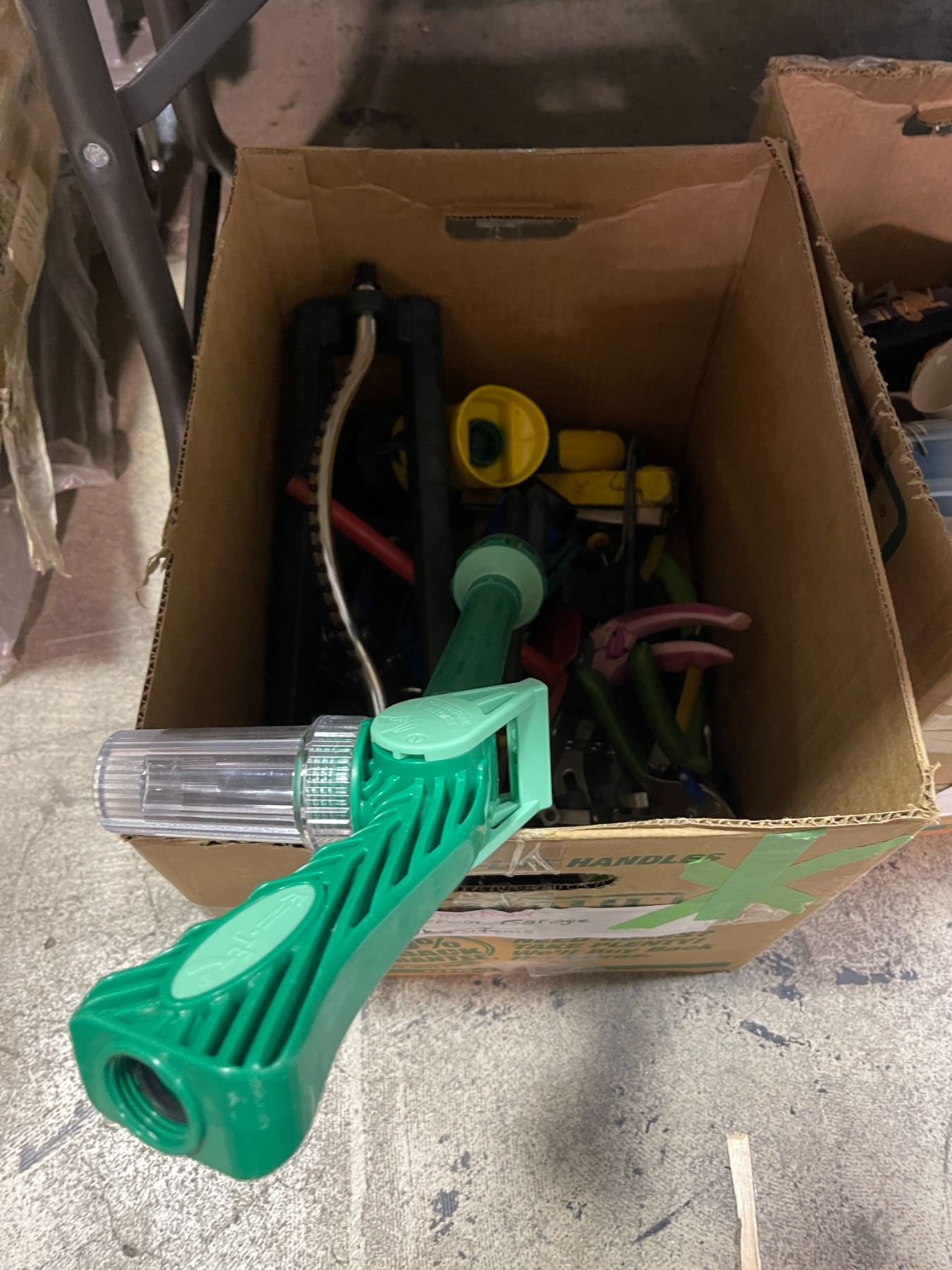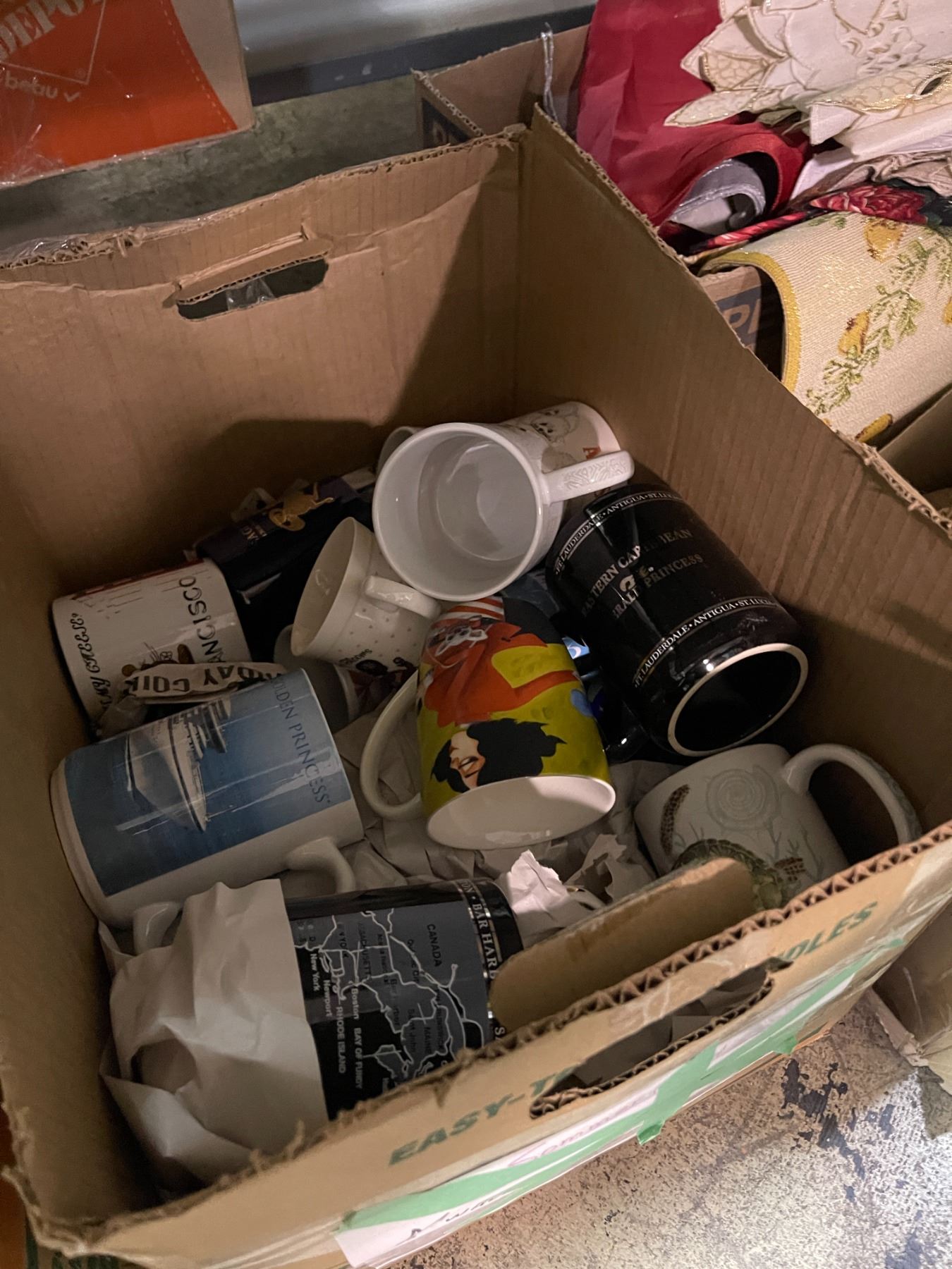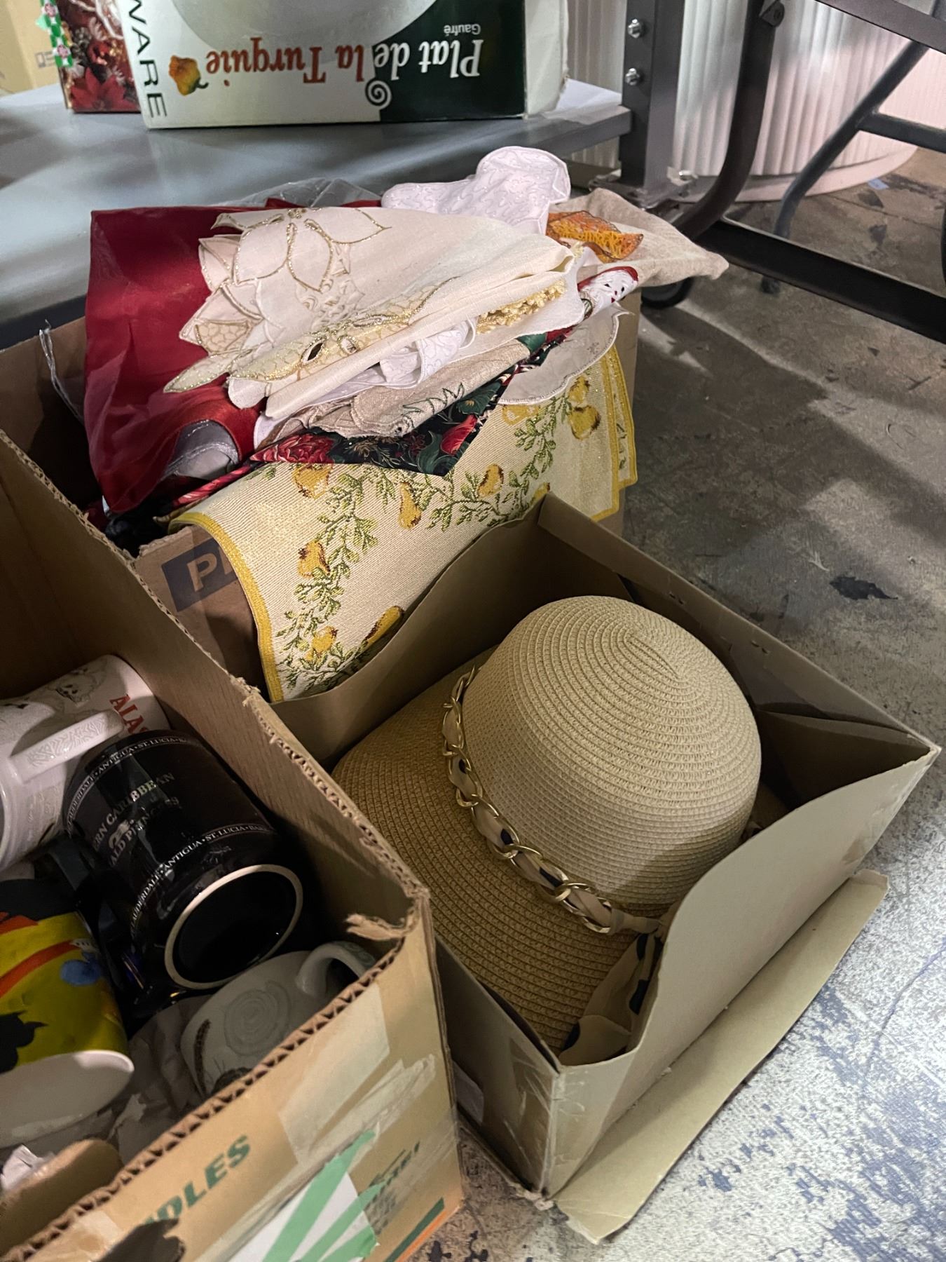 4 Boxes Mixed Household Items and Tools: Mugs, Tools, Linens, Hats and More