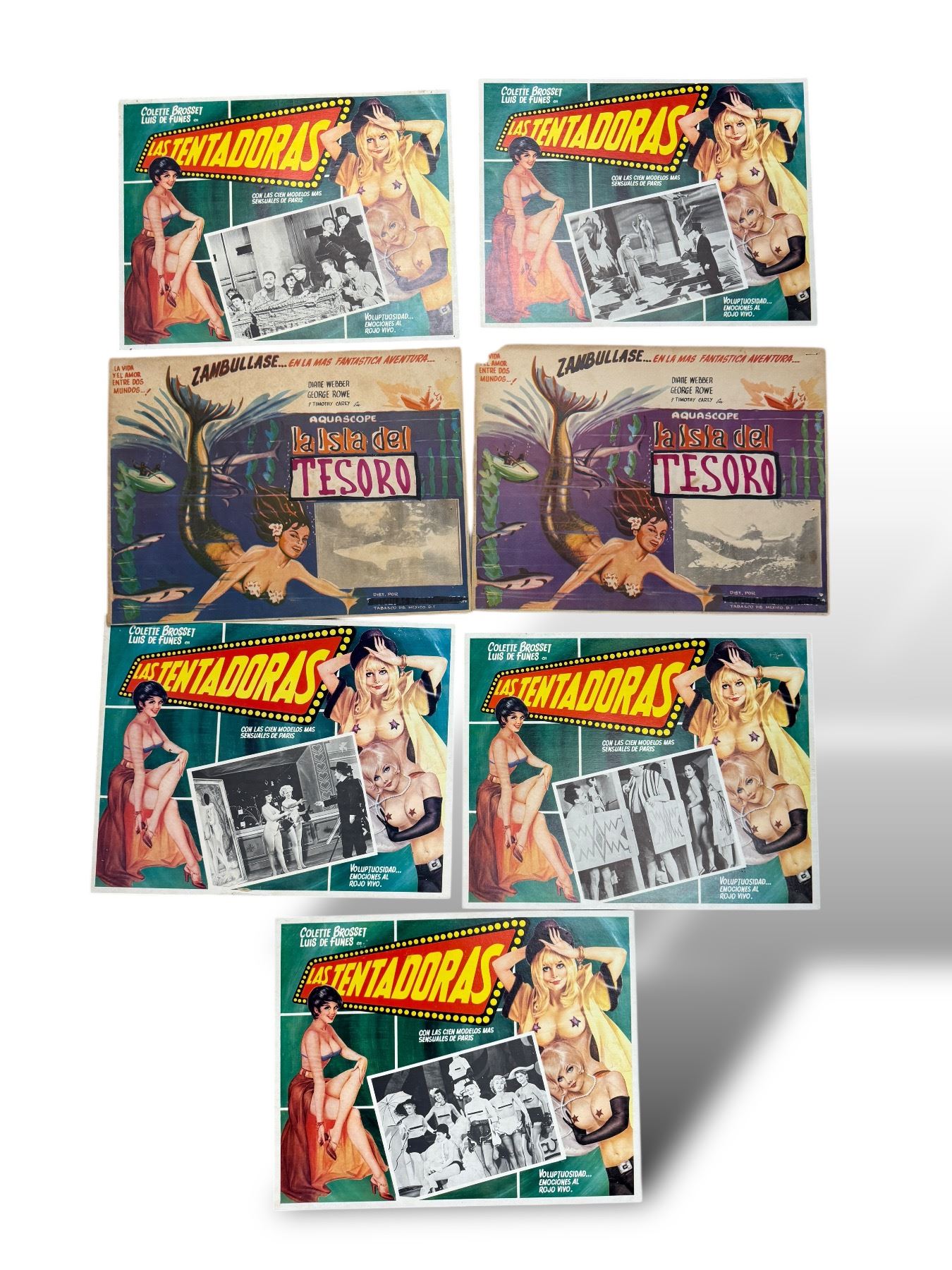 7x Vintage Spanish Movie Lobby Cards: La Isla Del Tesoro & Las Tentadoras