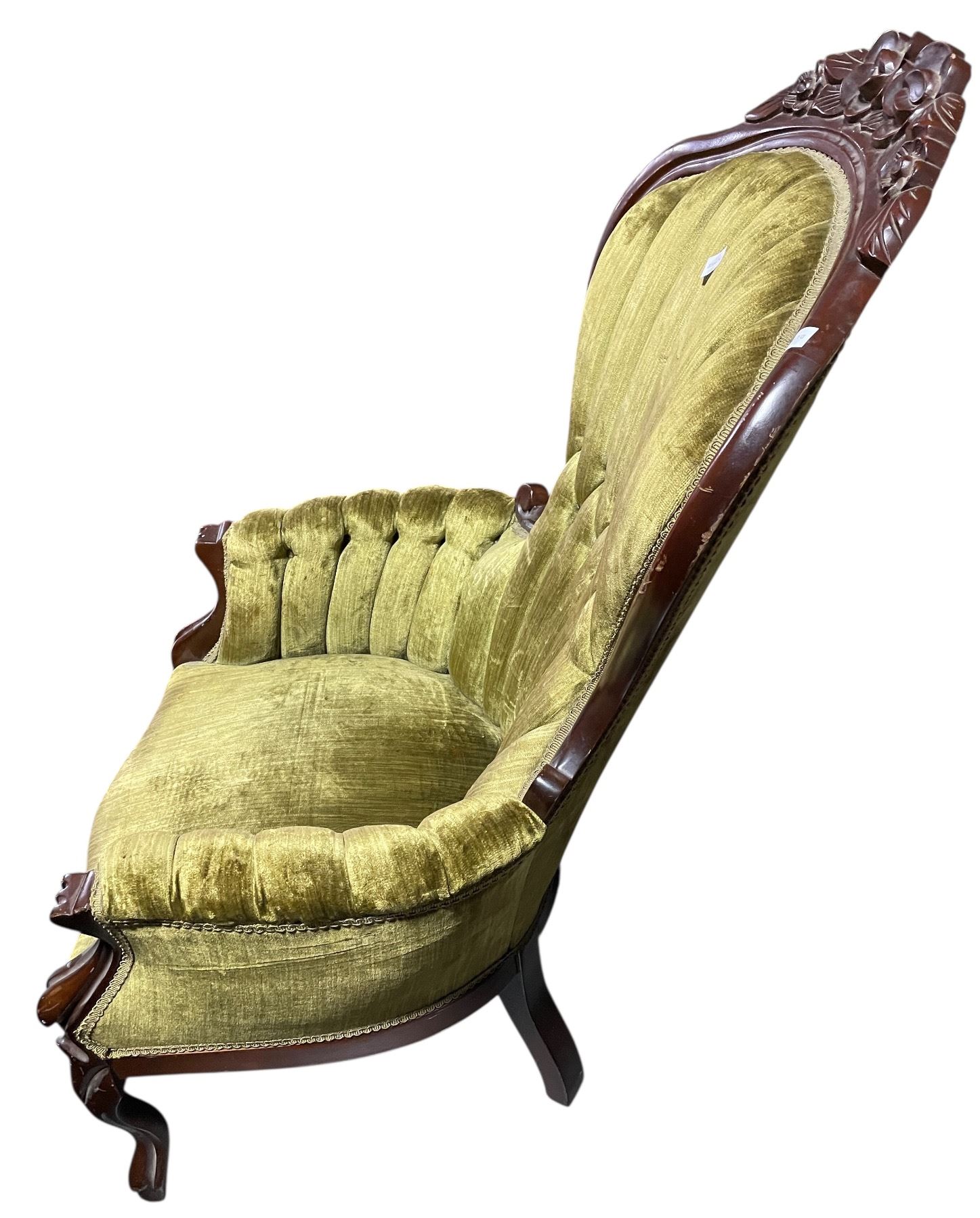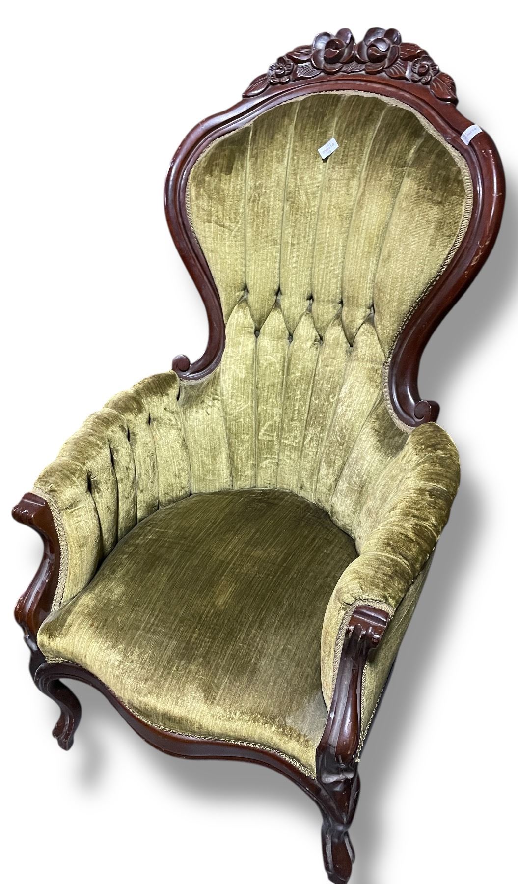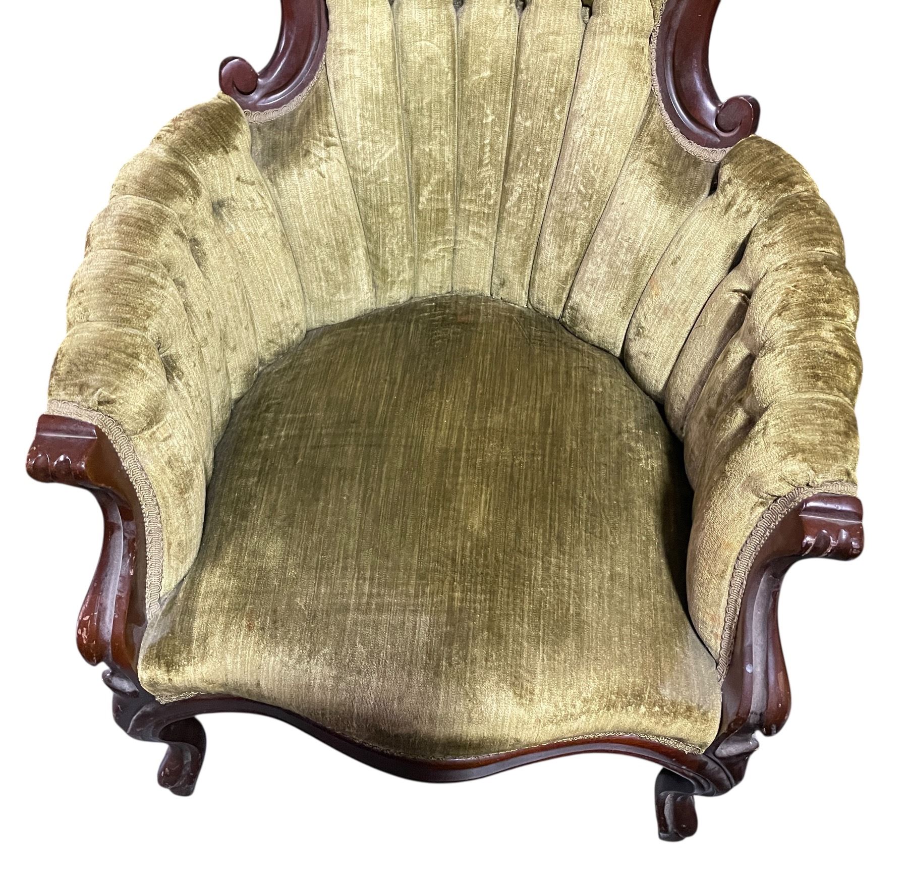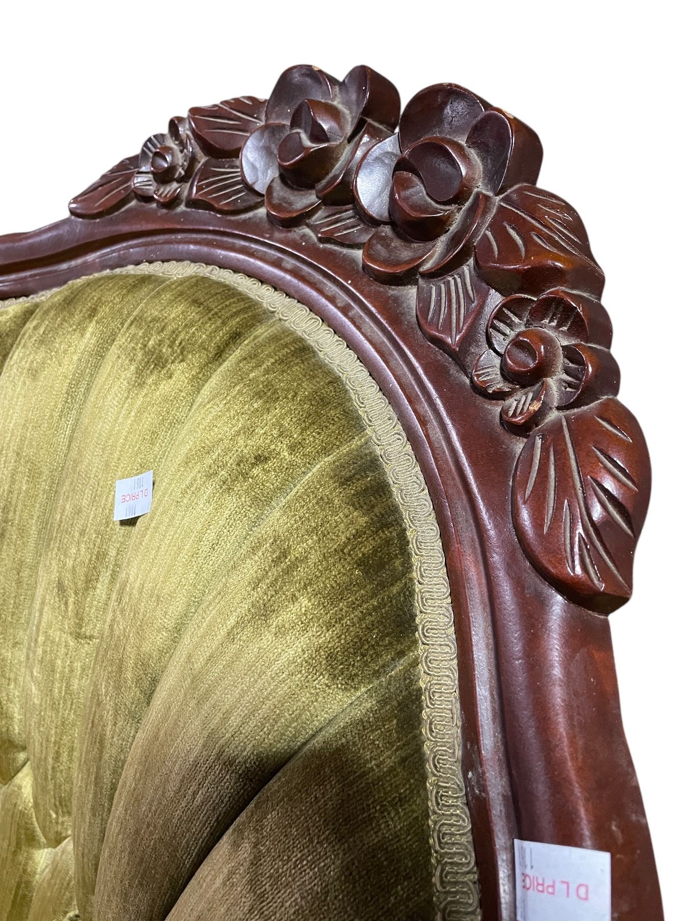 Antique Green Velvet Tufted Arm Chair with Carved Wood Frame