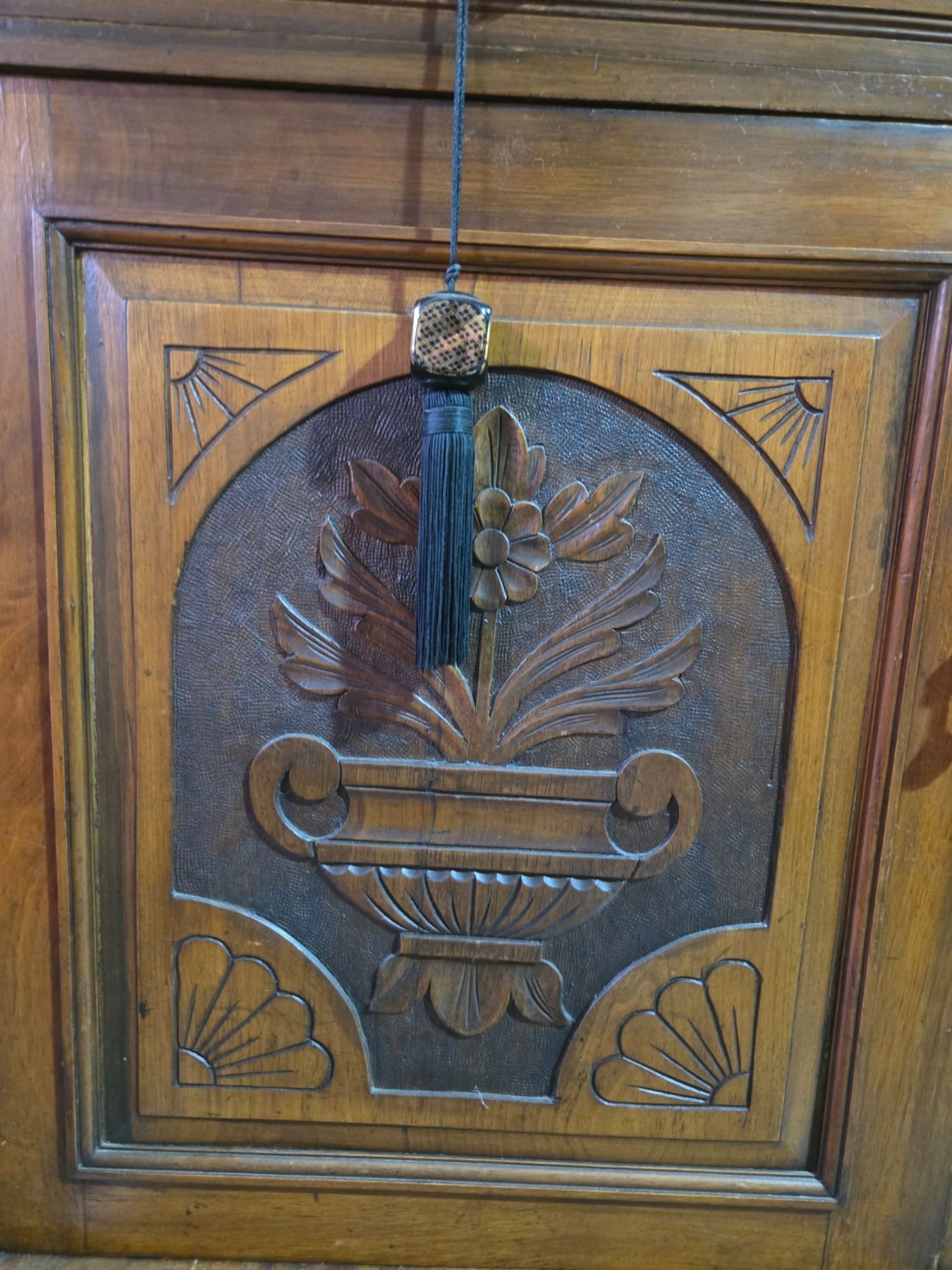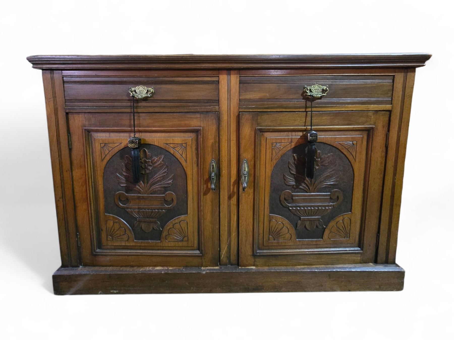 Antique Sideboard with Carved Door Panels - 18" x 52" x 35" tall - There are drapes inside the sideboard