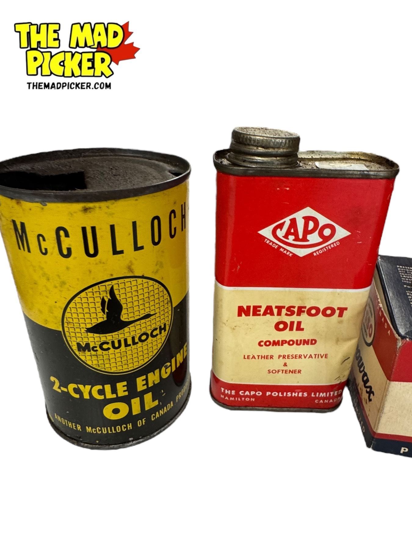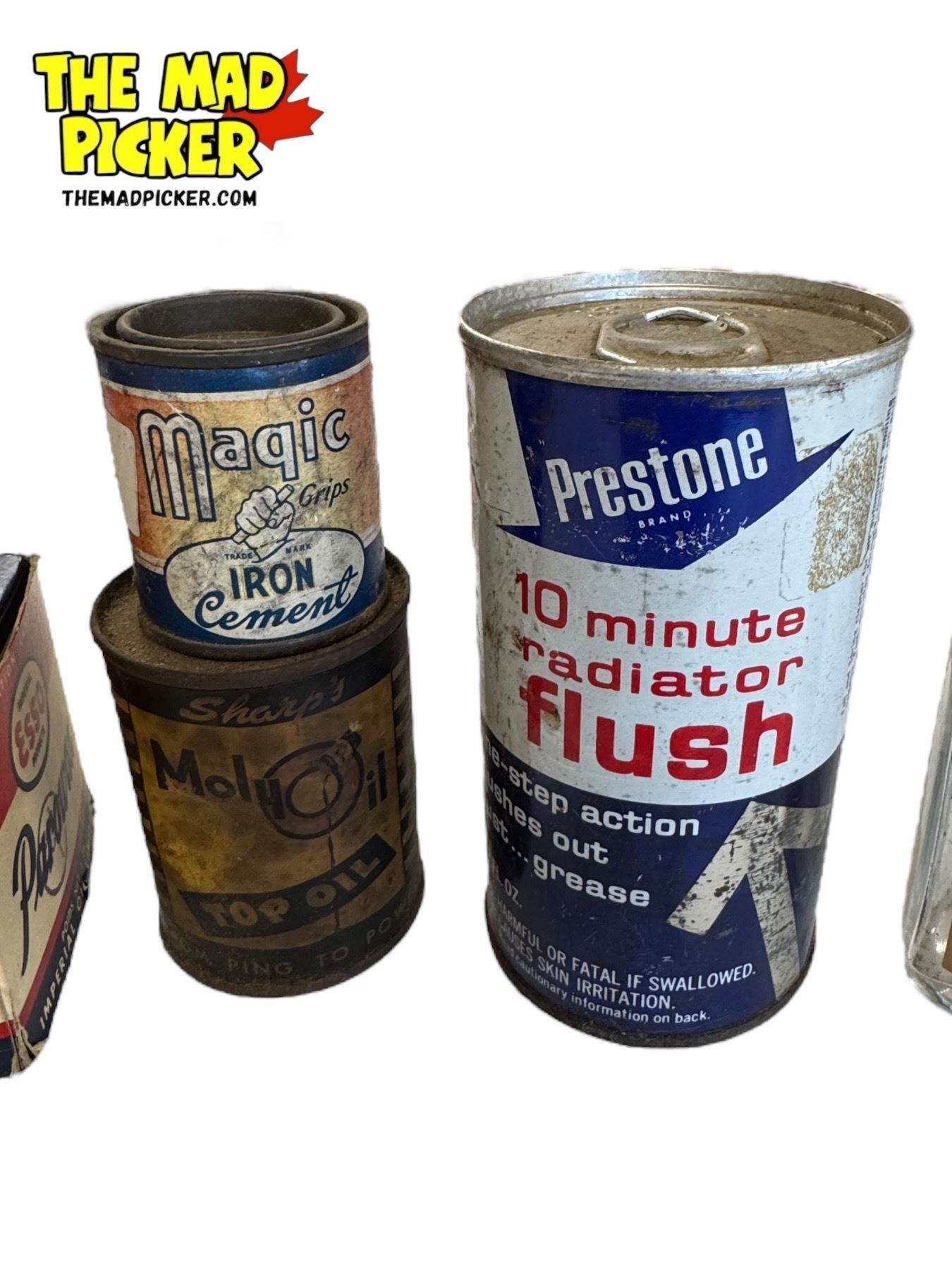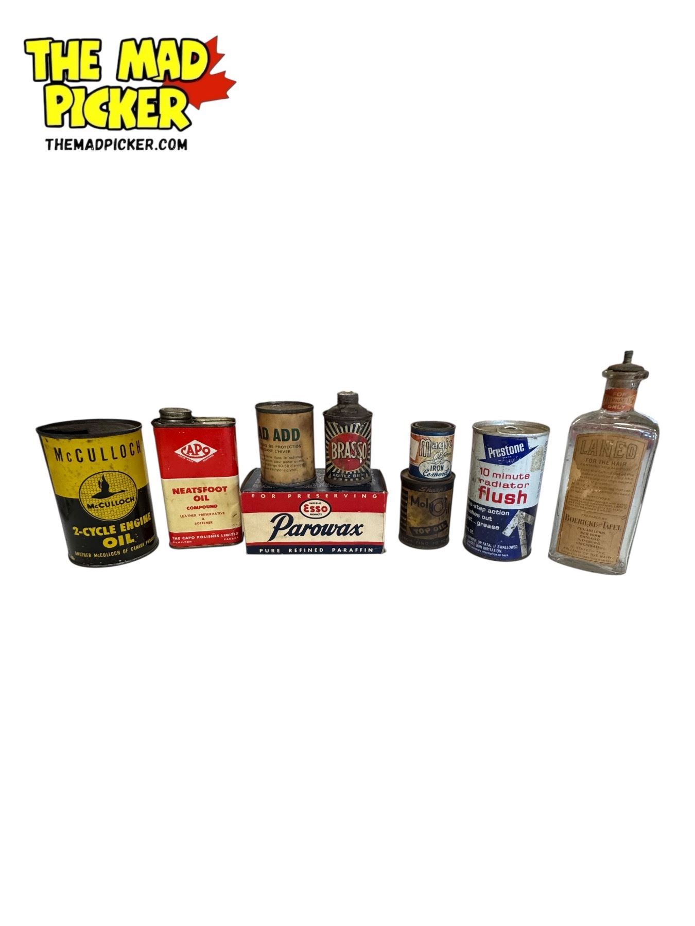 Assorted Vintage Tins: Prestone, Brasso, McCulloch, Capo, & More