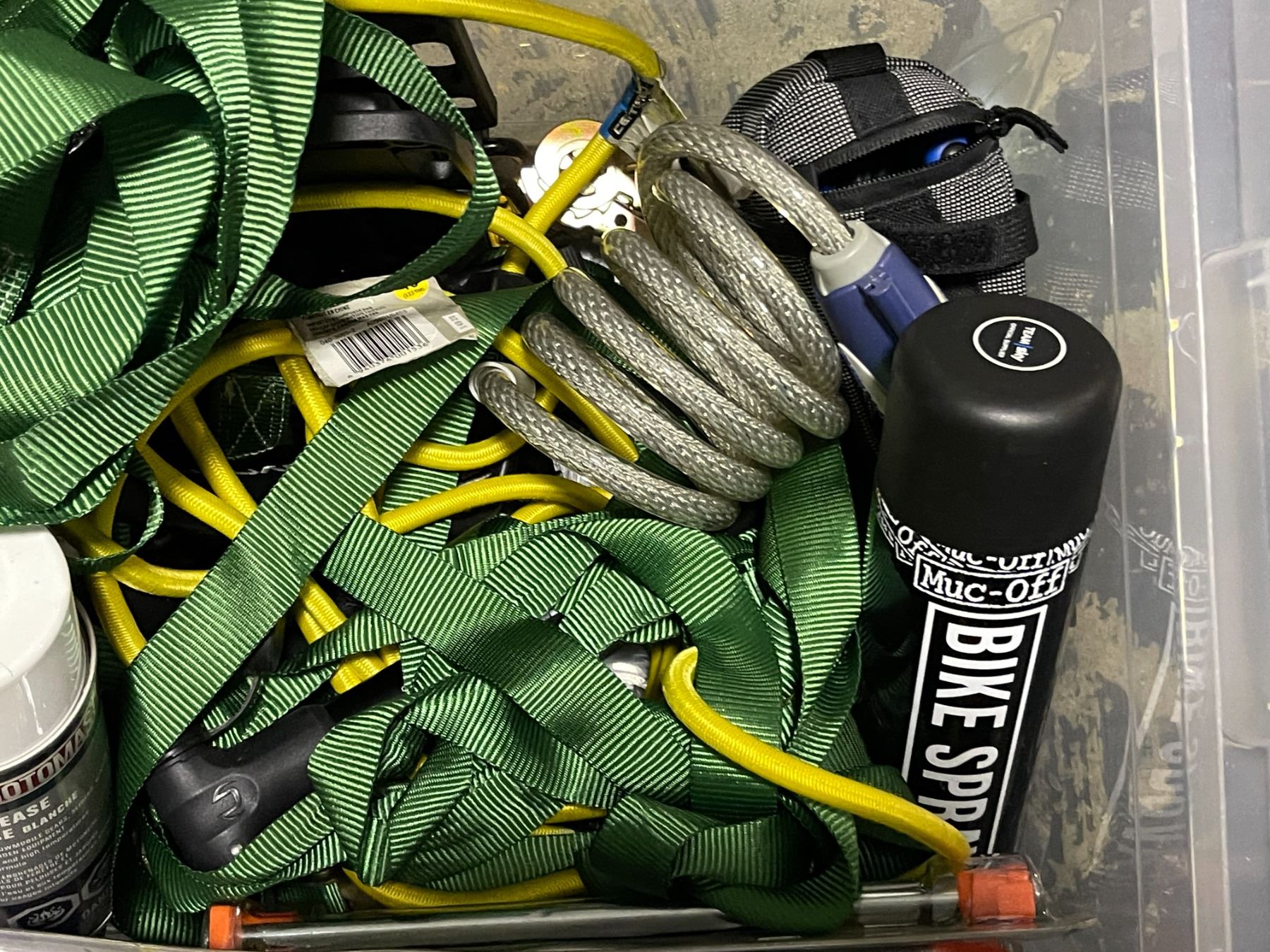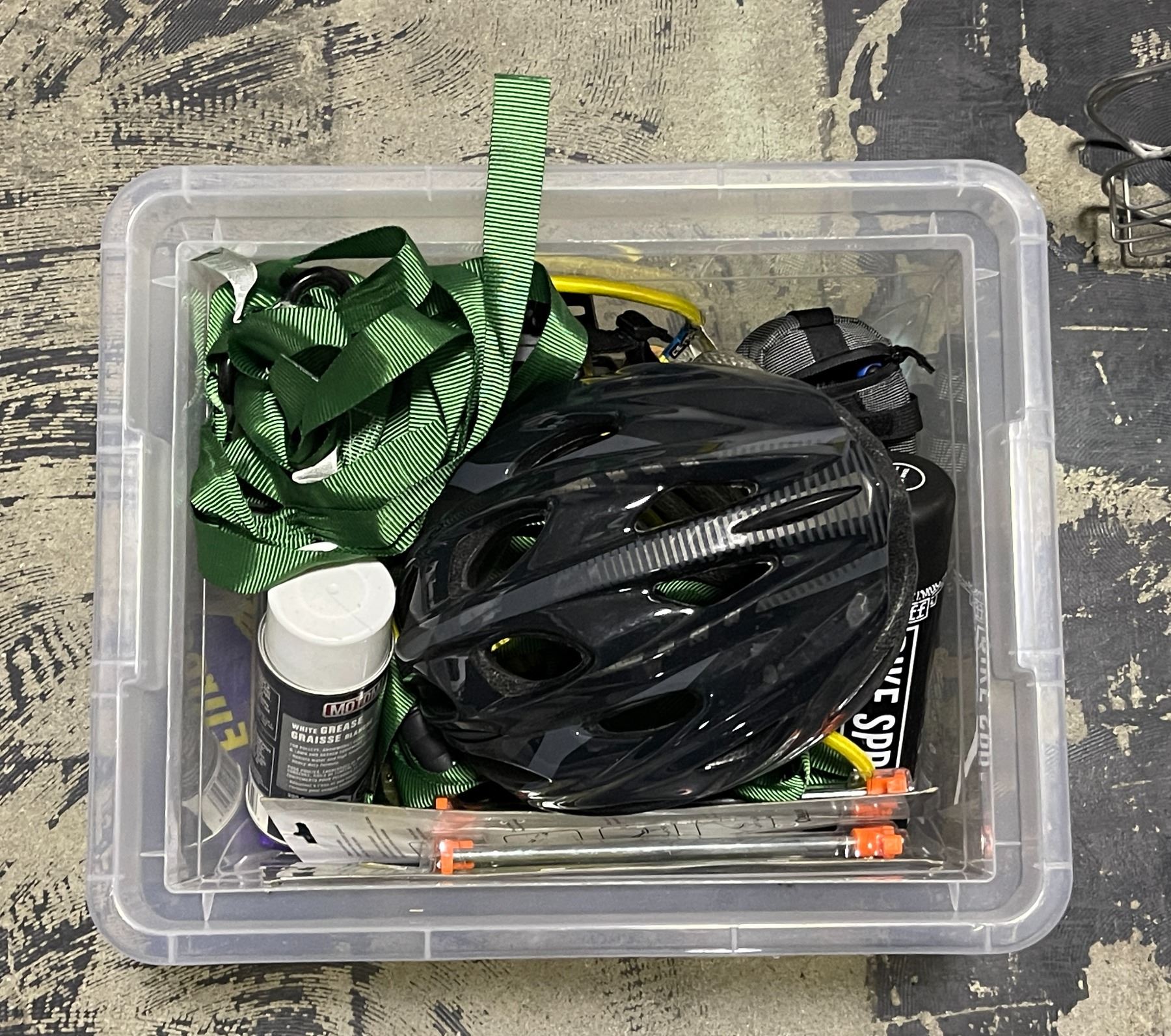 Bin lot - Bike helmet - bike cleaning spray - bike lock - misc bike tools & accessories