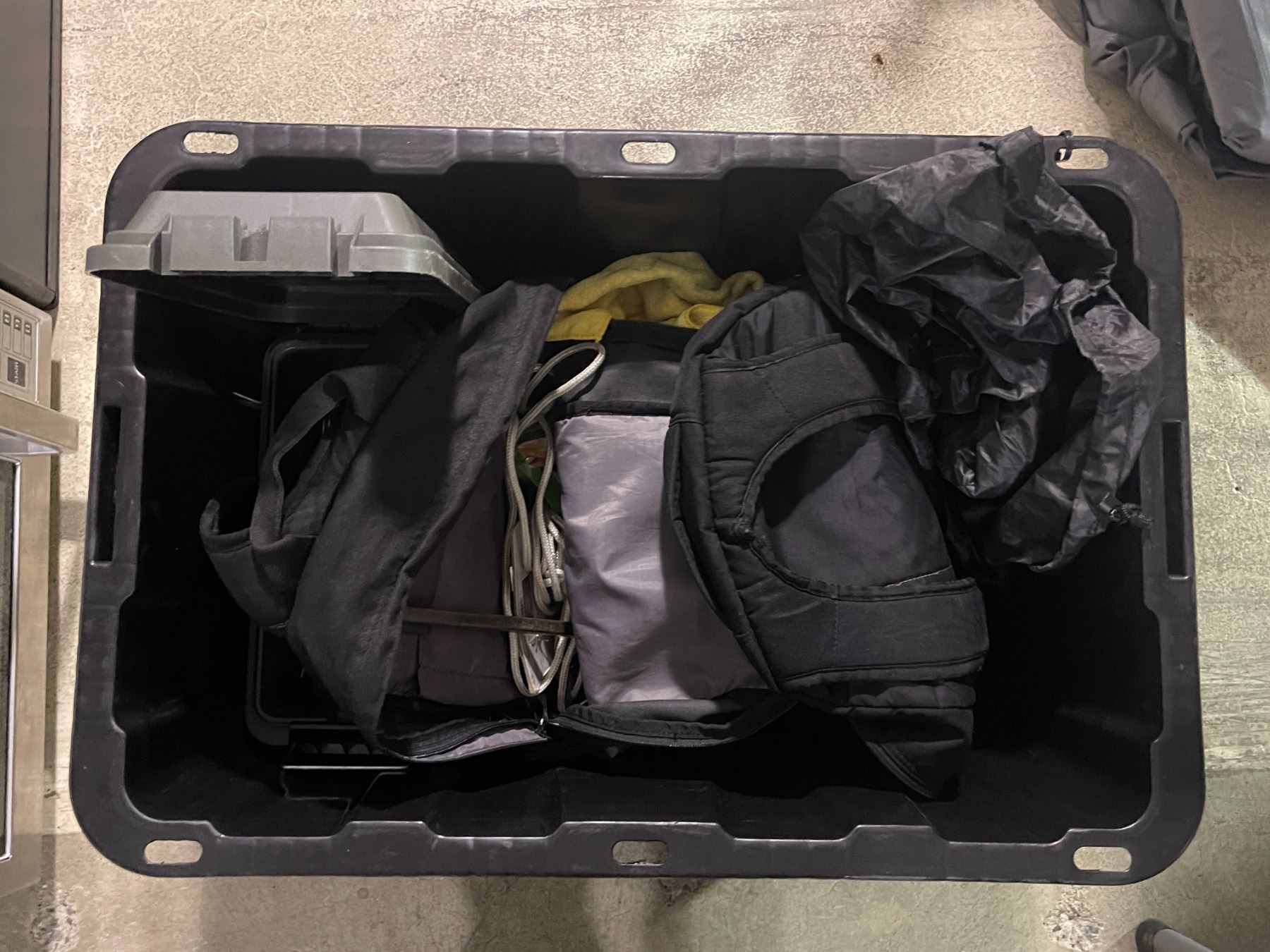 Bin lot - x2 backpacks w/ misc tools, prybar, plastic ammo box w/ misc tools and stainless cup