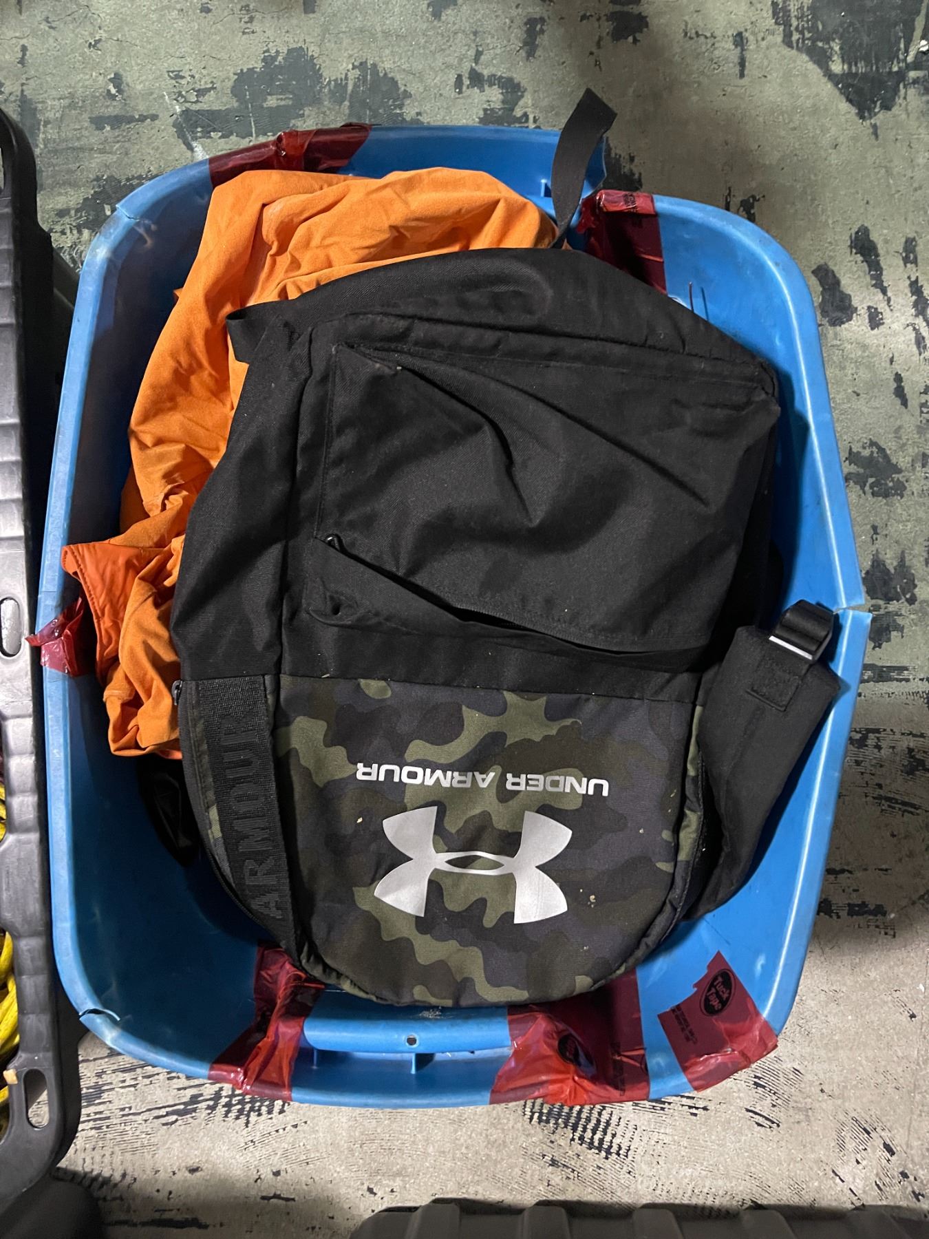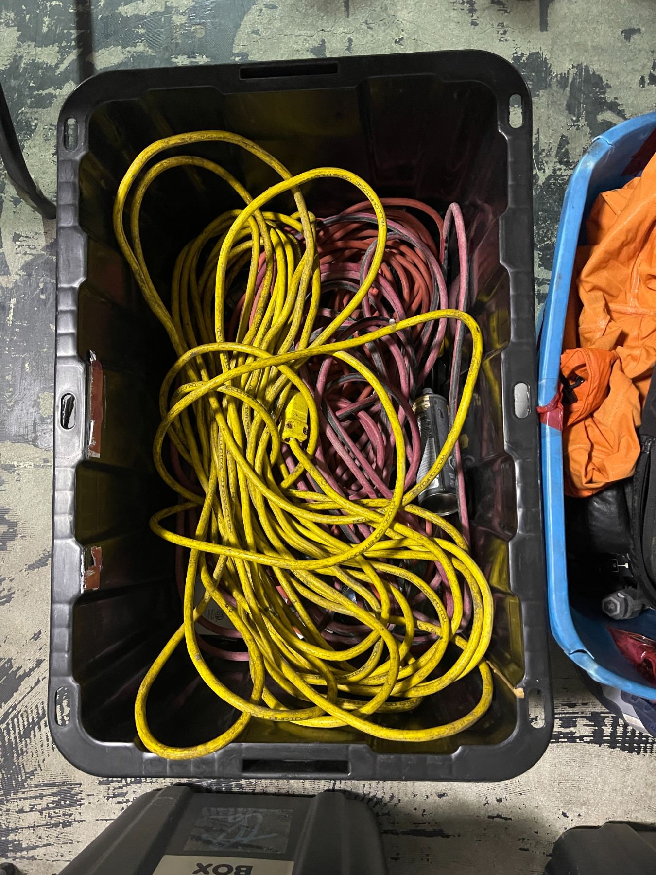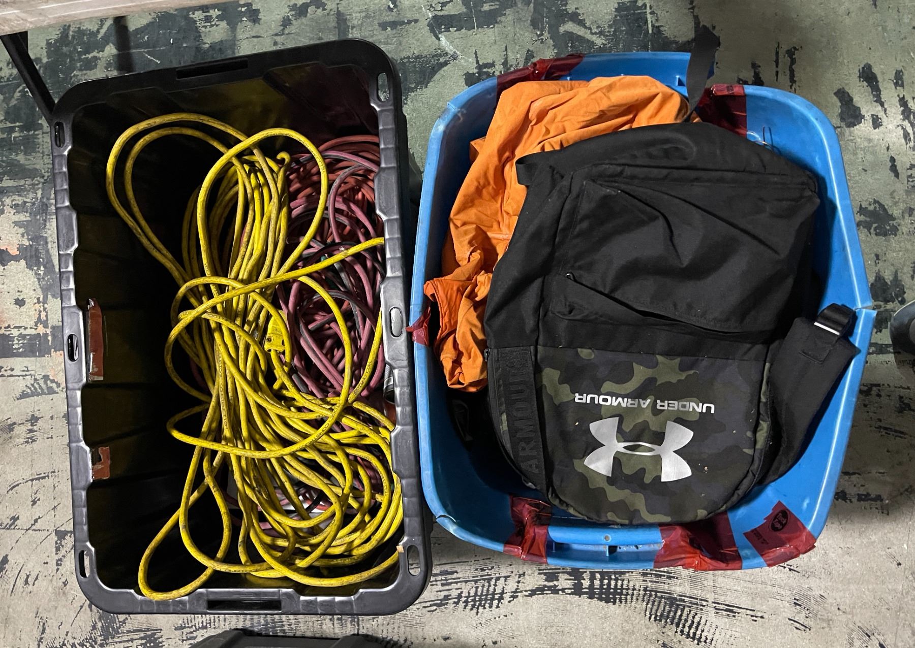 Bin lot - x2 bins containing extension cords, boat essentials kit, jackets, copper wiring , backpack
