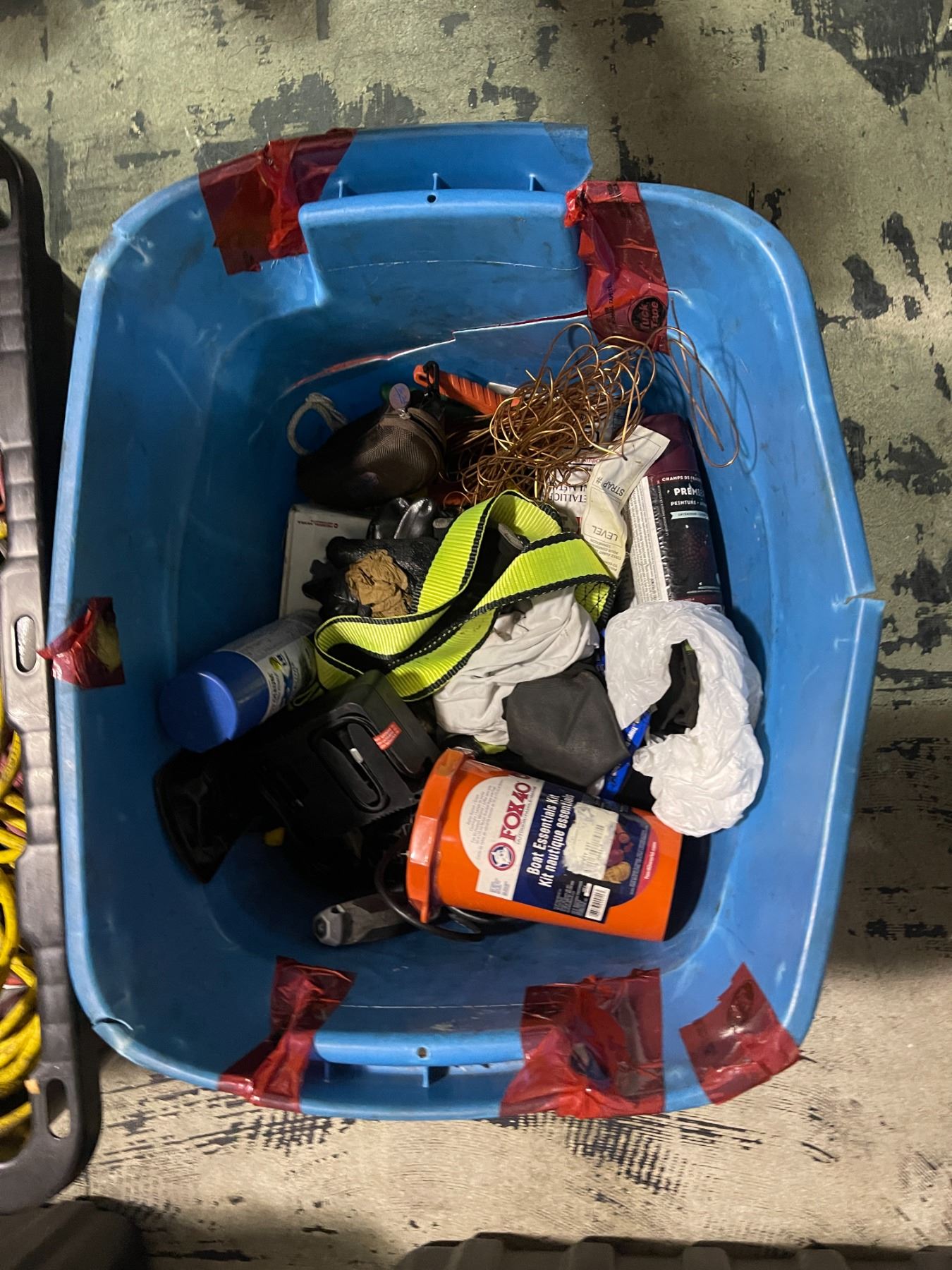 Bin lot - x2 bins containing extension cords, boat essentials kit, jackets, copper wiring , backpack, spray paint, mini air compressor