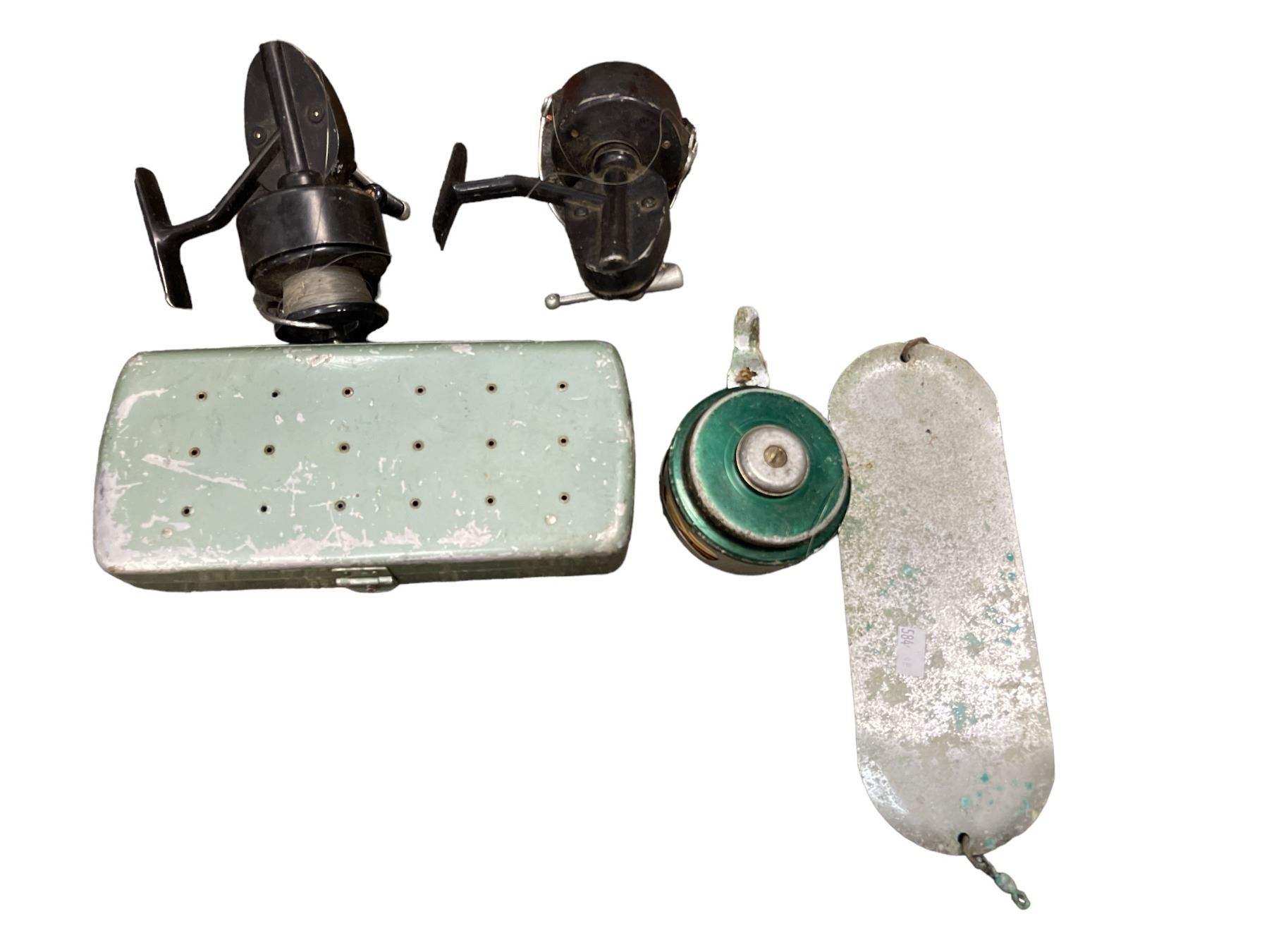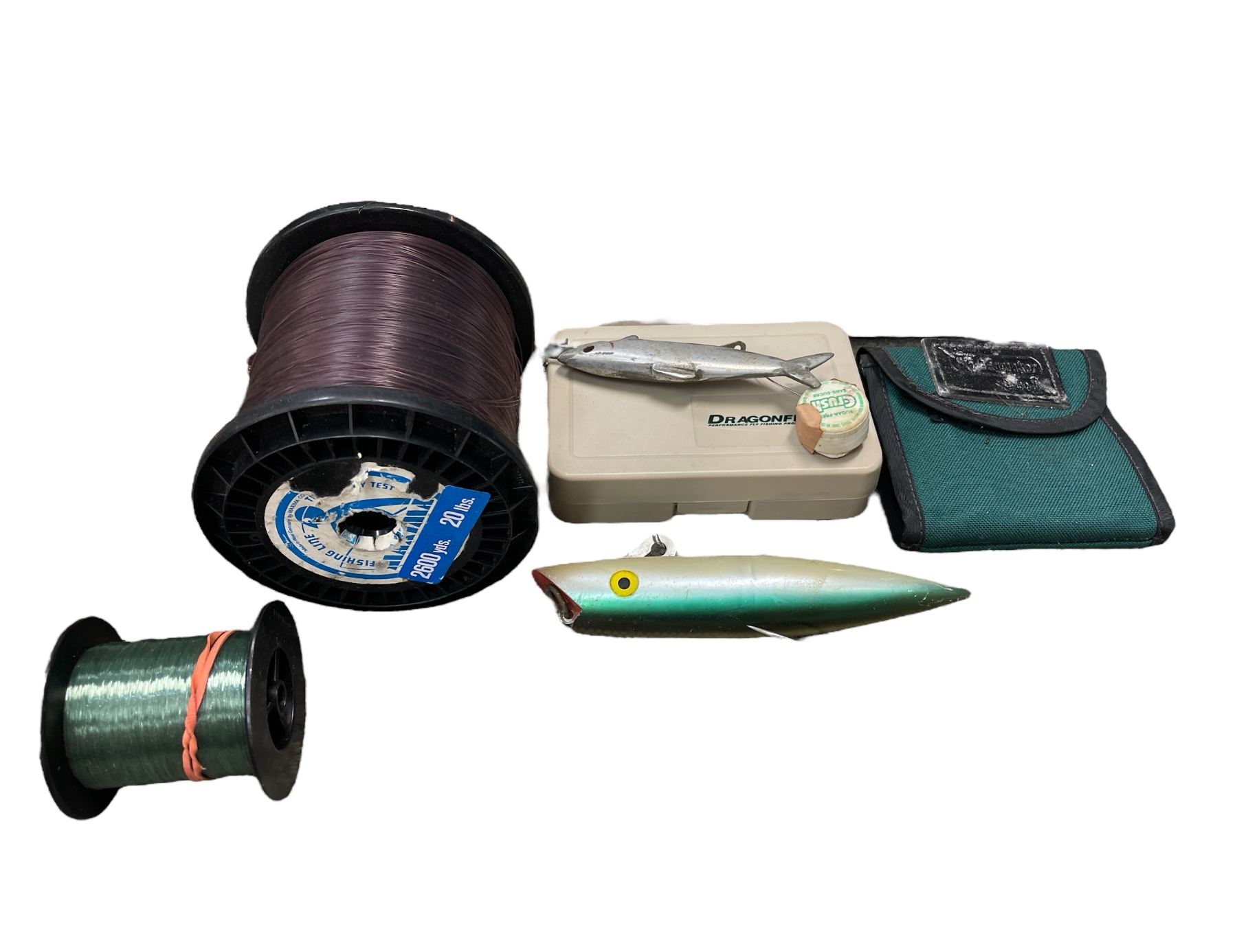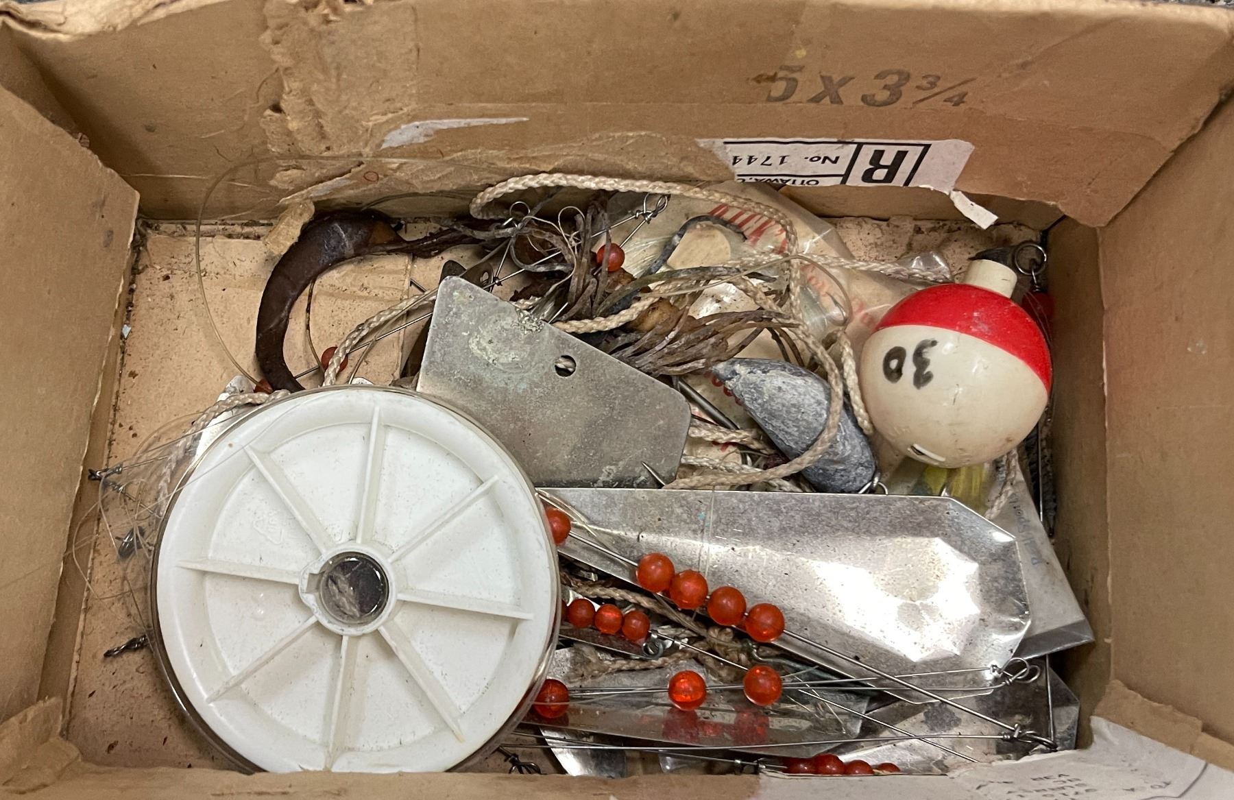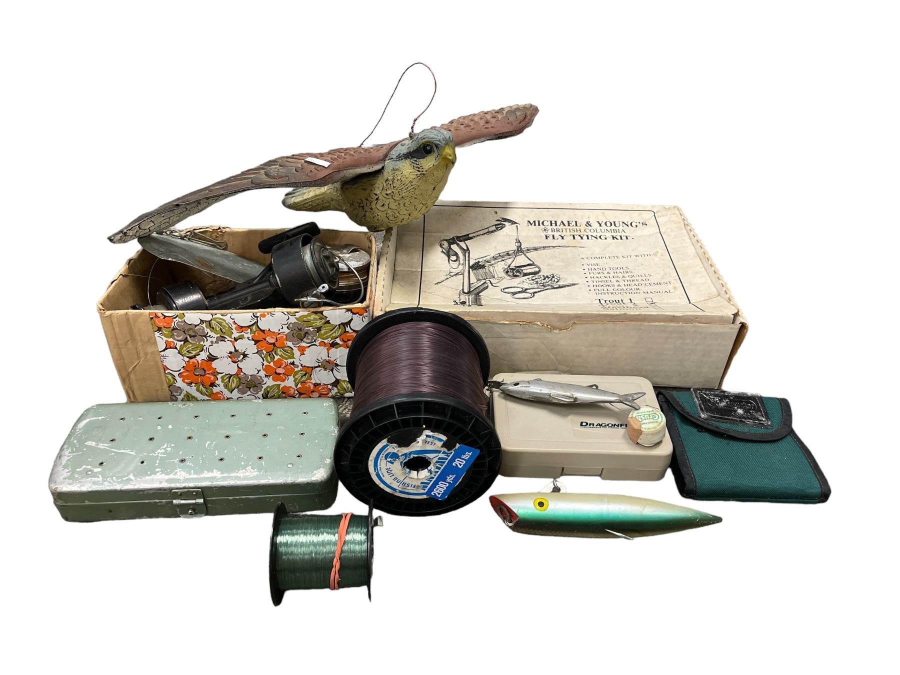 Box Full Of Fishing Equipment, Plastic Bird, Etc..