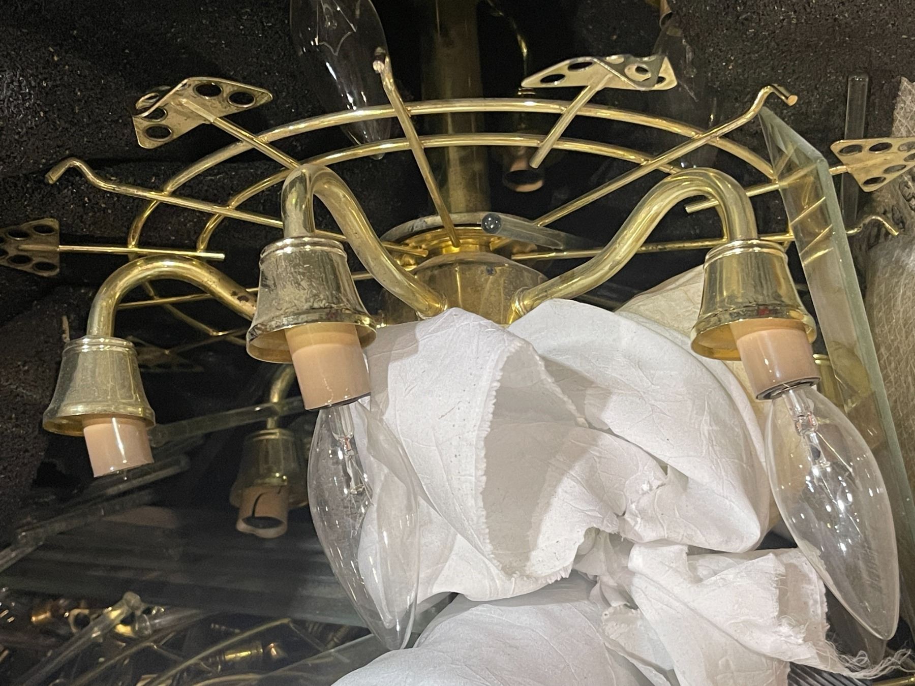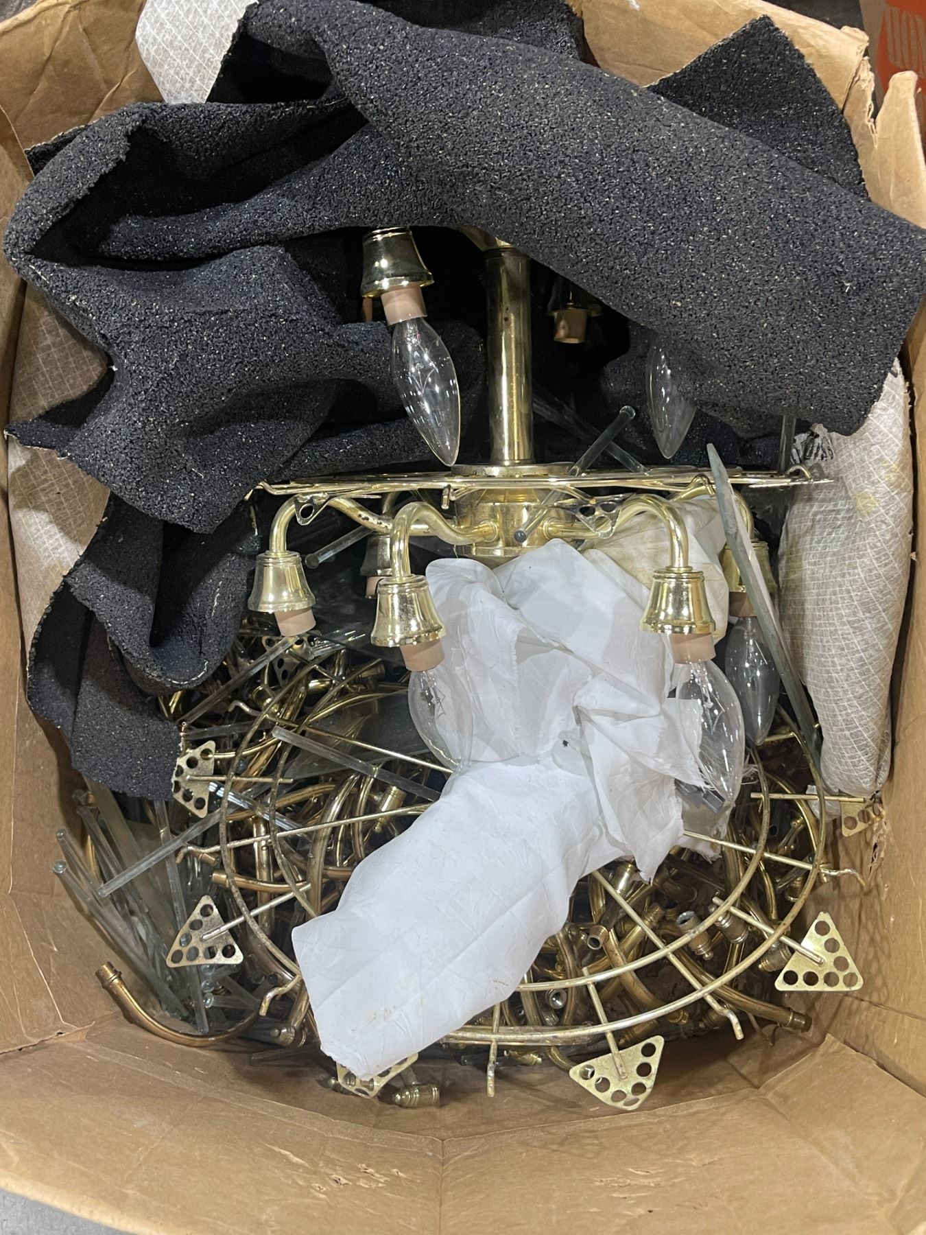 Box lot - box containing x3 chandeliers - brass w/ hanging glass pieces (May or may not be complete)