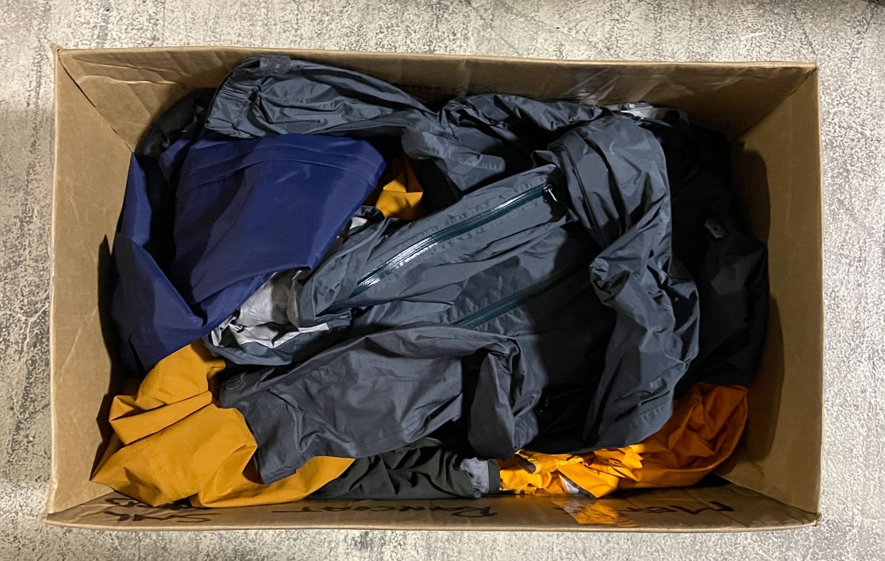 Box lot -x12 Mens Patagonia Raincoats - Approx Value : $1,800 - Dark Blue (M) w/tags - Dark Grey (M) - Dark grey (S) - Black (M) - Orange (S) - Blue (S) - Copper (L) - Green (M) - Blue (S) - Blue (M) - Green (S) w/tags - Green (M)