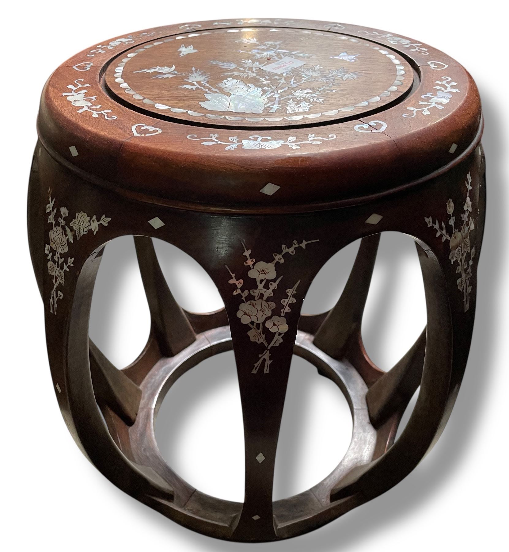 Chinese Solid Wood Drum Stool with Inlaid Design - 18" tall x 16" diameter
