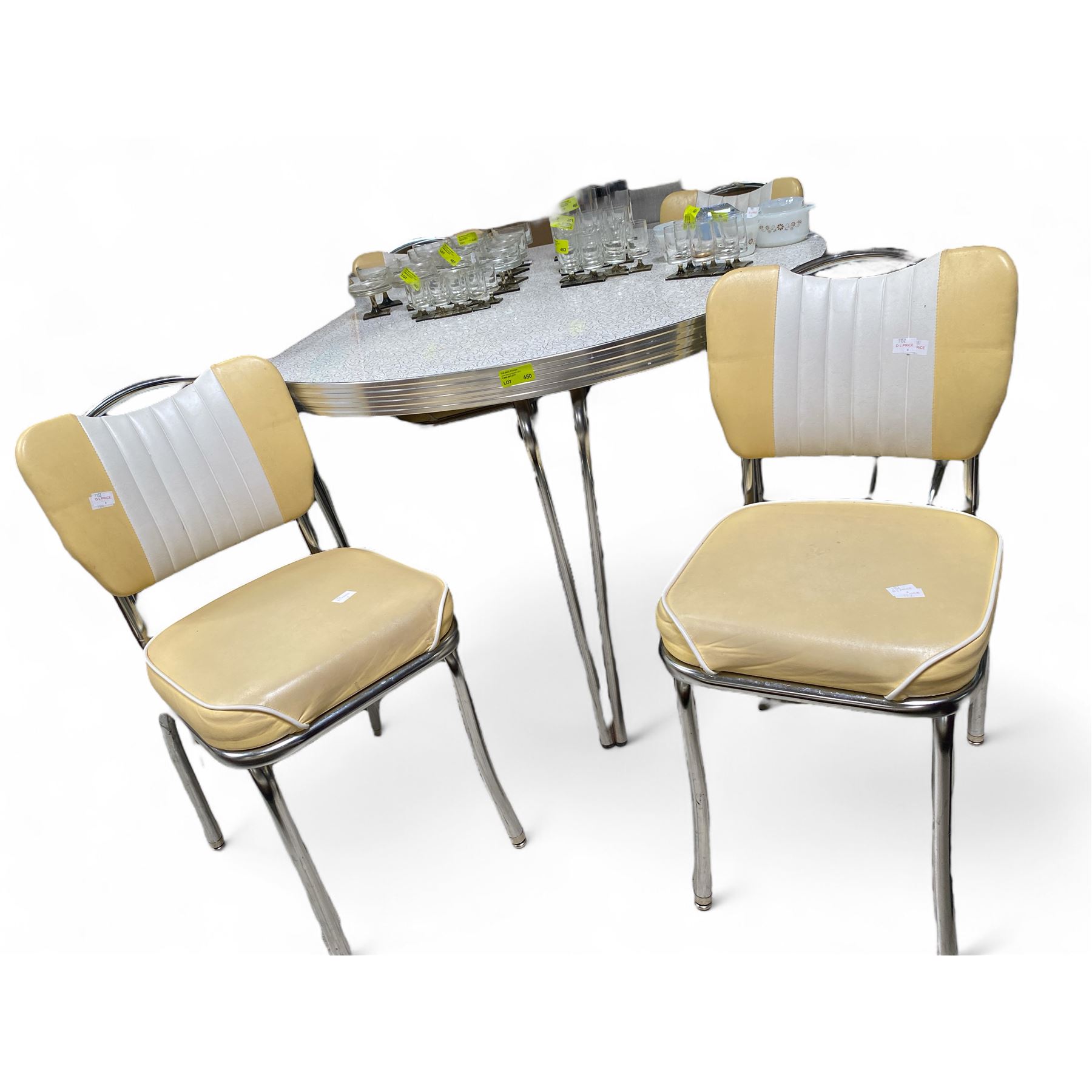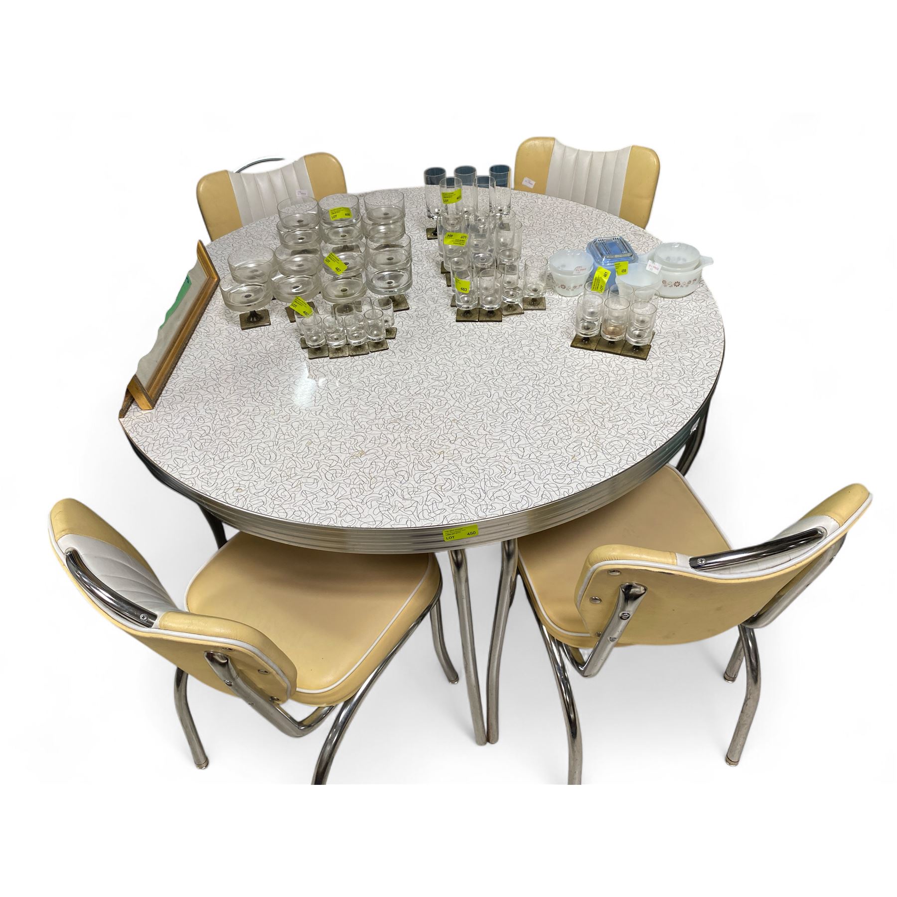 Chrome Dining Table & with 4 Yellow/White Chairs - White & Black Design 48" Table Top - Contents not included.