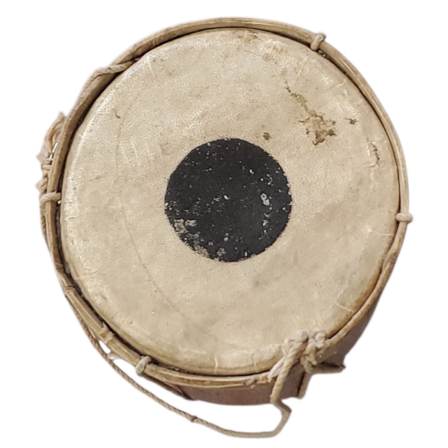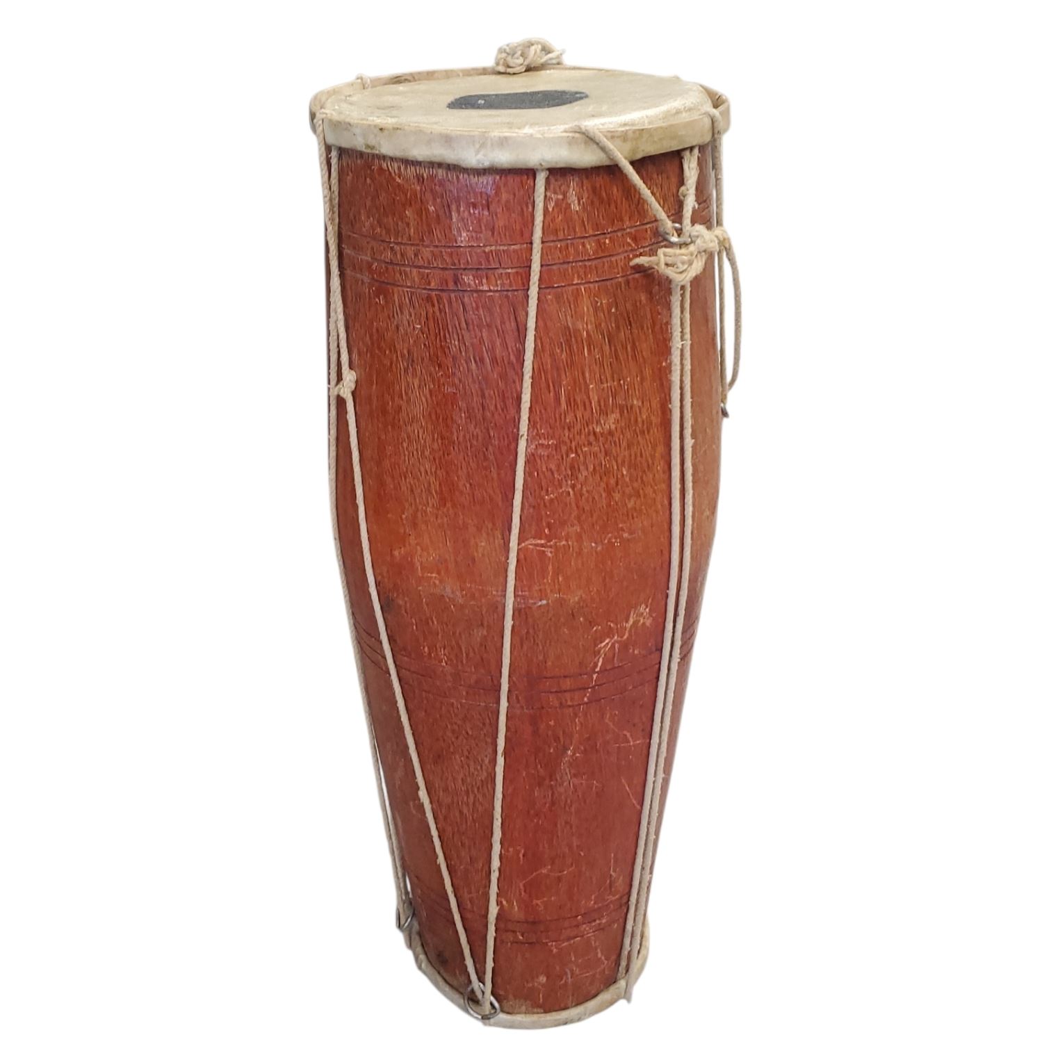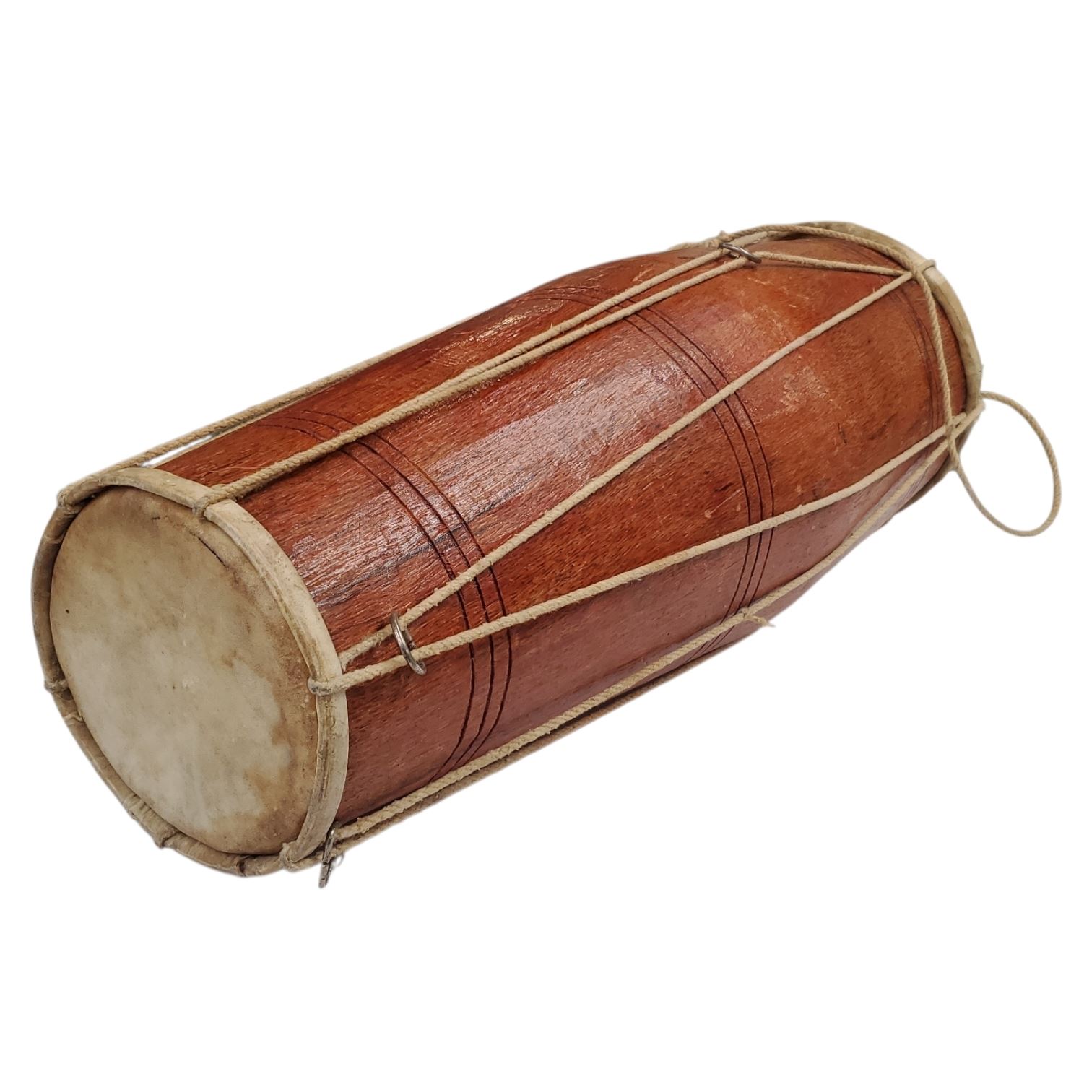 Barrel-shaped traditional Dholak, used in South Asian music, weddings, and festivals. Made with a wooden shell, typically Sheesham or Mango wood. Features two goat or buffalo skin heads secured with cotton rope lacing. Smaller head creates sharp notes, while larger head provides bass tones.