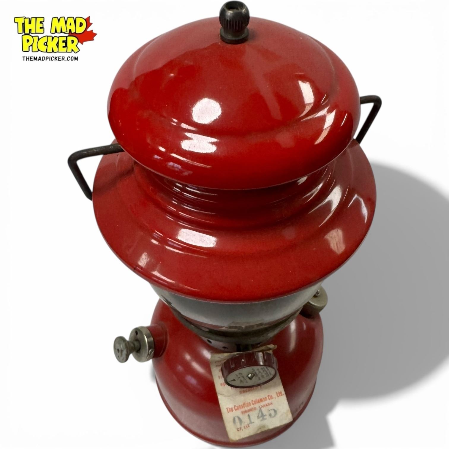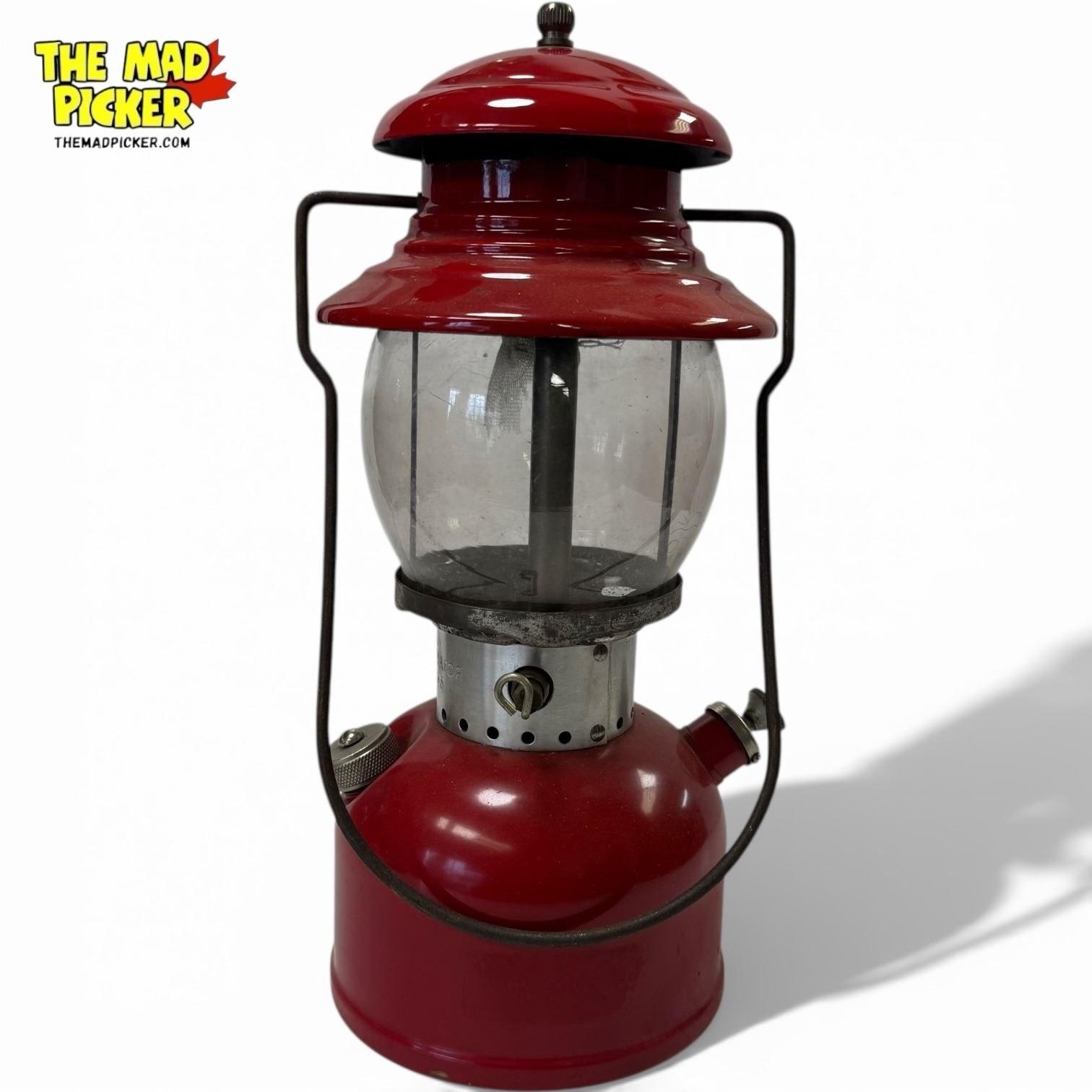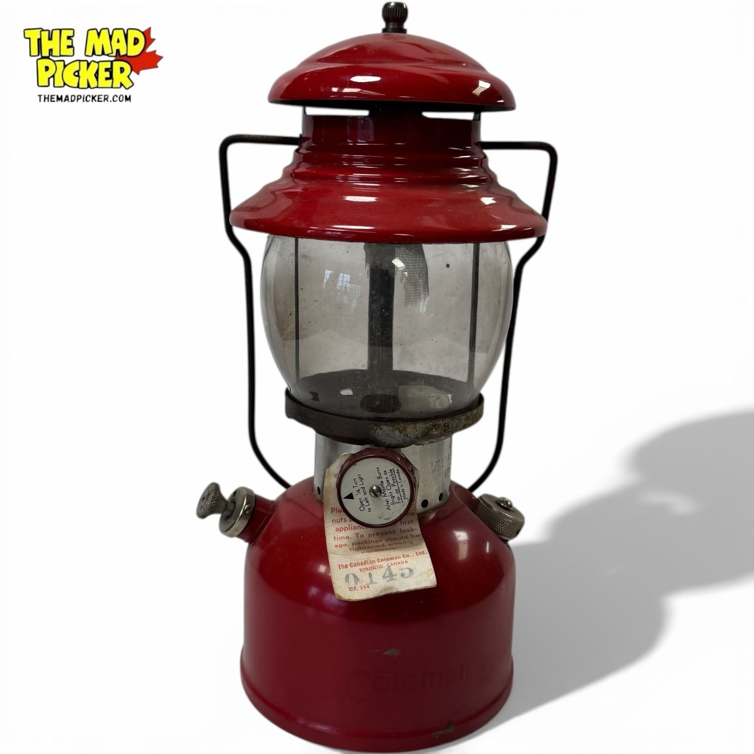 Coleman Model 200 single mantle lantern manufactured in 1962 in the USA. Features a distinctive red fount and ventilator, brass components, and a globe for light diffusion. Designed for outdoor use, this model is renowned for its reliability and classic design.