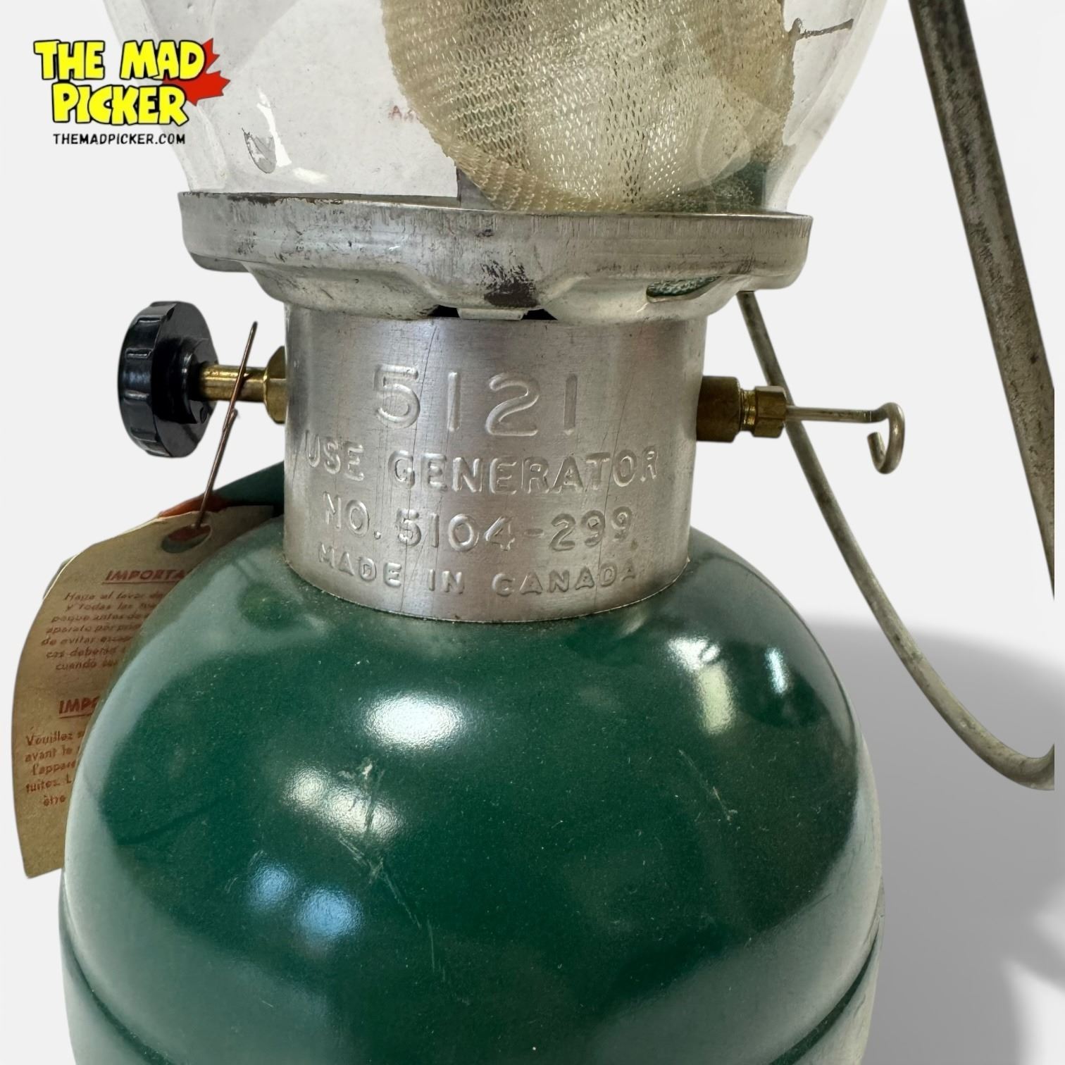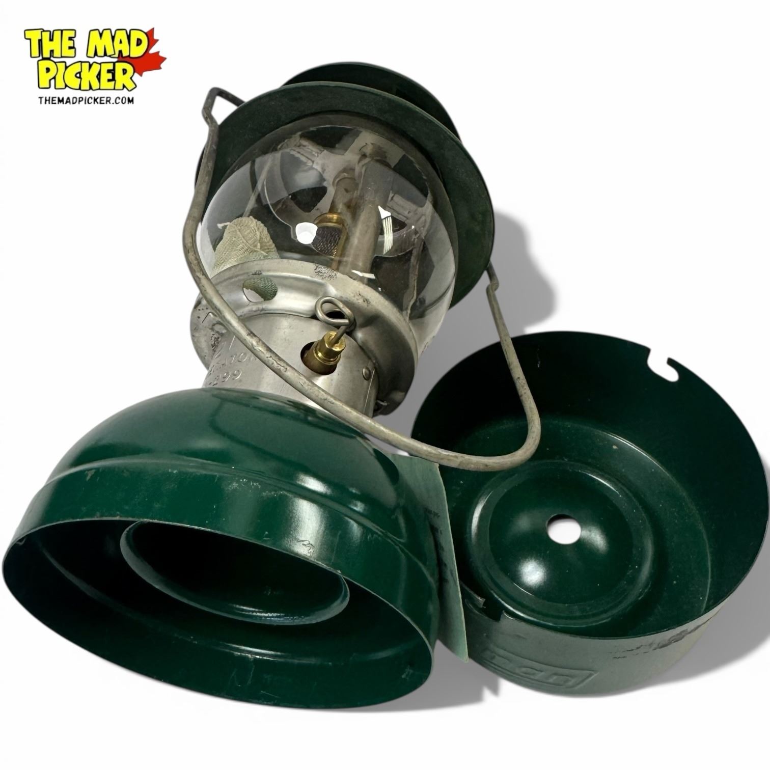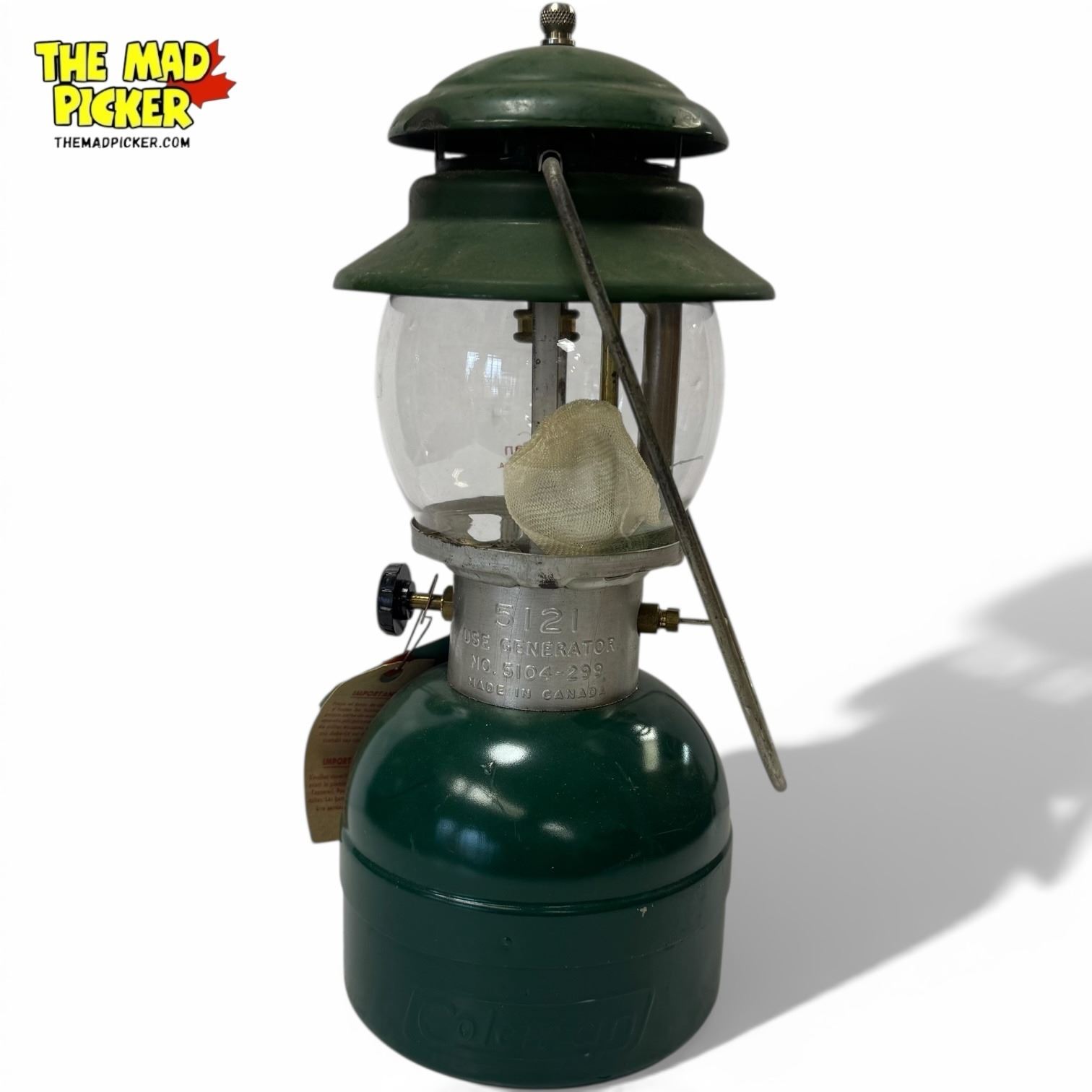 Coleman Model 5121 green single mantle propane lantern, ideal for camping and outdoor use. Manufactured with durable materials. Features an adjustable brightness control and easy ignition. Works with standard propane cylinders. Compact and portable design.