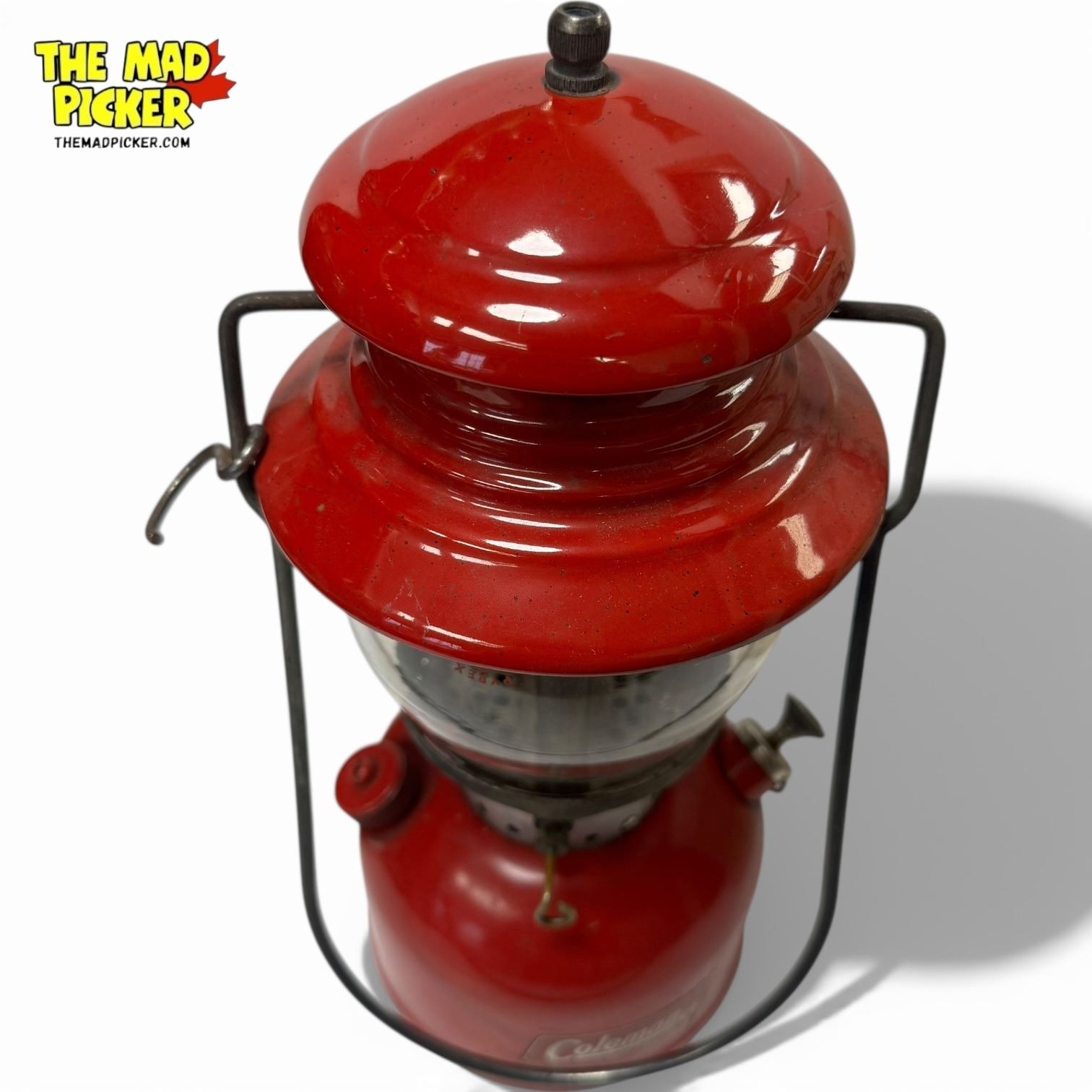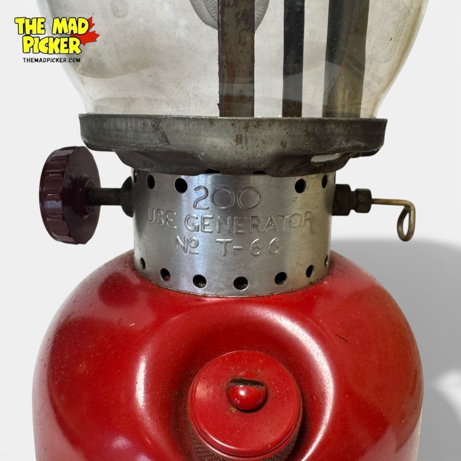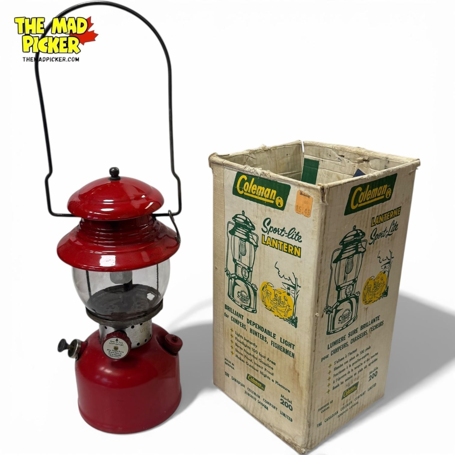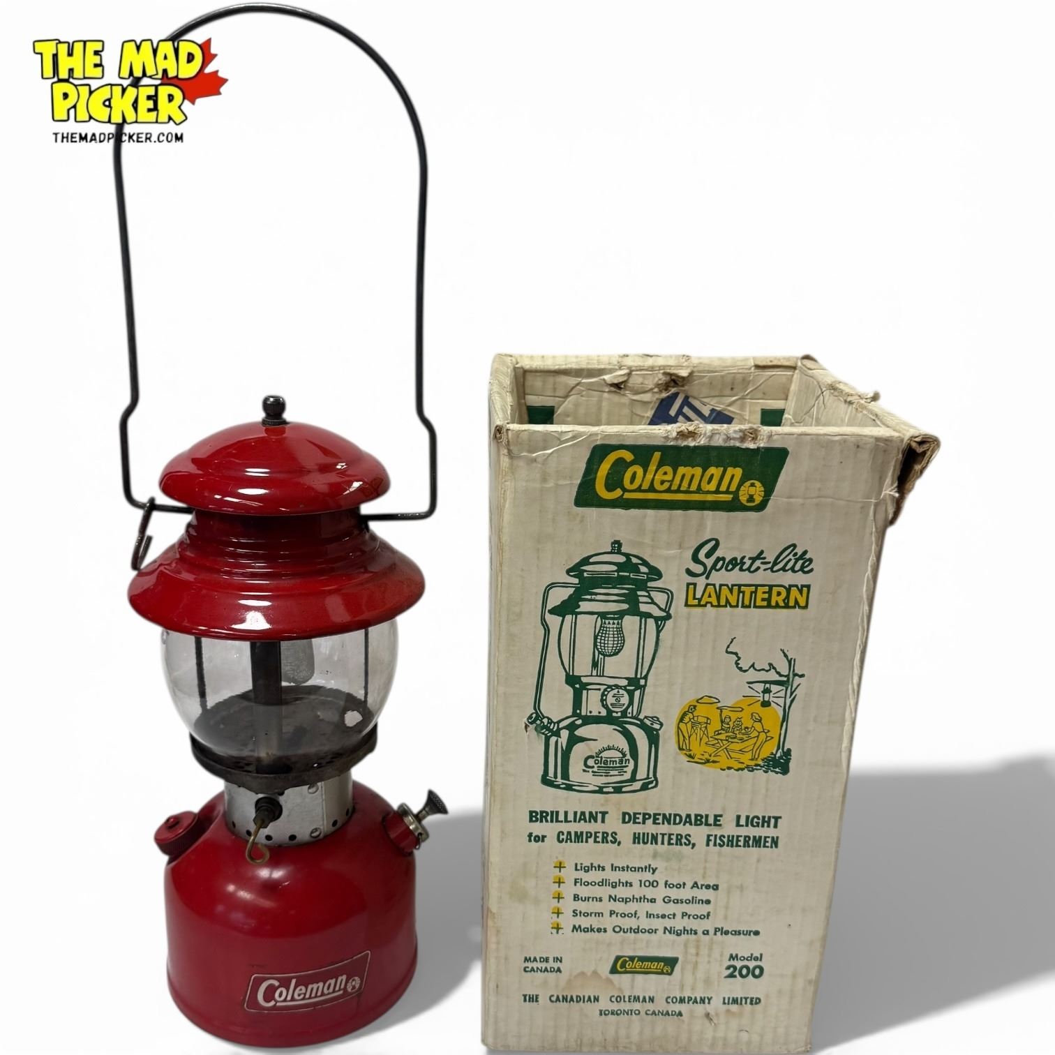 Coleman Lantern Model 200 in red painted metal with single mantle design. Includes original box. Undated production, likely mid-20th century based on model history. Compact size with carrying handle. Suitable for kerosene or Coleman fuel. Known for reliable outdoor lighting.