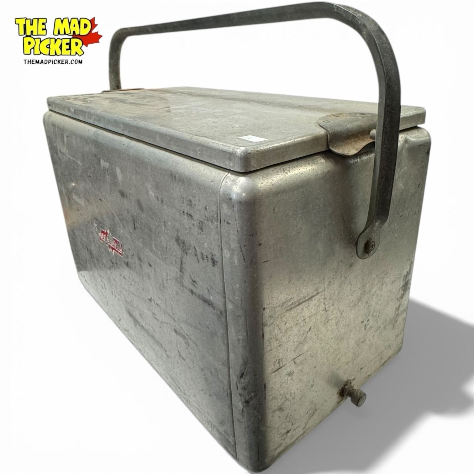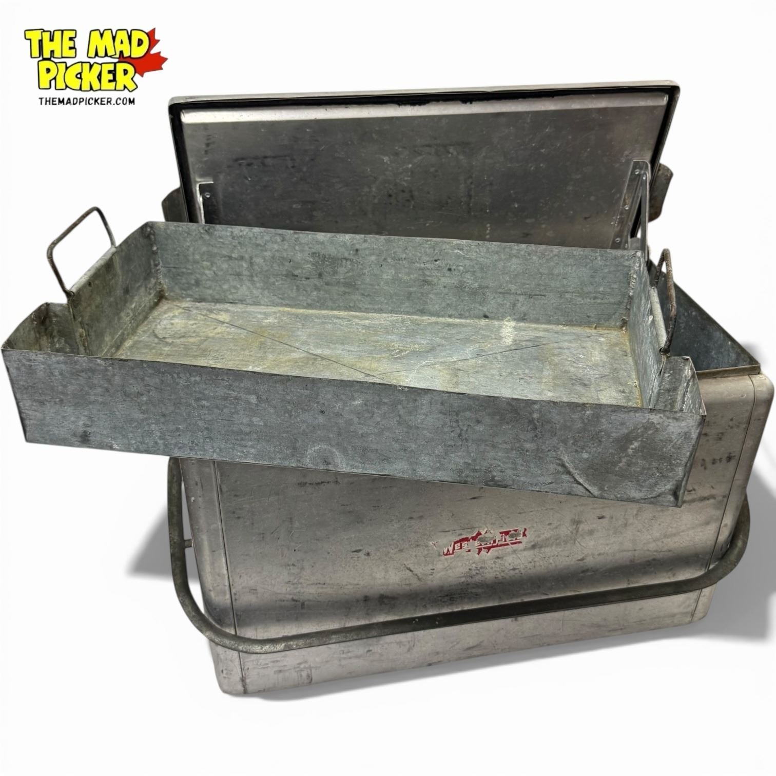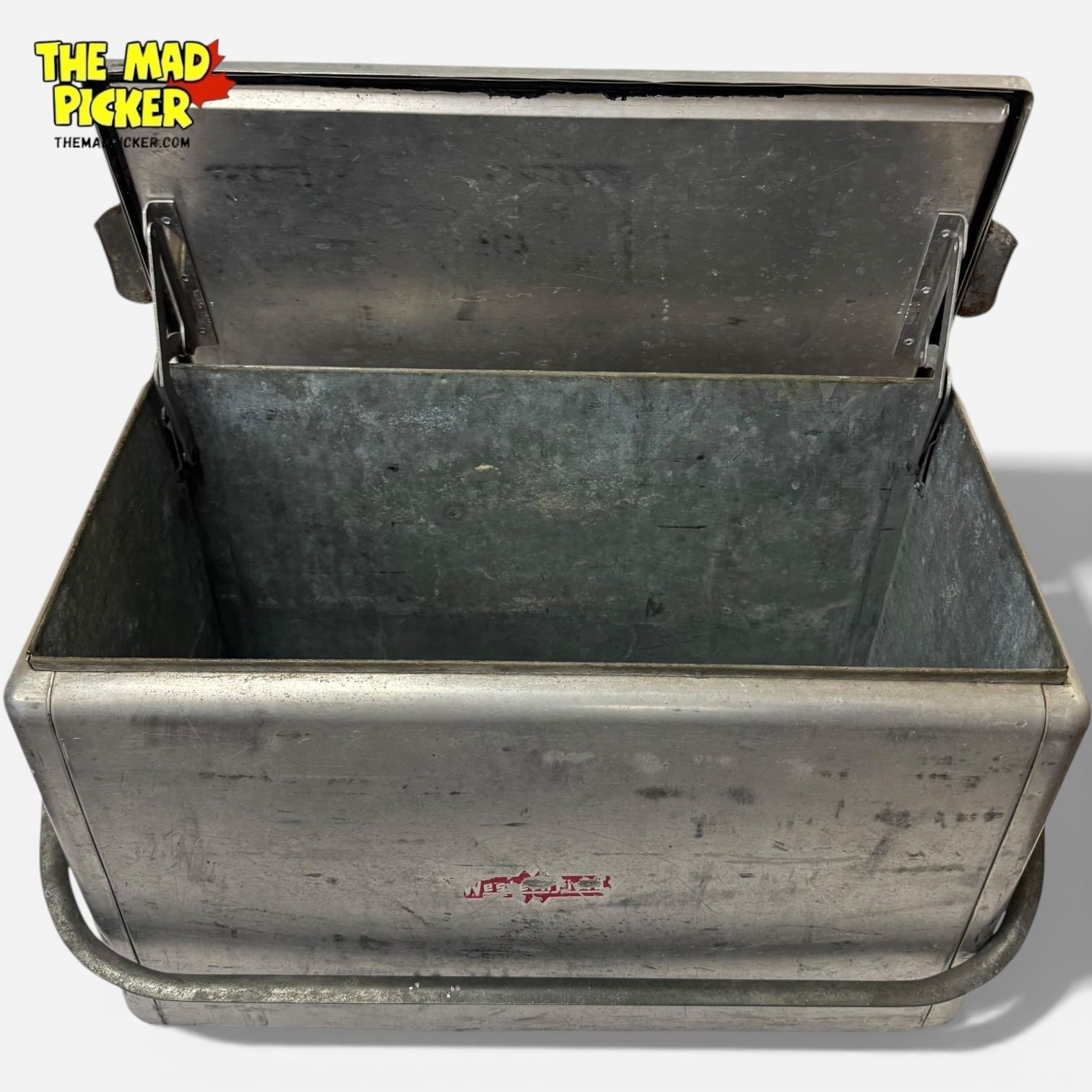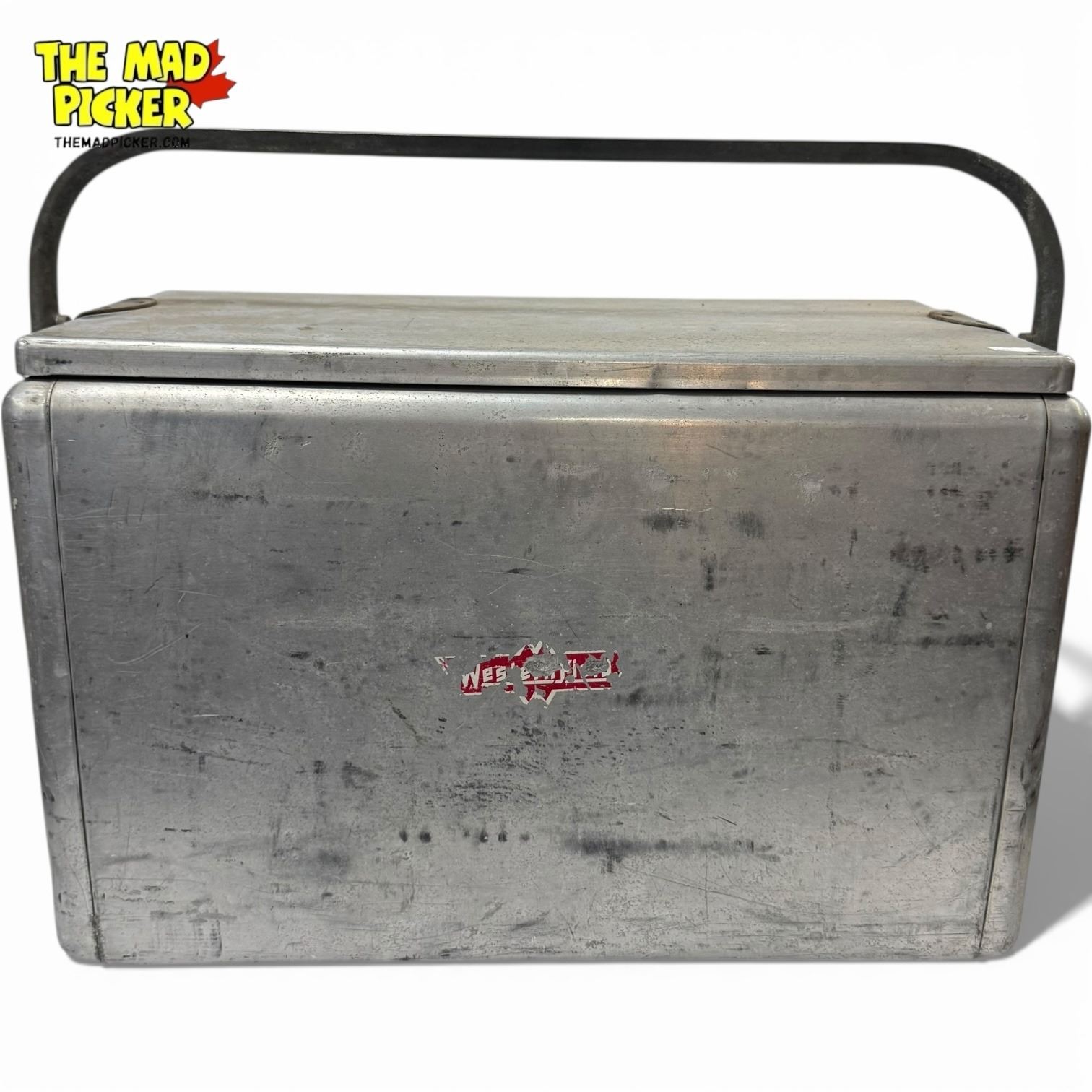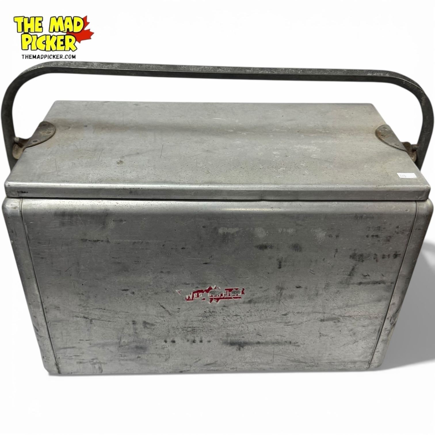 Western Field aluminum ice chest cooler sold by Montgomery Ward, produced in the 1950s-1960s. Measures approximately 19x10x12.5 inches. Includes original tray insert. Features ribbed aluminum exterior with metal latches and handles. Designed for durability and utility during mid-20th century outdoor activities.