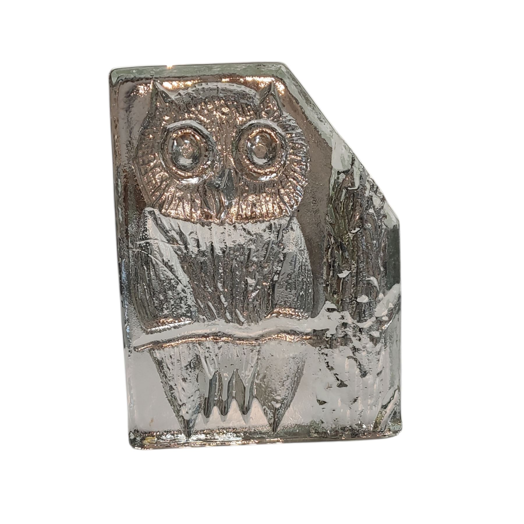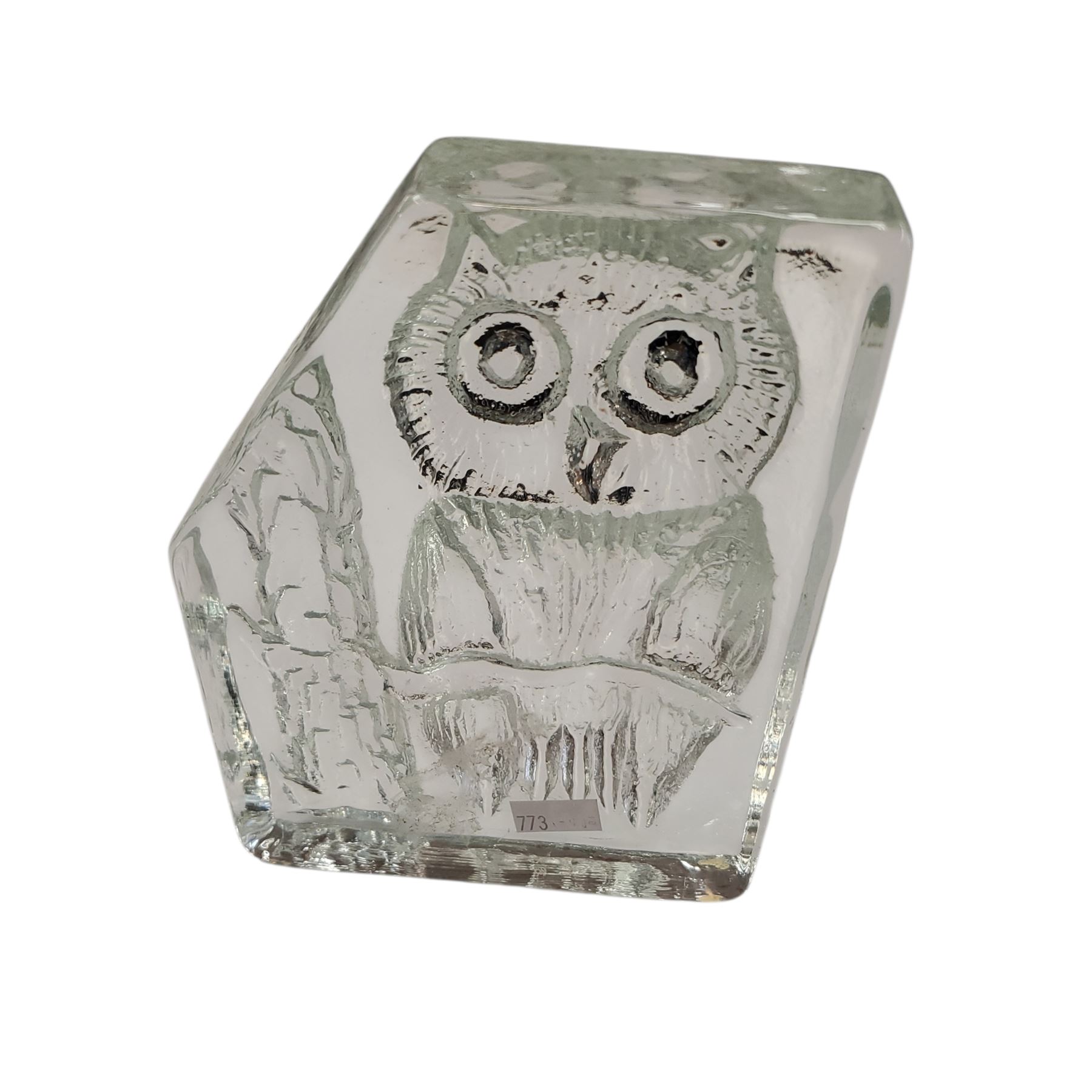 Large solid glass owl sculpture made by Eneryda Glasbruk, Sweden, in the 1970s. Measures 16.5 x 12.5 x 5 cm and weighs 1663 grams. The sculpture showcases the skilled craftsmanship of Swedish glassmakers, with detailed design and clarity characteristic of Eneryda Glassworks from this era.