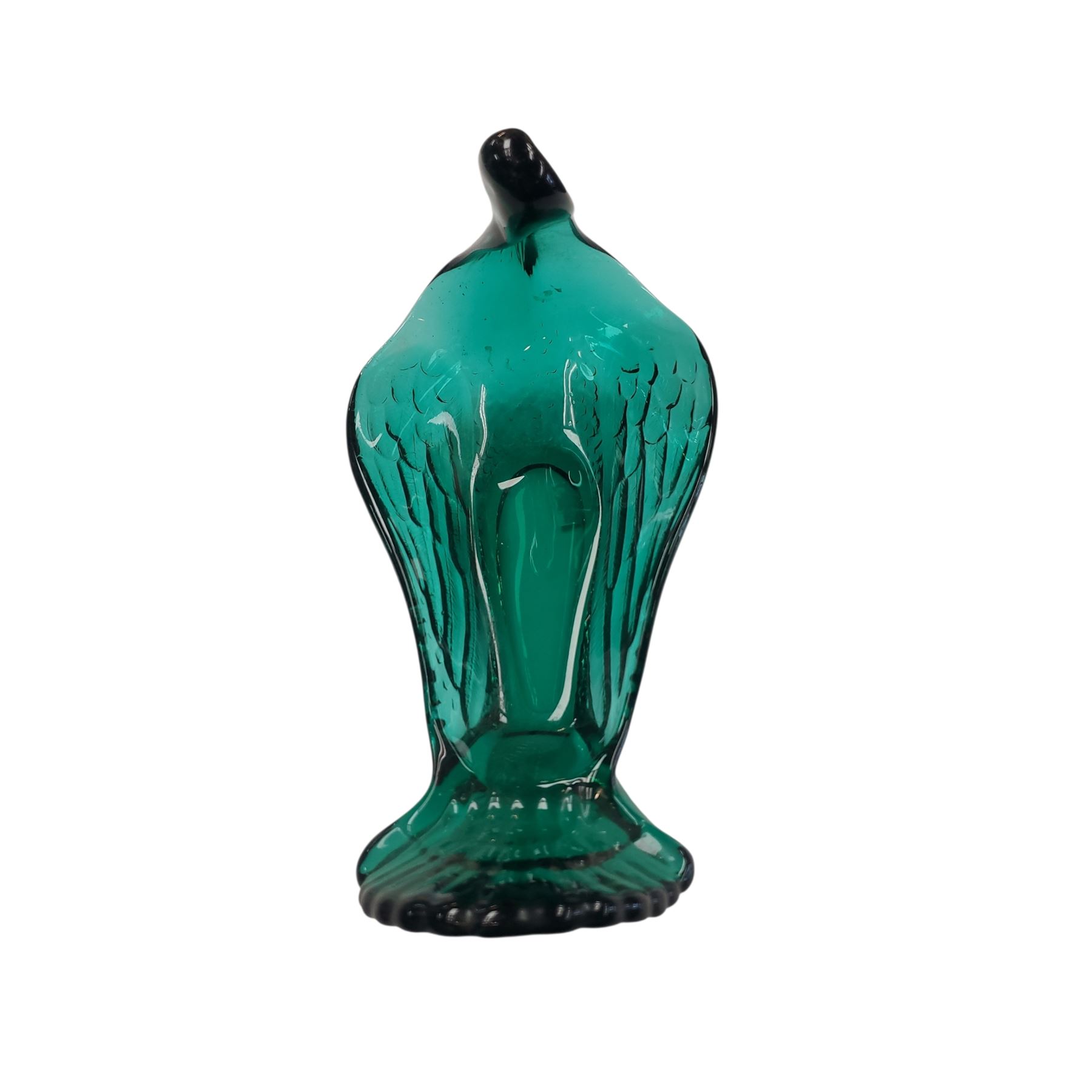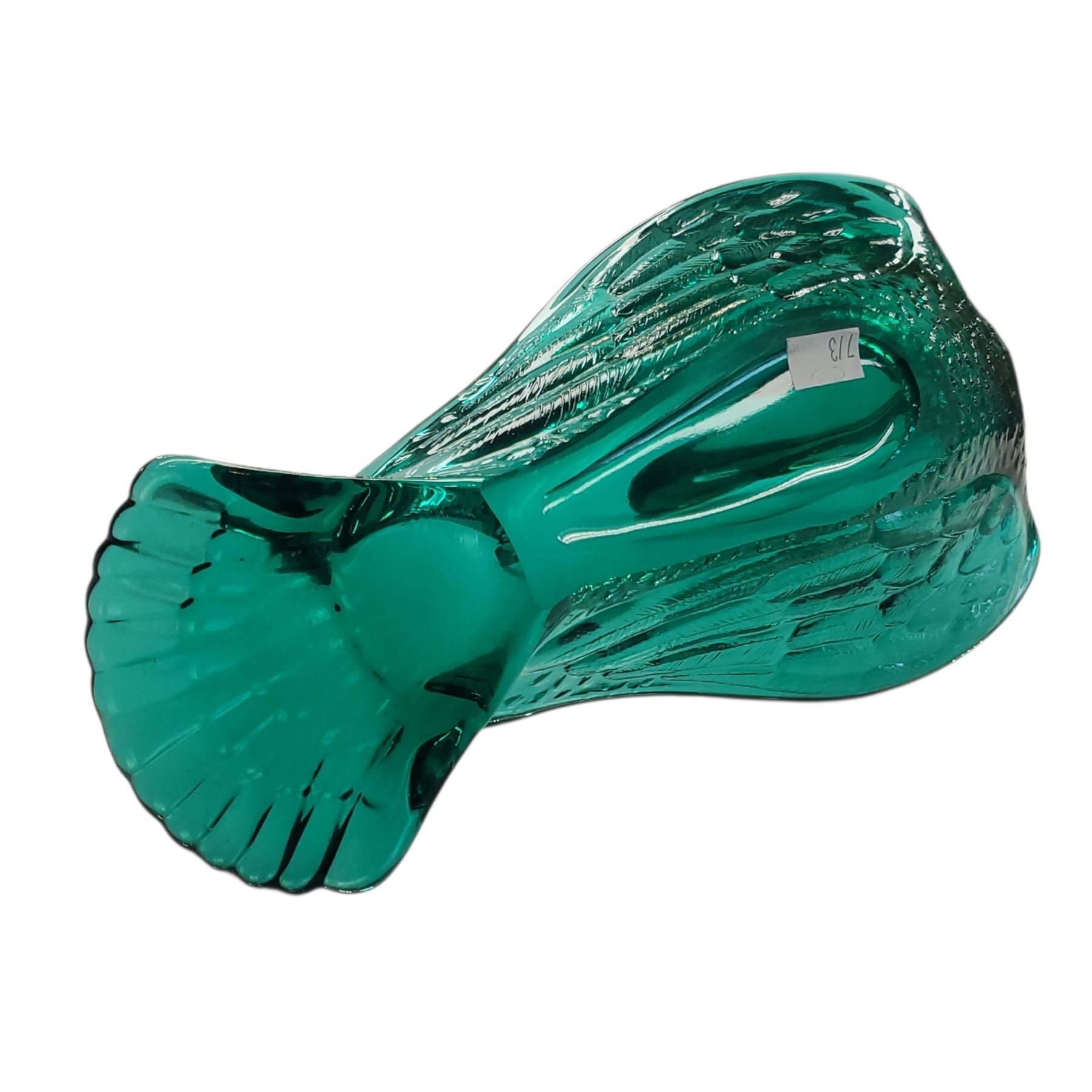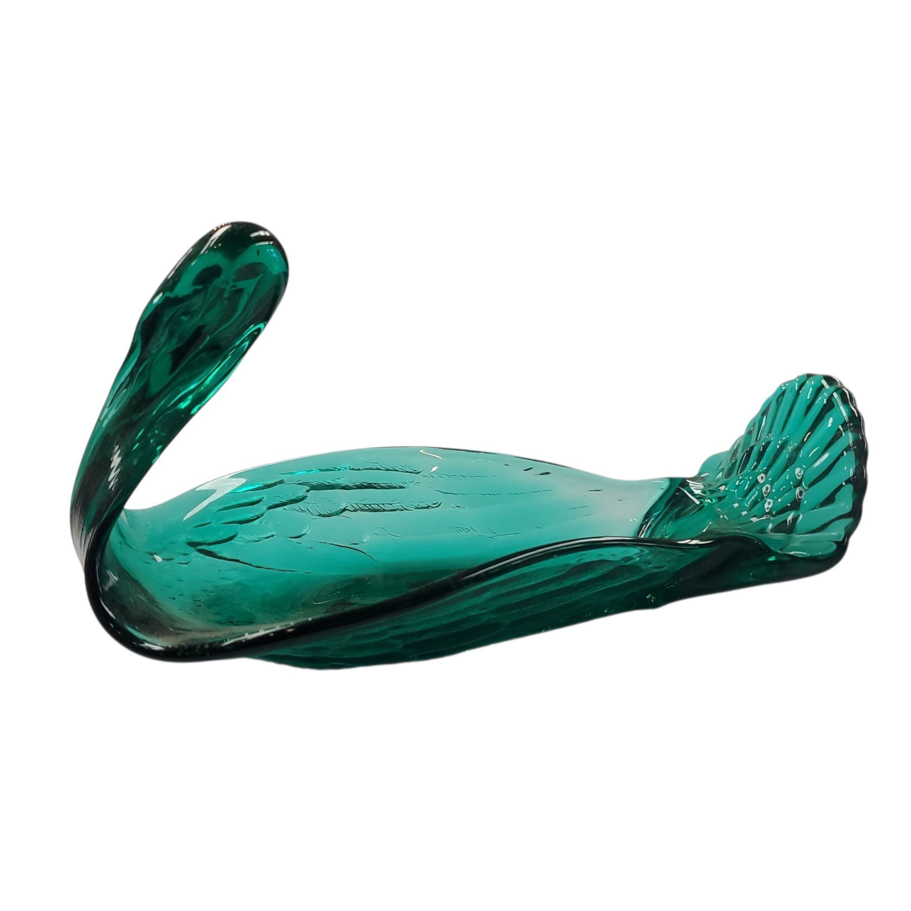 Green art glass decorative bird-shaped dish, often interpreted as a swan. Crafted in Murano-style glass, its design reflects Art Deco influences. Versatile for use as a candy dish, catch-all, or purely decorative centerpiece. Likely mid-20th century production.