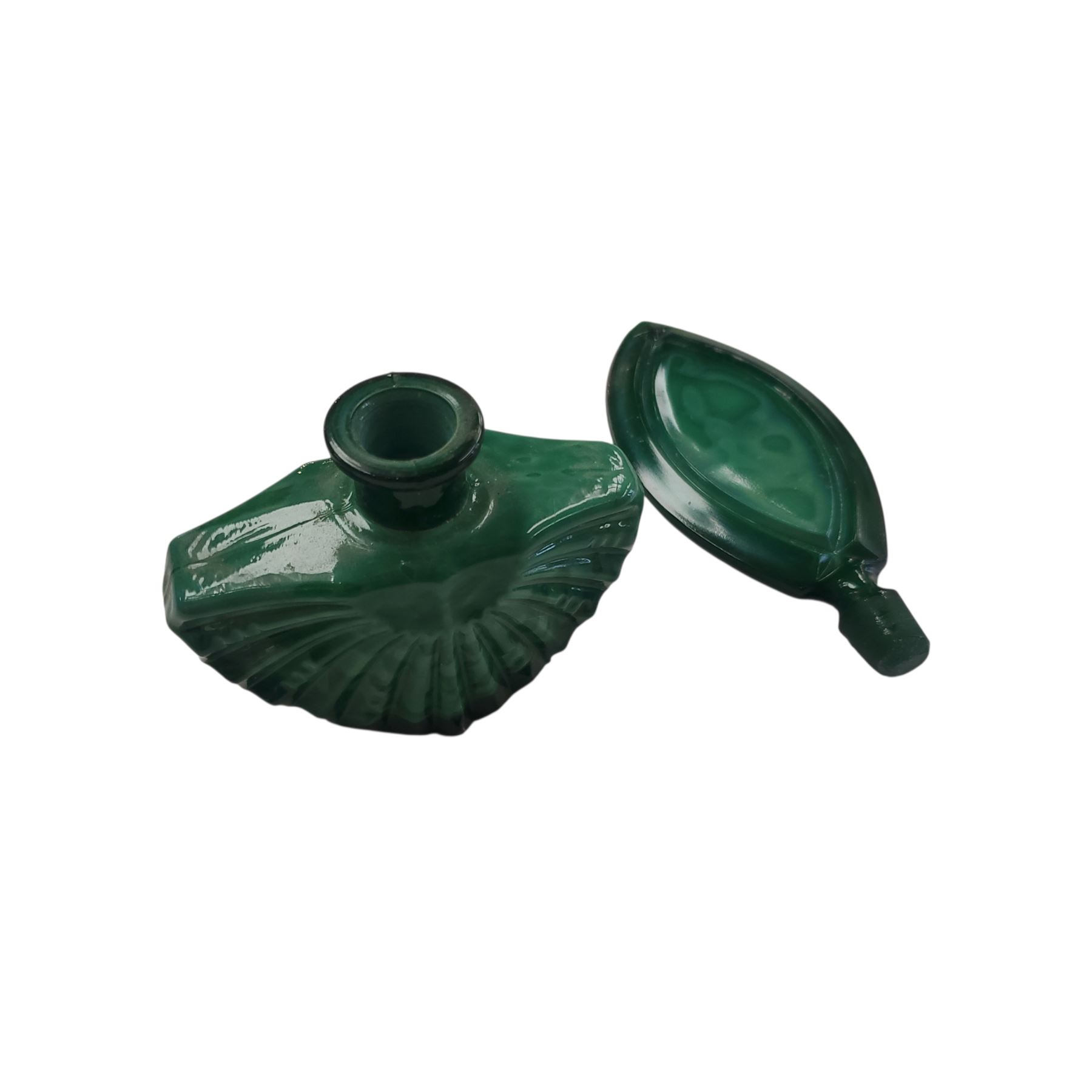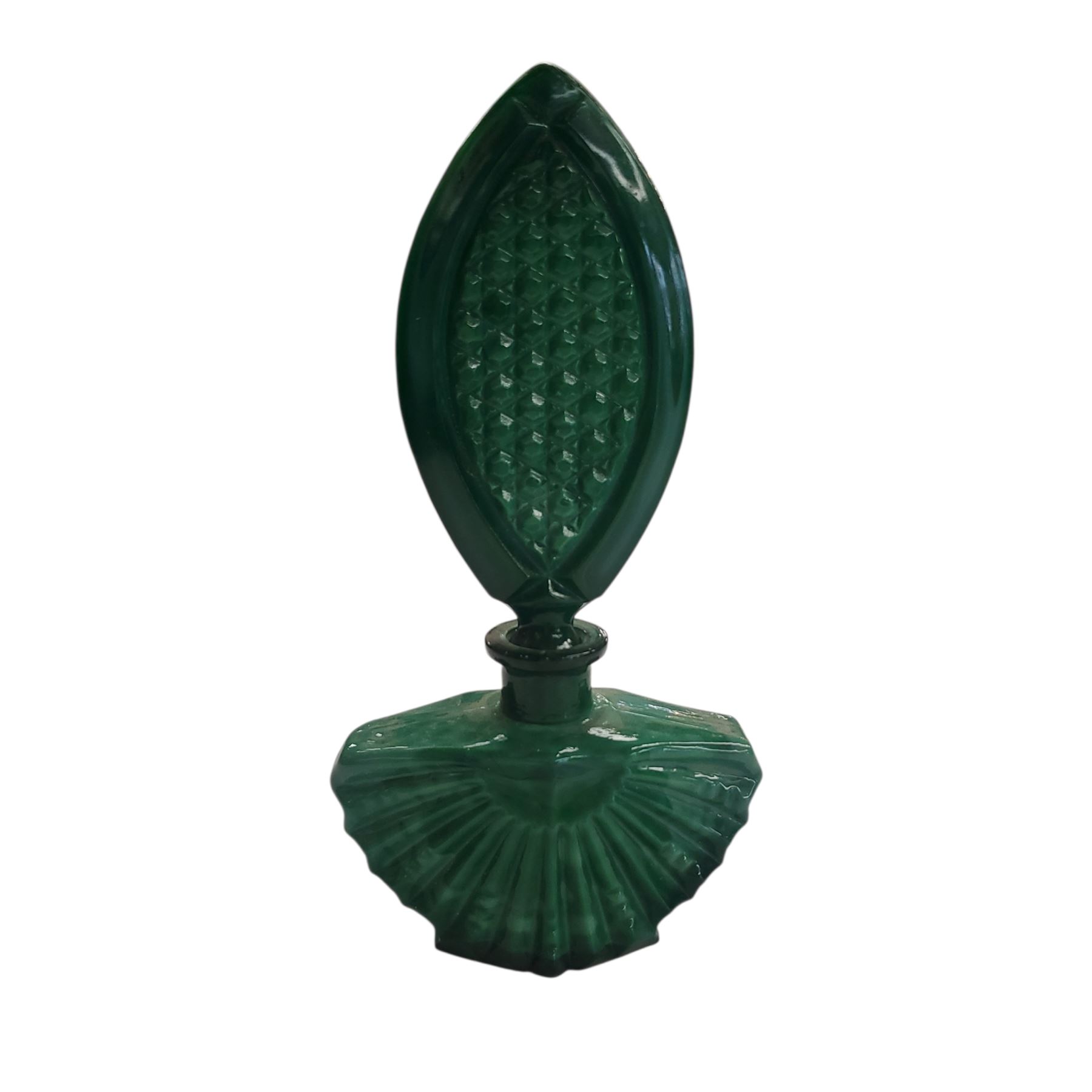 Vintage Art Deco perfume bottle made in Czechoslovakia during the 1920s-1930s. Crafted from green opaque glass, evocative of malachite or 'jade green' hues. Bohemian-made, this 7-inch piece functioned as both a decorative item and practical accessory, showcasing the era's intricate design craftsmanship.
