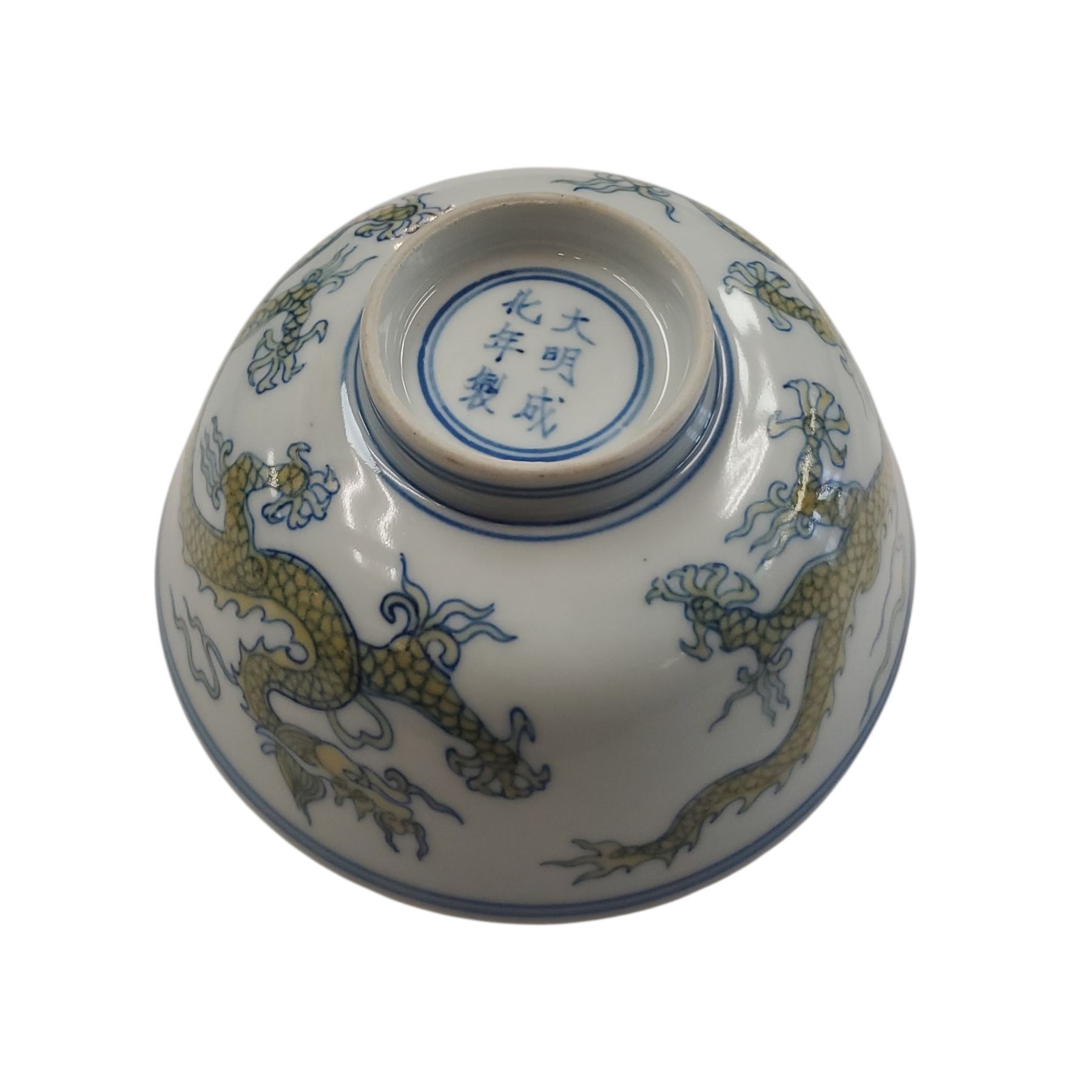 Chinese blue and white porcelain bowl featuring a detailed dragon motif. The base bears a six-character mark associated with the Chenghua period (1465-1487) of the Ming Dynasty. Crafted in traditional style with intricate hand-painted design, reflecting historical artistry. Authenticity is not confirmed