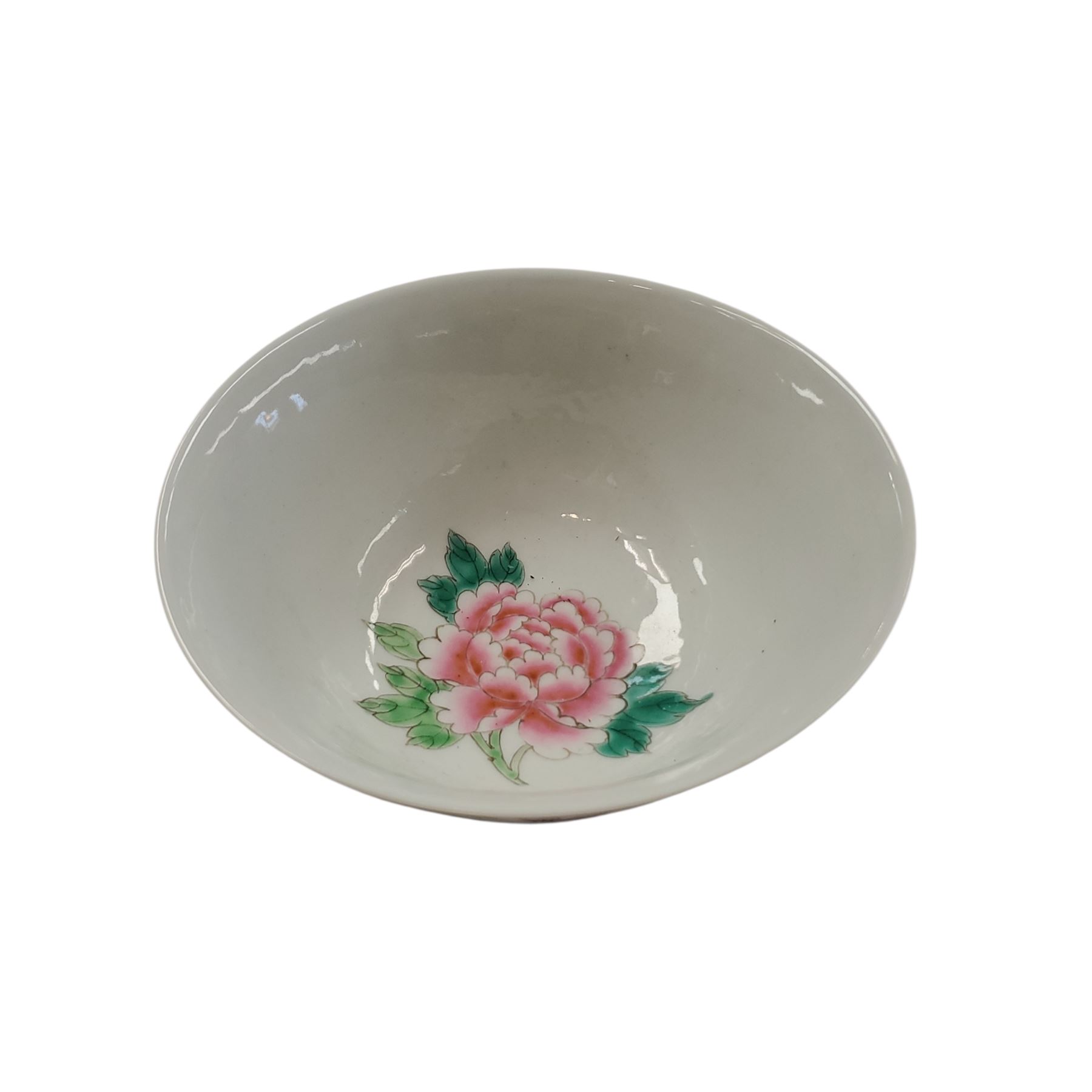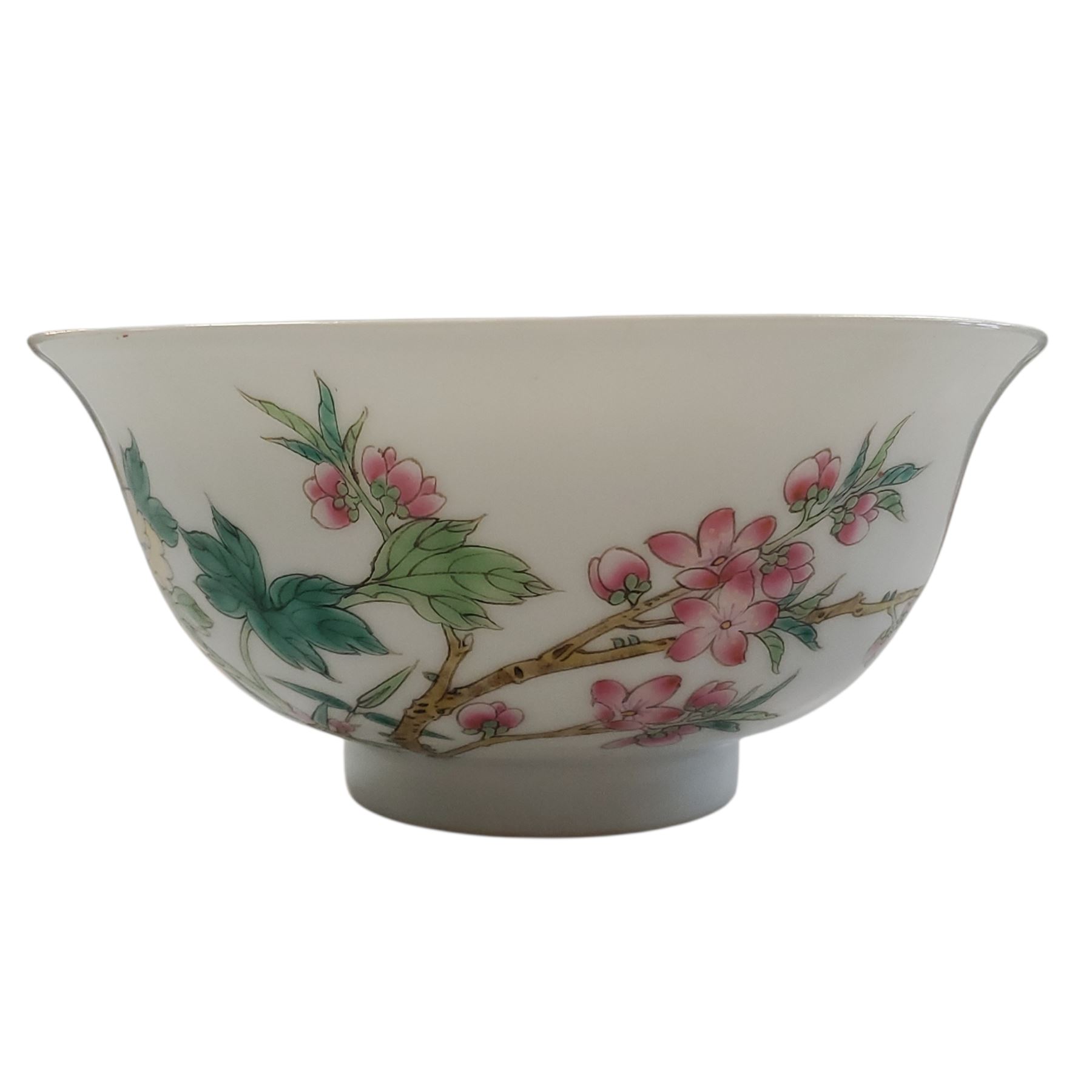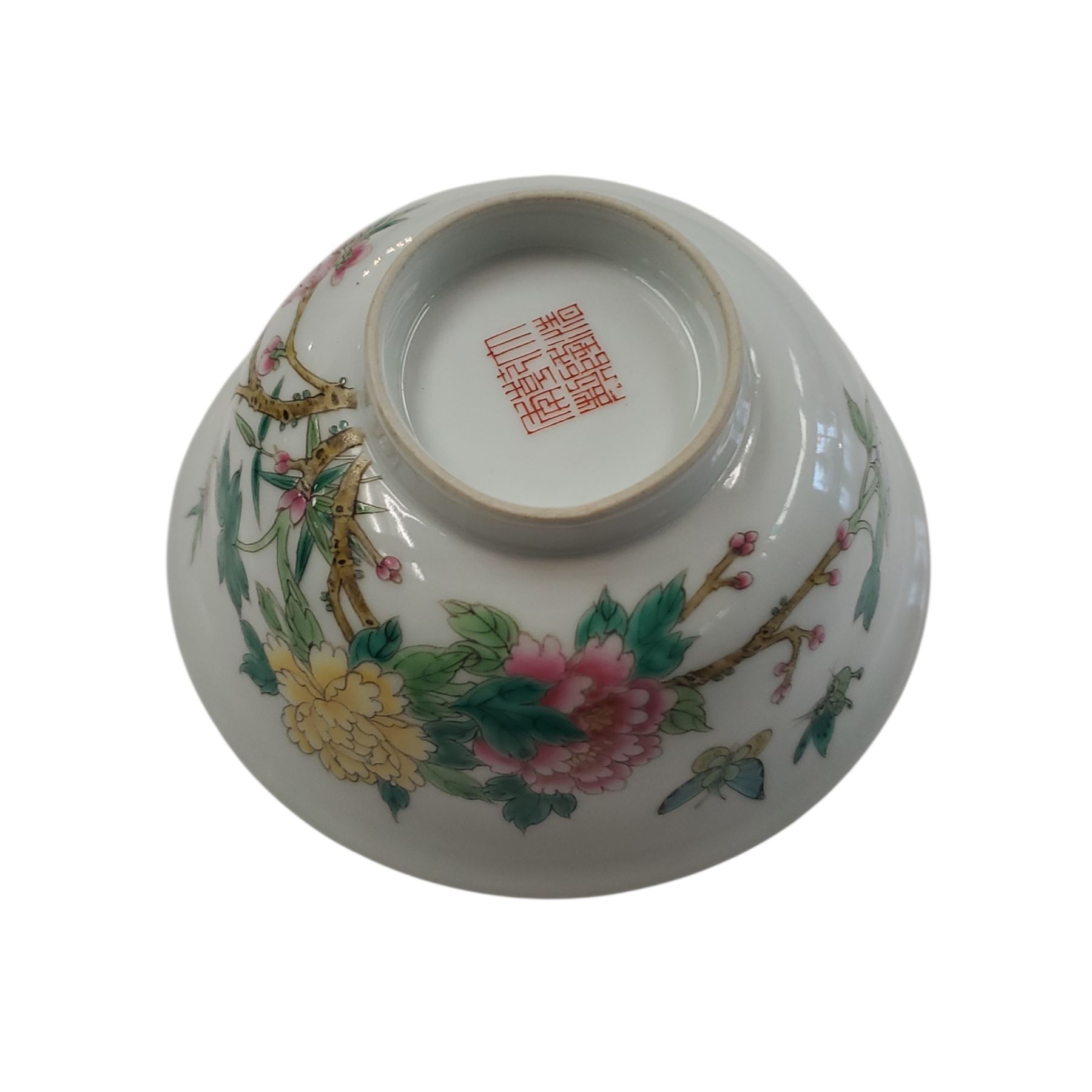 Chinese Famille Rose porcelain bowl featuring vibrant floral and bird motifs with peonies, magnolia, butterflies, and branches in overglaze enamels. The base includes an iron-red six-character seal mark. Crafted in the traditional 'Pink Family' style, emphasizing rich and opaque decoration.