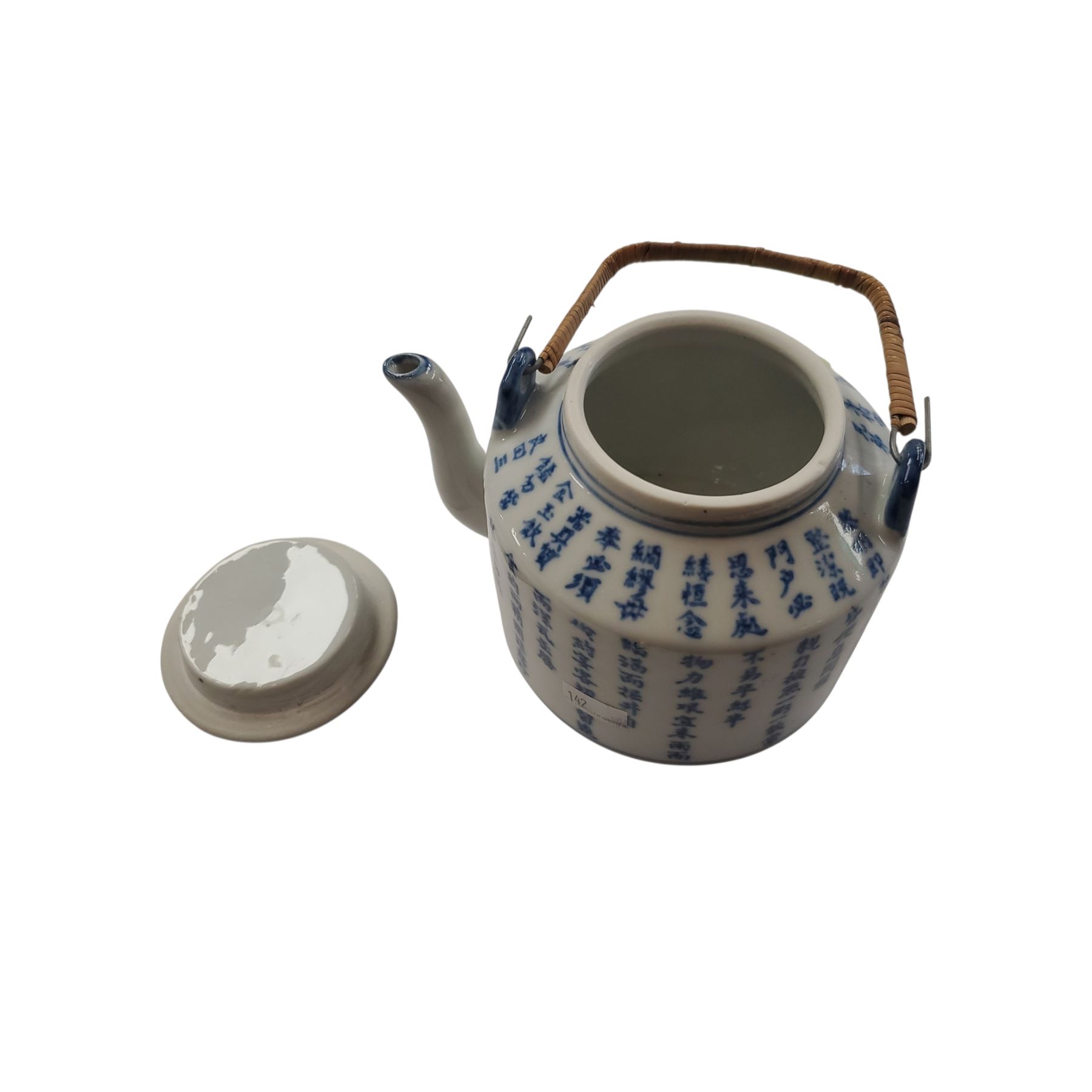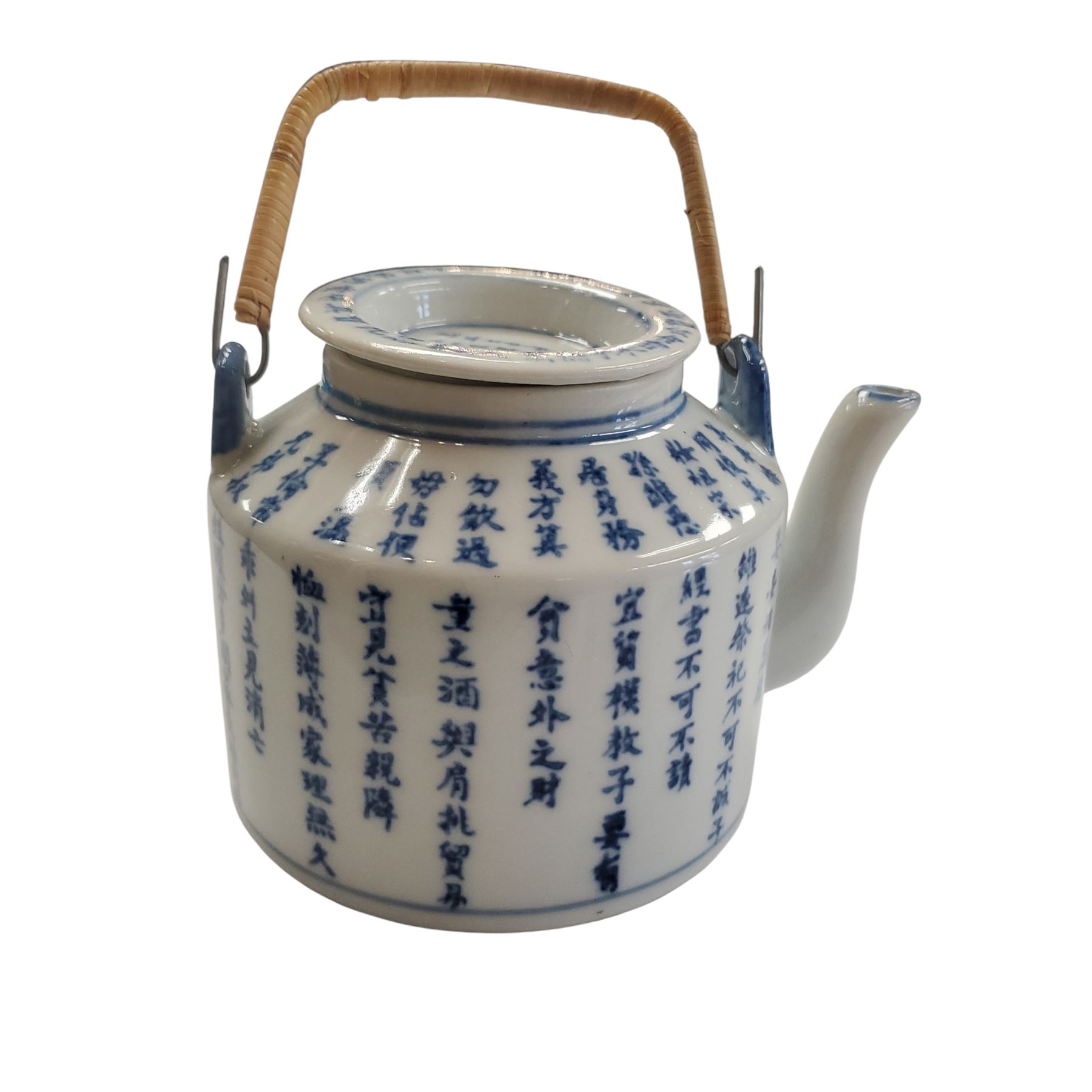 Antique Chinese blue and white porcelain teapot with a wicker handle and calligraphy of moral maxims. Cylindrical shape with small spout. Features a Qianlong reign mark in seal script (Zhuanshu) on the base. Likely a 19th-century reproduction, as artisans commonly copied marks from earlier periods.