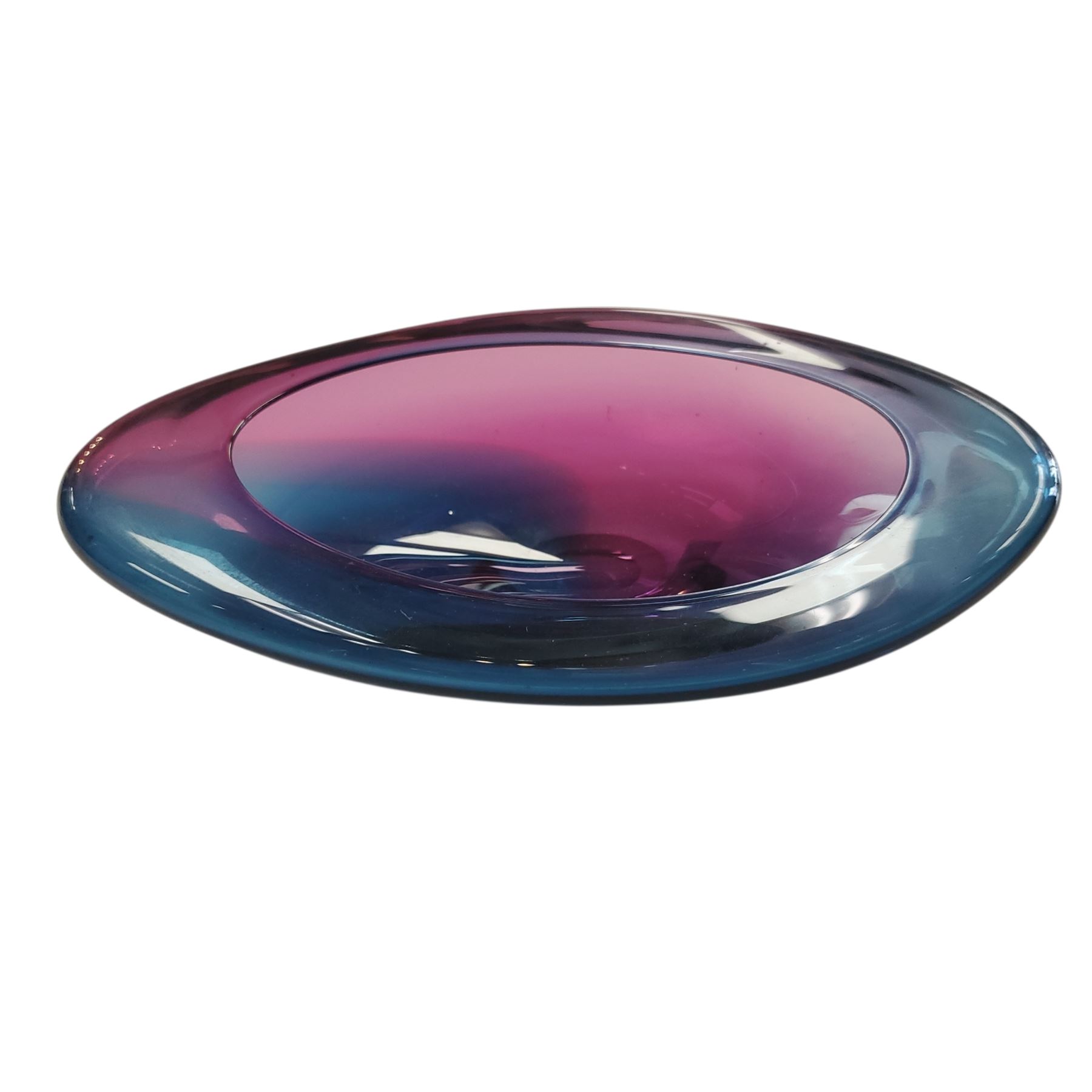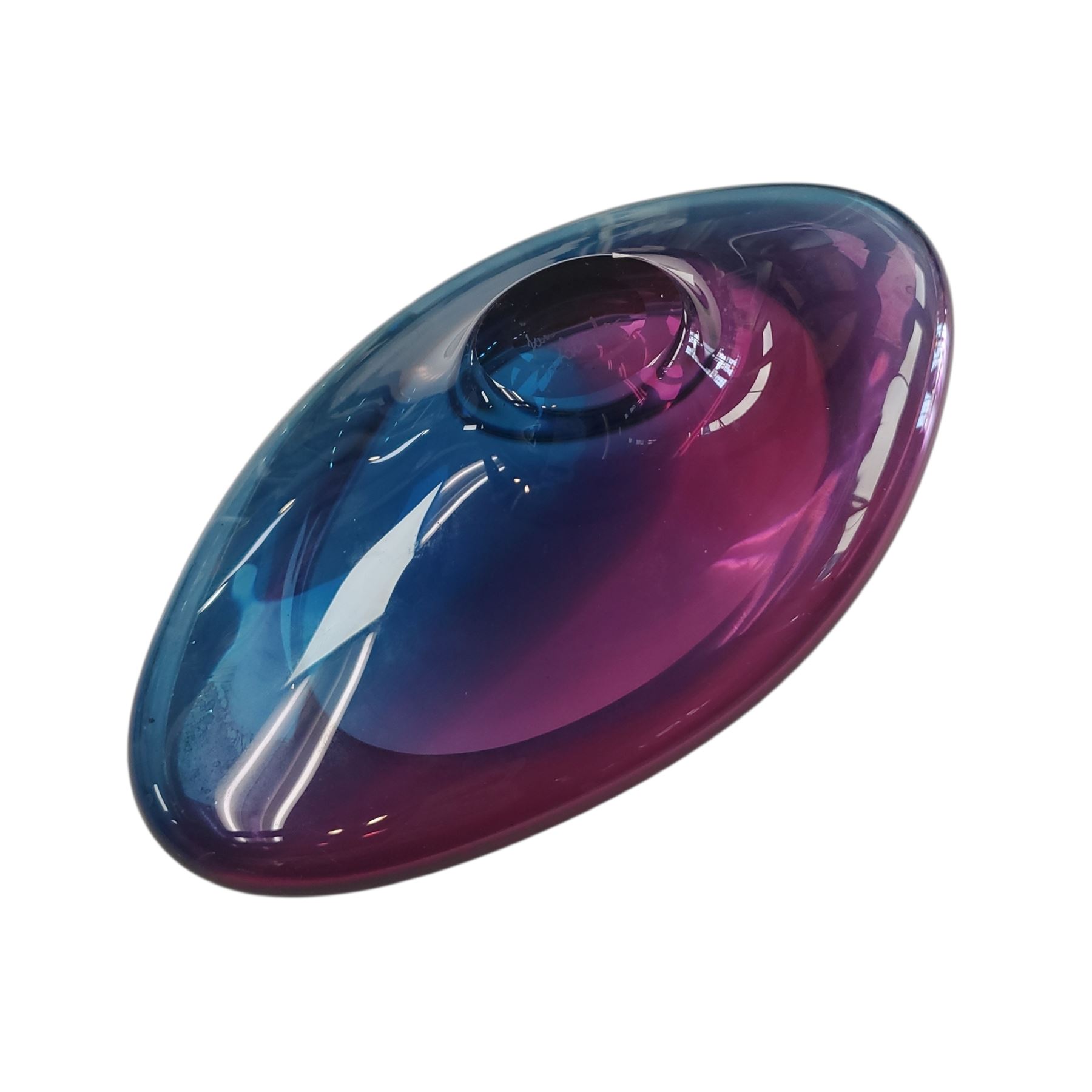 Handblown art glass bowl by Jan Benda, crafted in British Columbia, Canada. Measures 9.5 inches in length. Features vibrant purple, blue, and pink hues with fluid, organic lines. Signed on the base by the artist. Studio glasswork showcasing Benda's distinctive style.