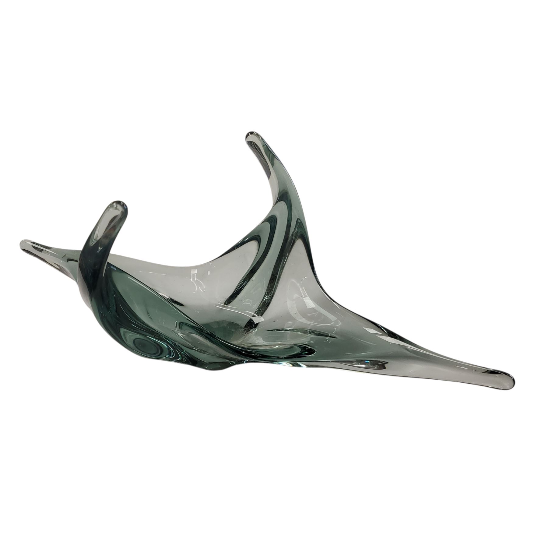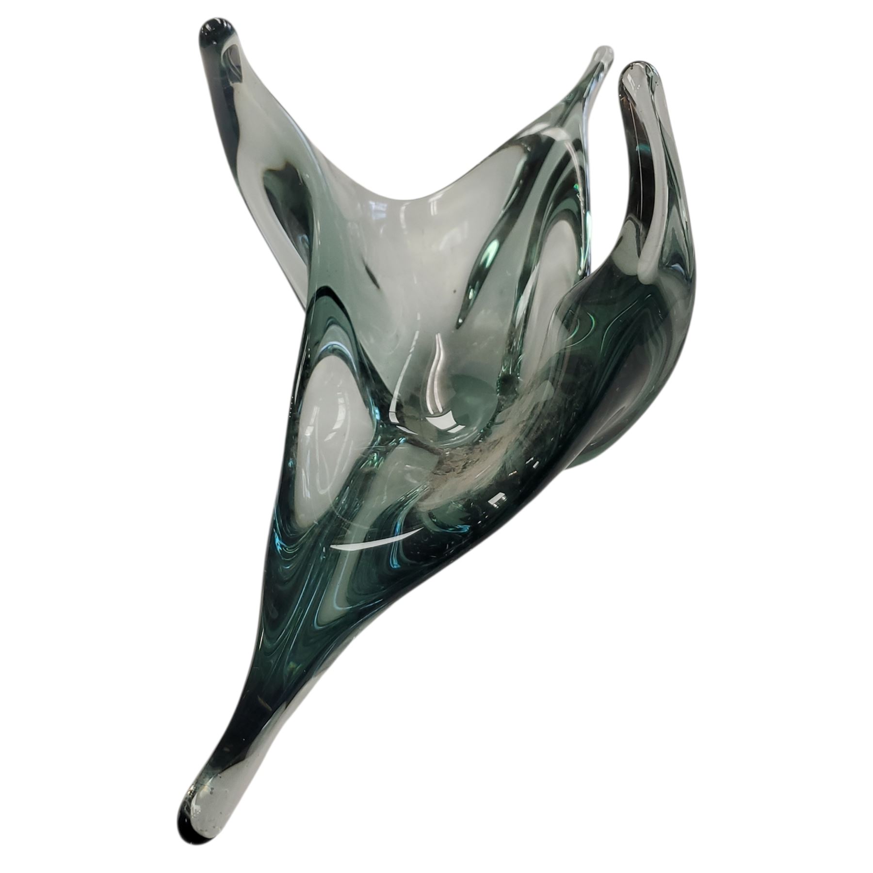 Art glass bowl by French maker Vallérysthal, known for vibrant crystal works. Features green and clear tones with flowing lines characteristic of mid-20th century design. Vallérysthal operated until the late 20th century, creating distinctive decorative glassware pieces.