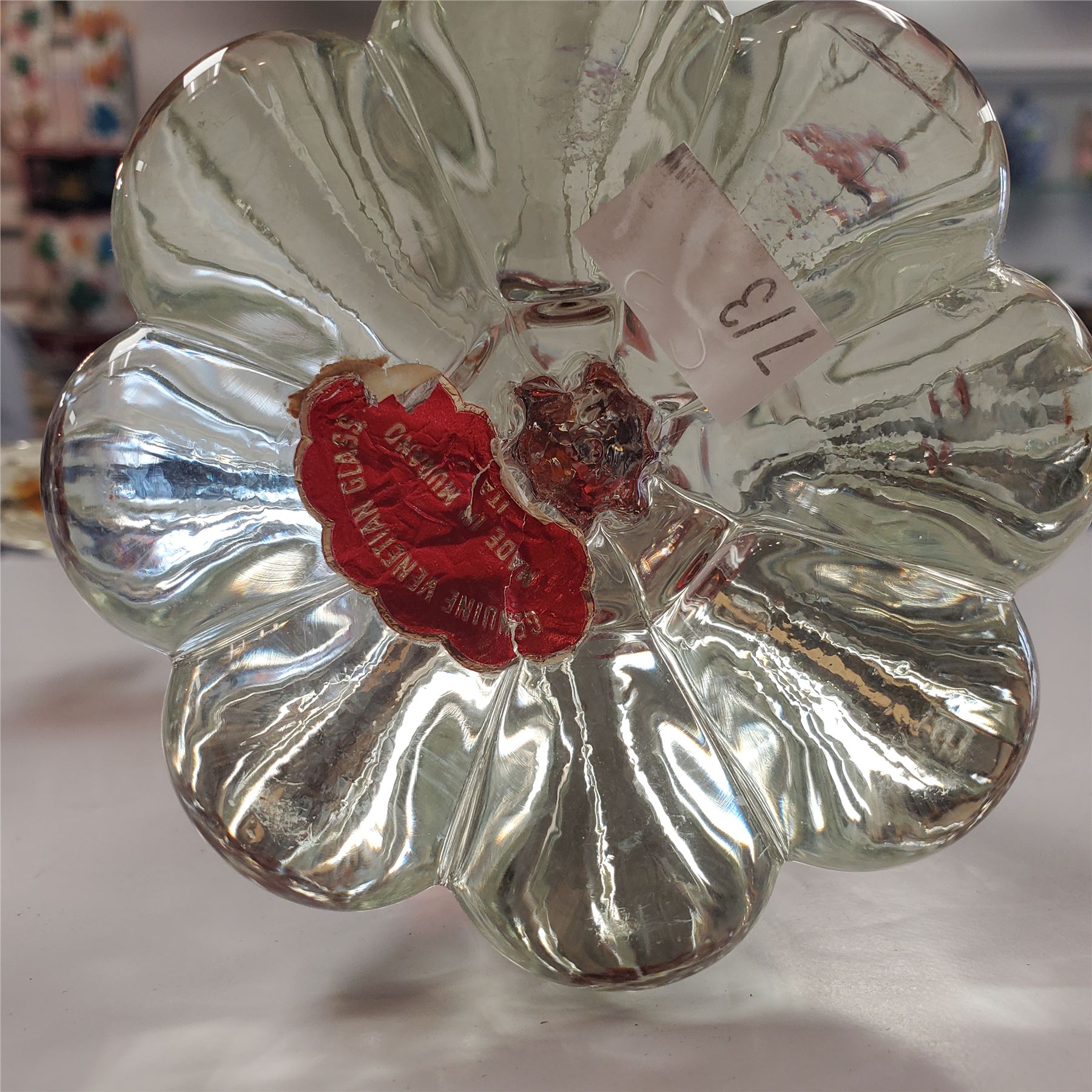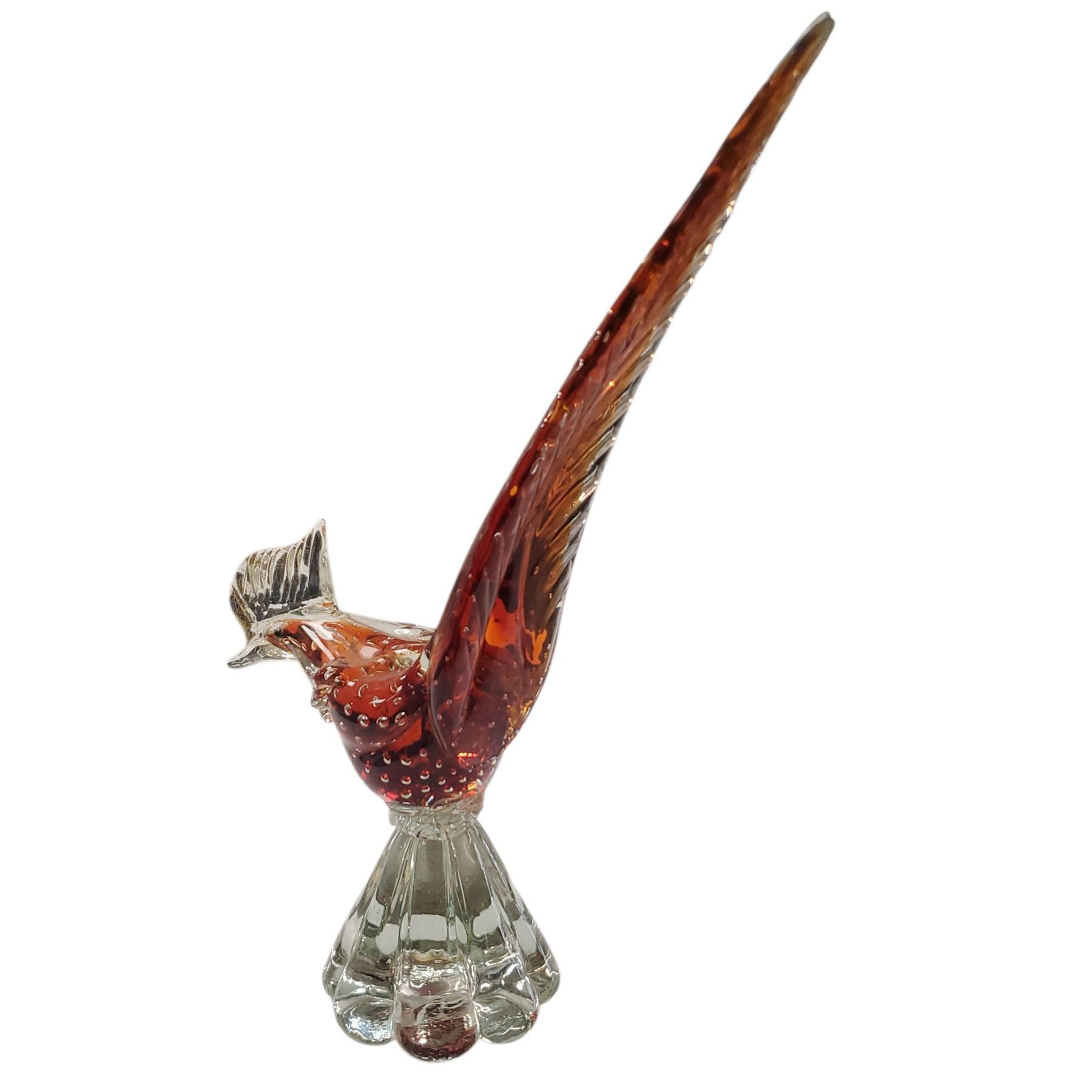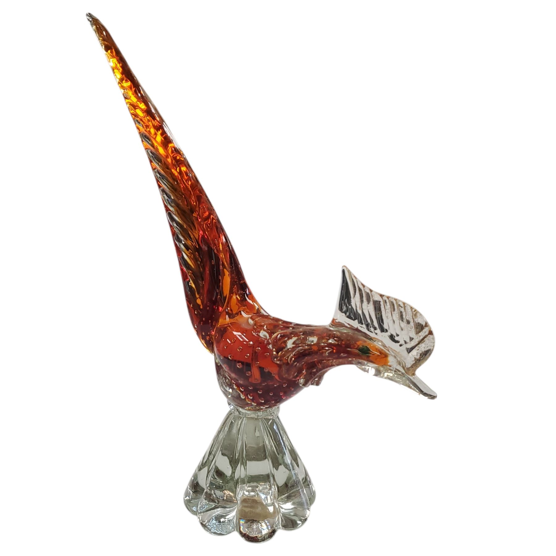 Vintage 1960s Murano Venetian glass pheasant figurine, 12 inches tall. Hand-blown Italian craftsmanship featuring amber, red, and clear glass with gold flake inclusions. Base showcases Bullicante technique with controlled air bubbles. Classic mid-century modern export piece.