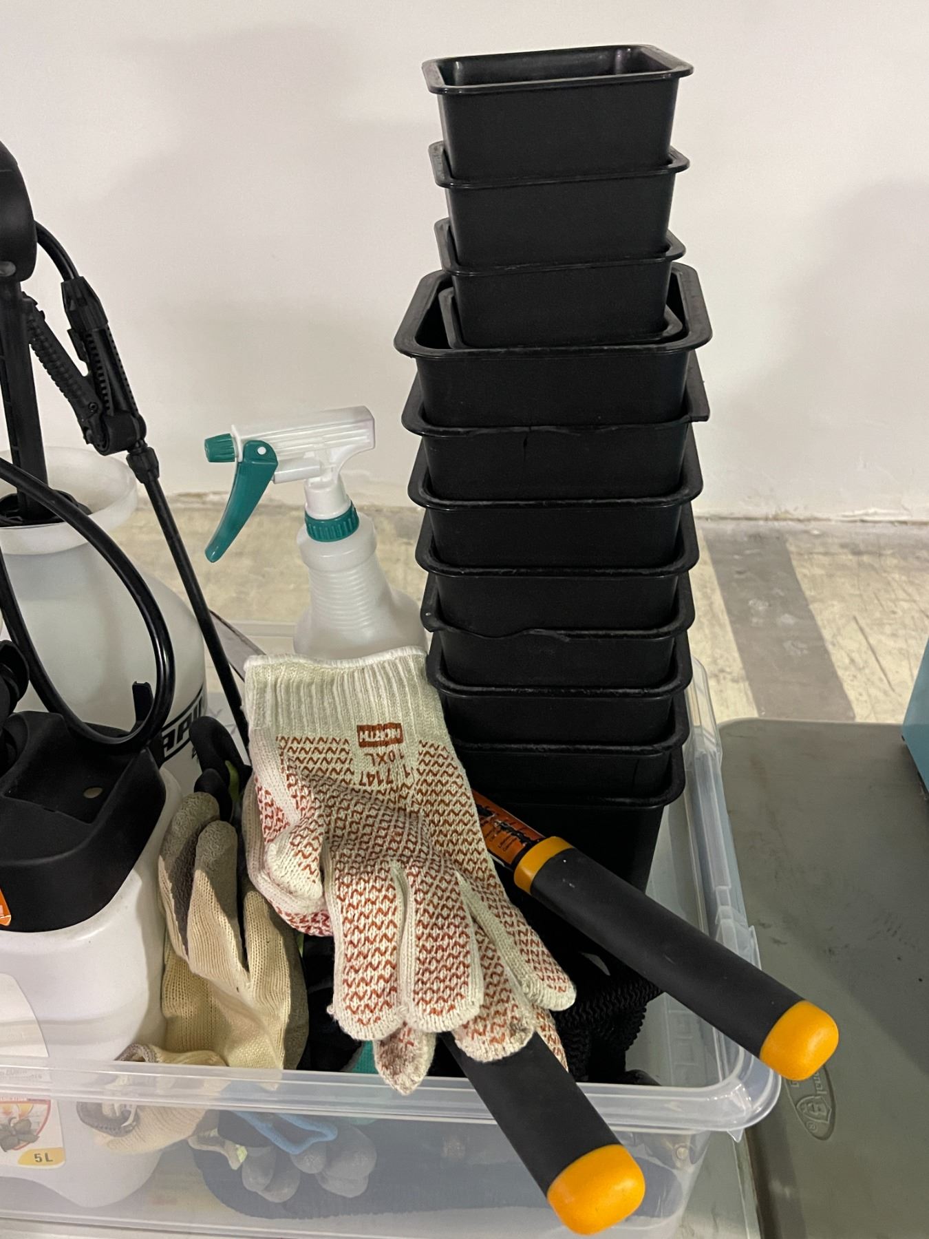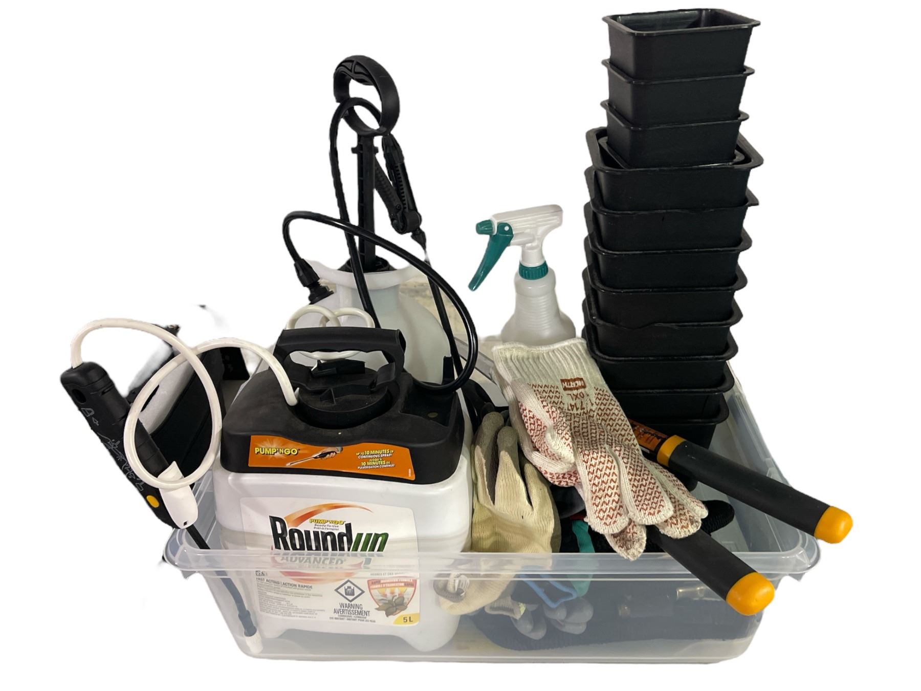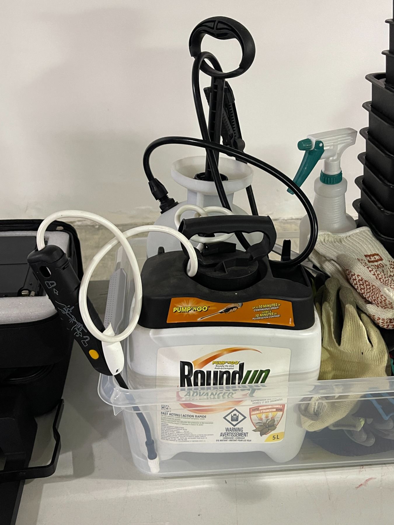Gardening lot - Roundup weed killer - Chapin 5L pressure sprayer - gloves - spray bottle - planting cups