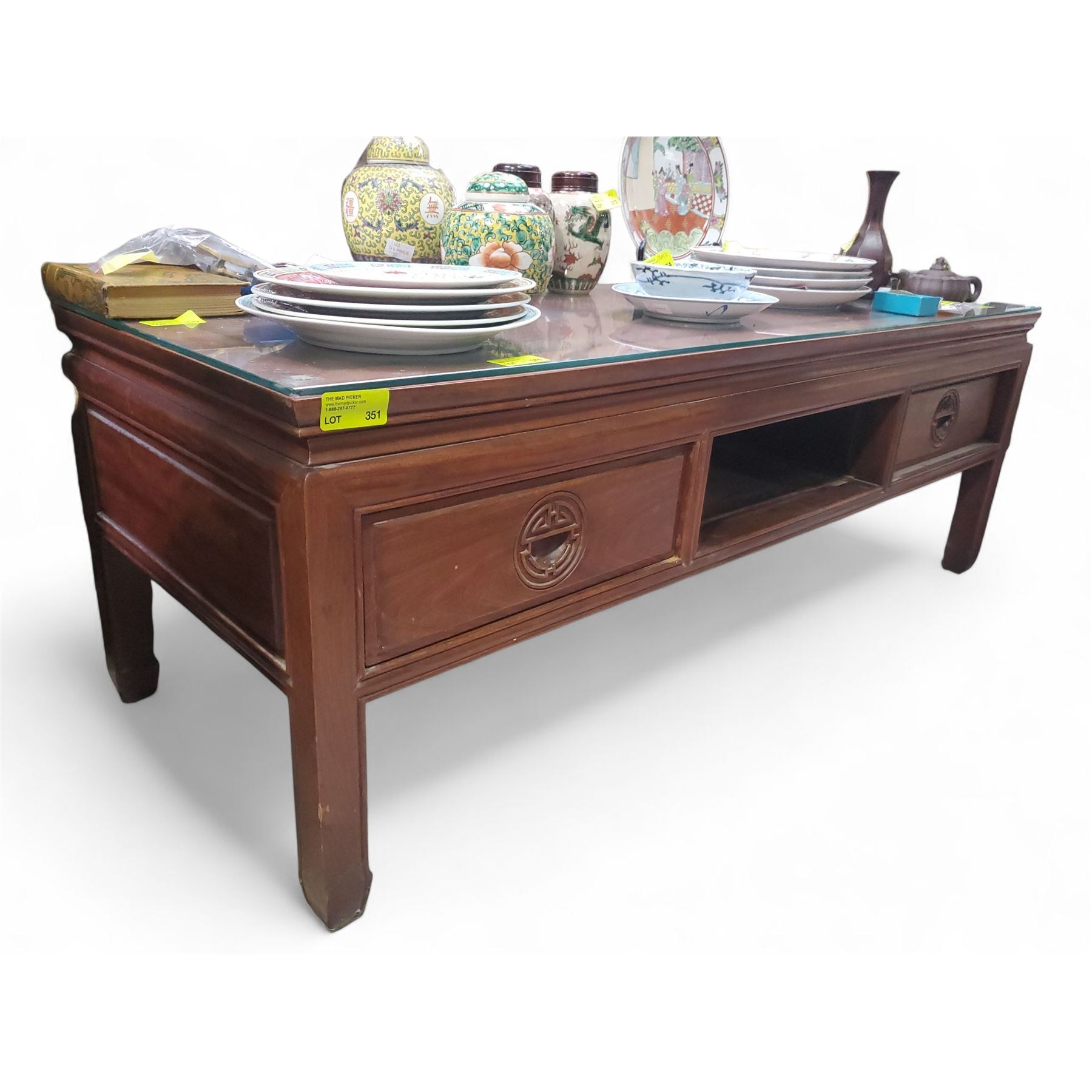 Glass Topped Asian Design Coffee Table - Missing center drawer - 20" x 52" x 18" tall - Contents not included