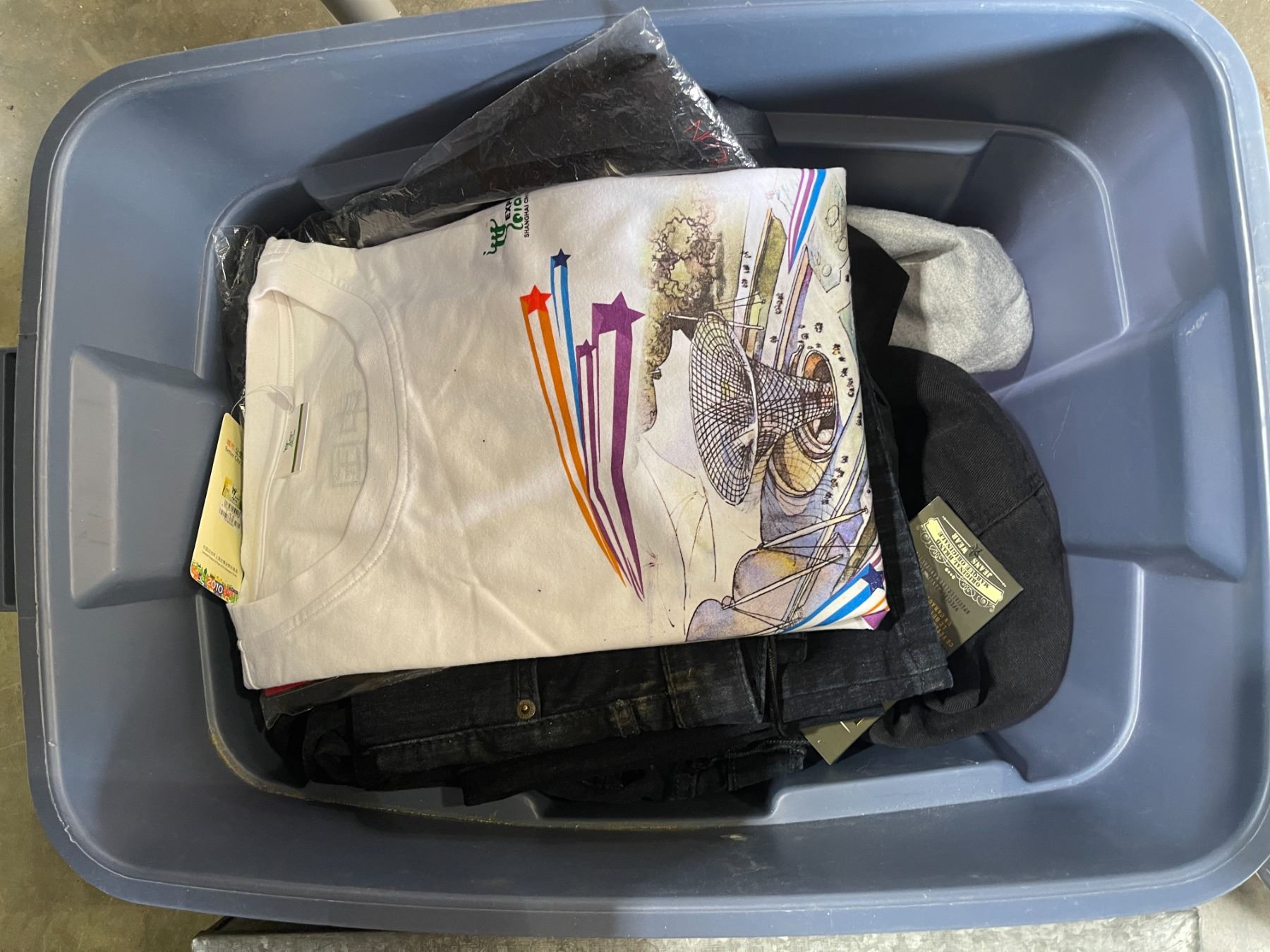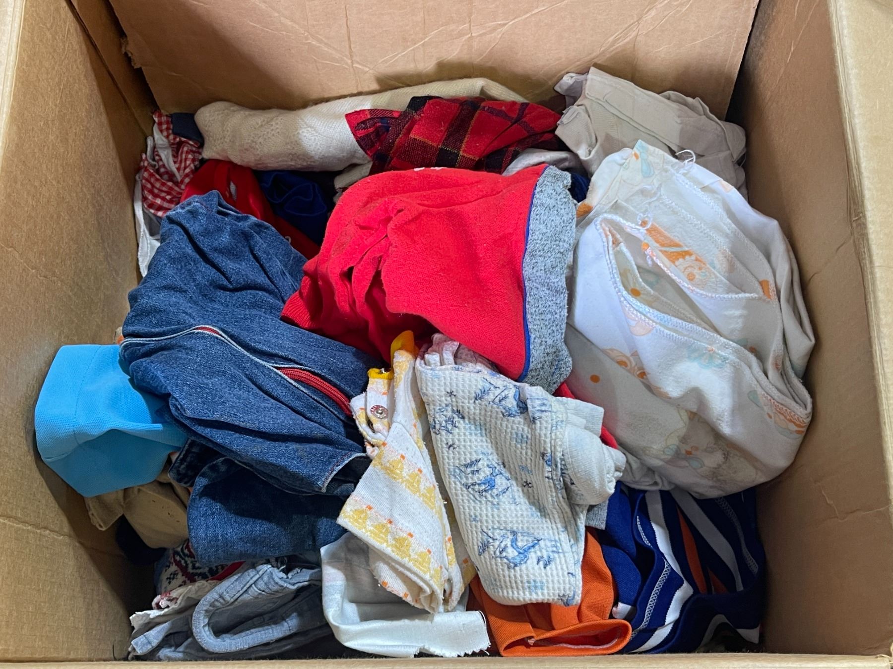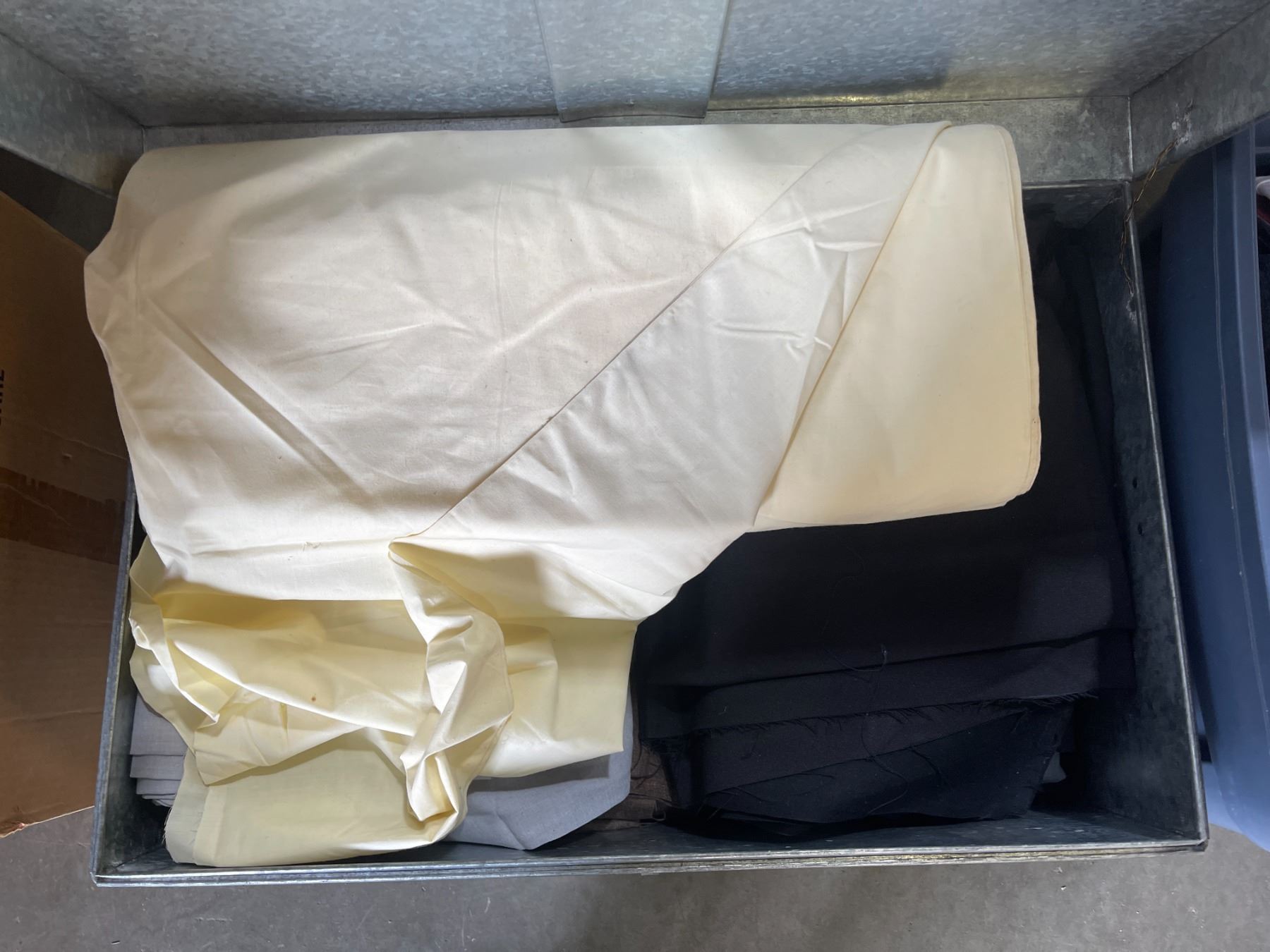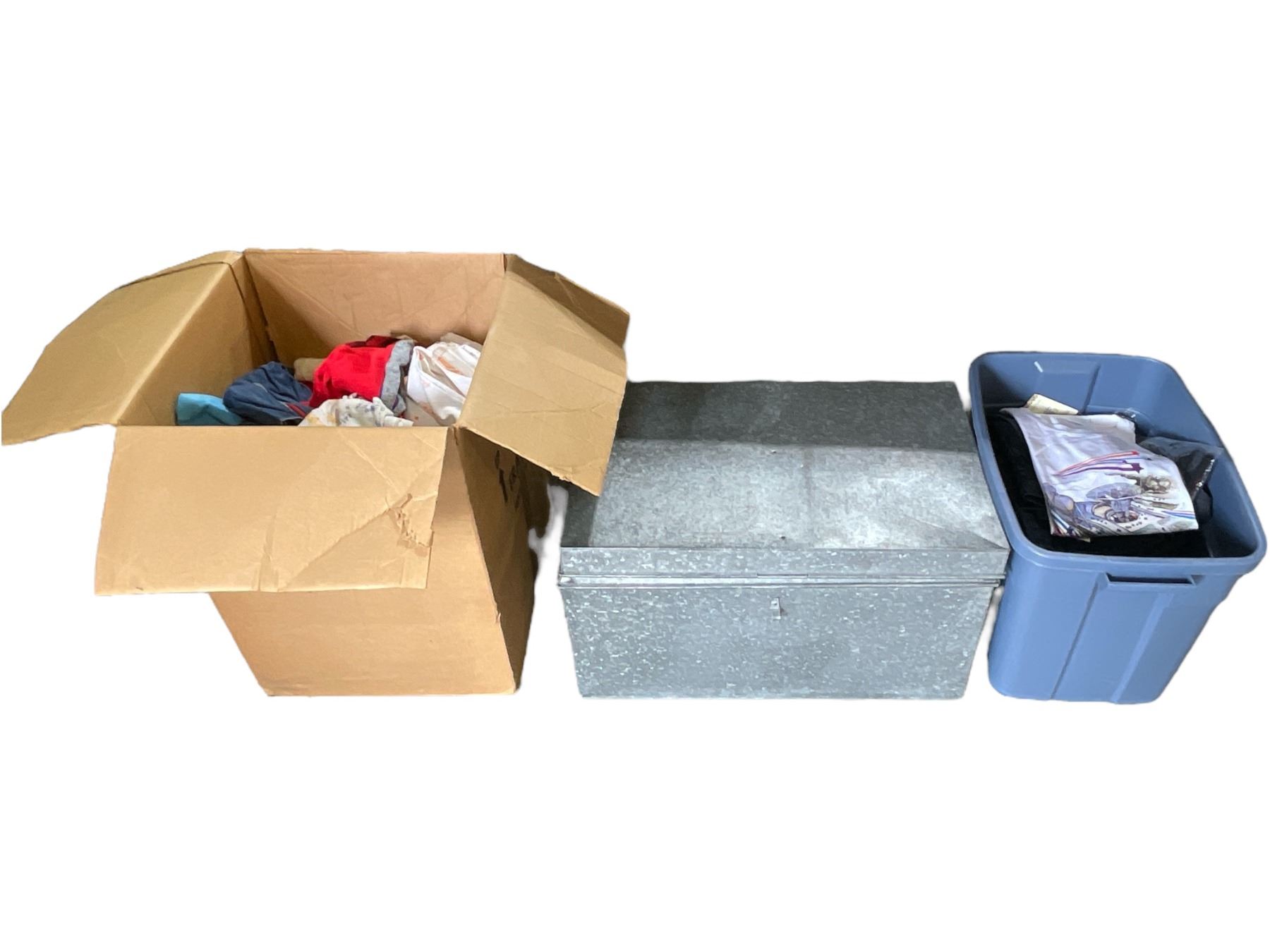 Group lot - 1 box w/ misc clothing - 1 metal bin w/ misc fabric - 1 plastic bin w/ misc clothing
