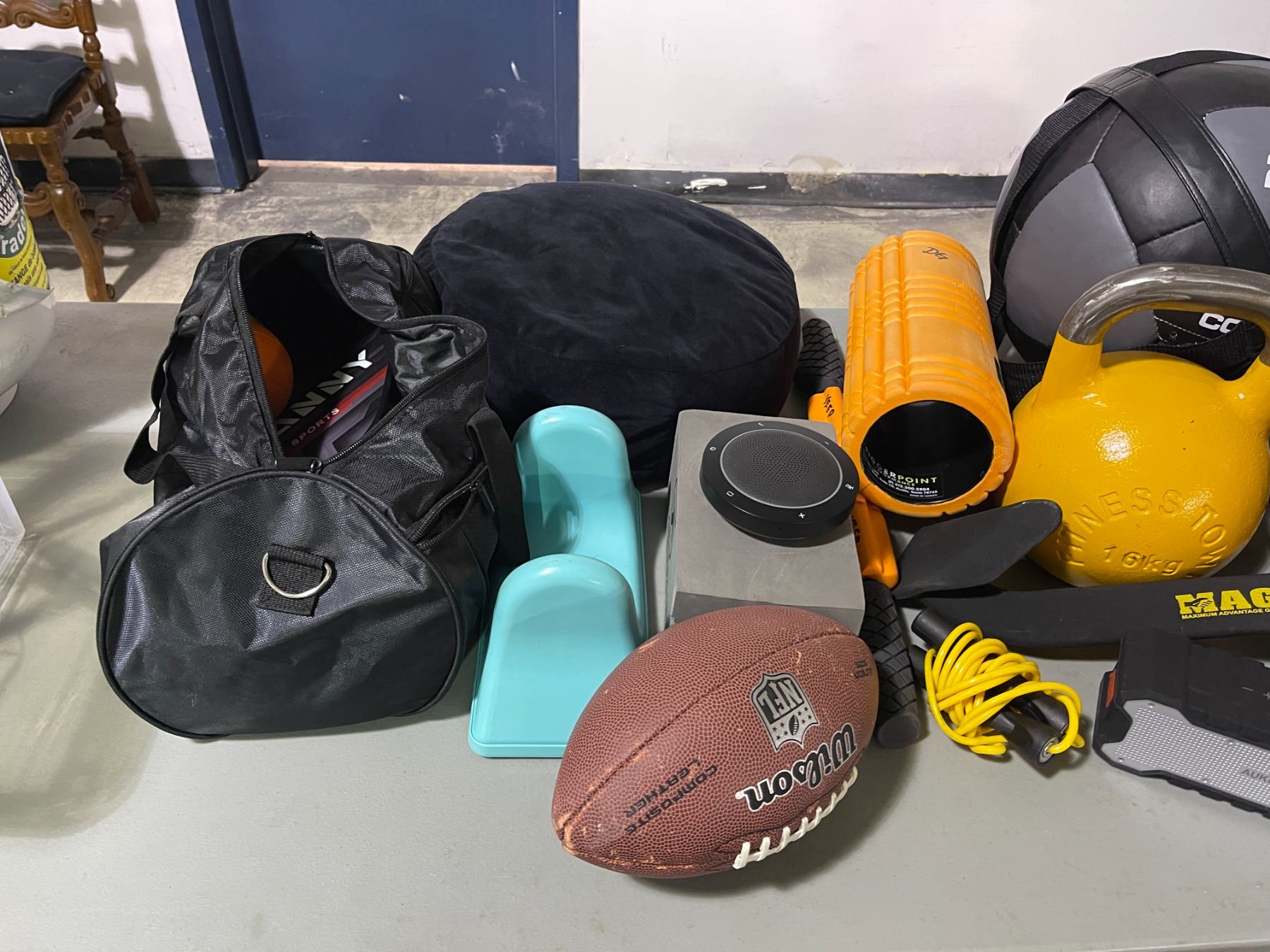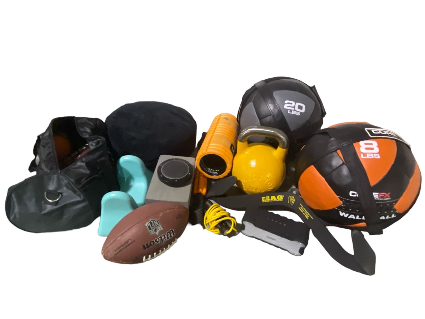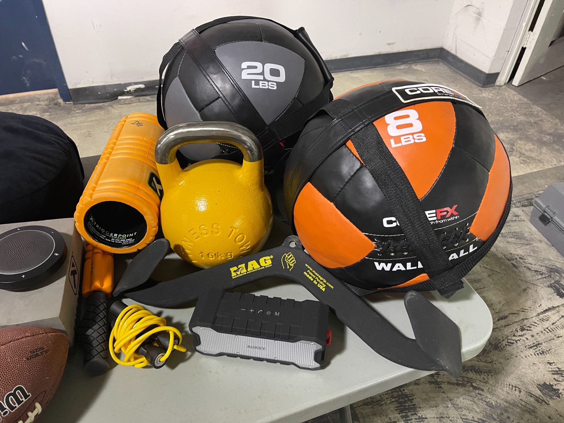 Group lot - 20lb & 8lb medicine balls - 16kg kettlebell - pickleball set - football - speakers - foam rollers - beanbag