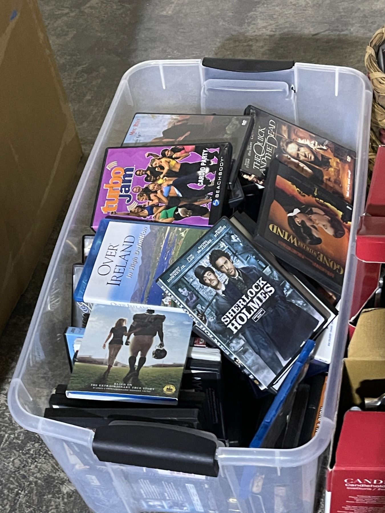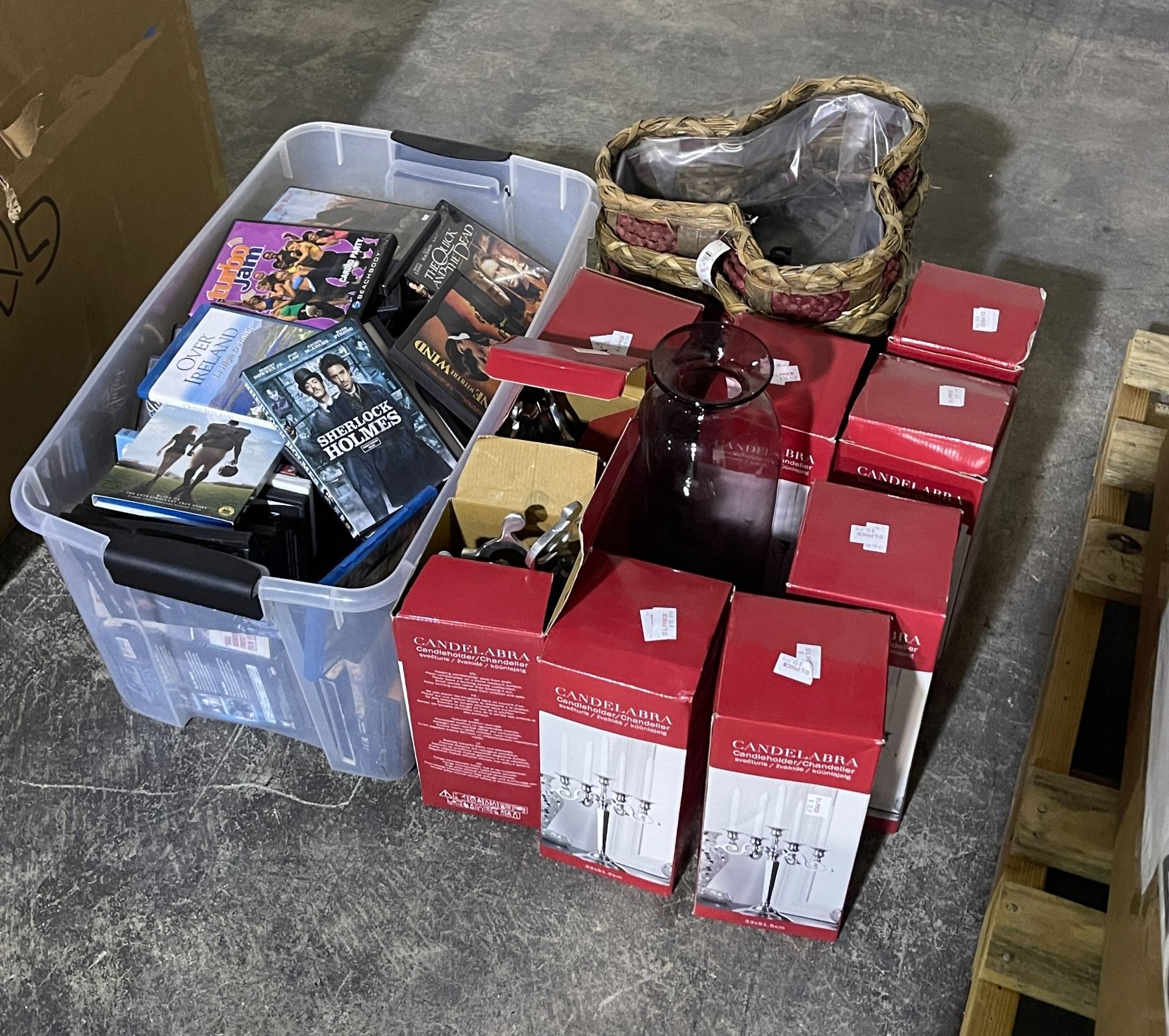 Group lot - Bin of misc DVD's - x4 wicker baskets - x9 Candelabras - Glass vase