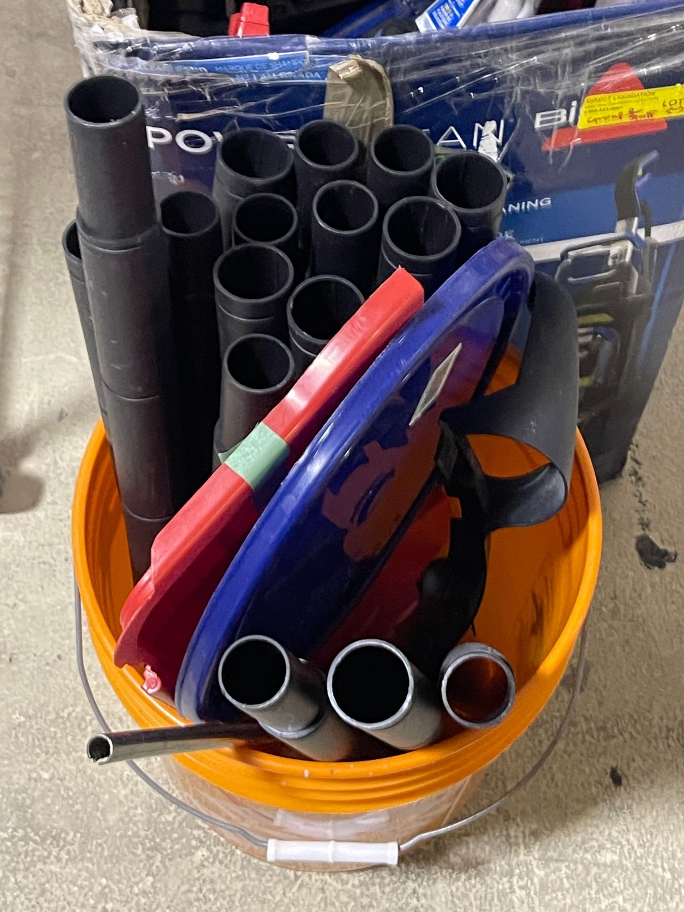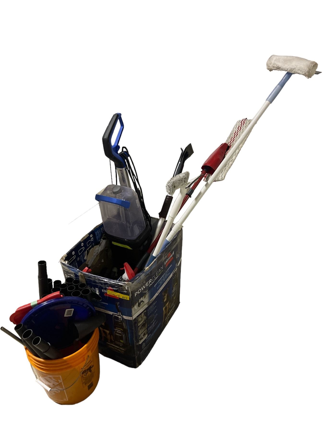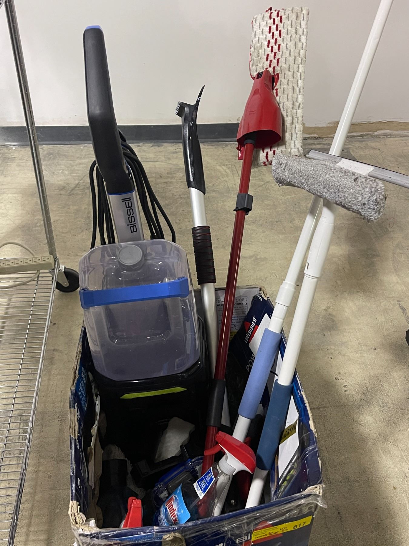 Group lot - Bissell carpet cleaner w/ attachments - Misc cleaning products & plastic shelving (Tested & Working)