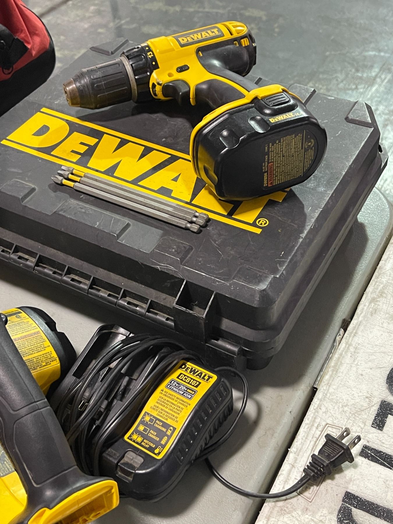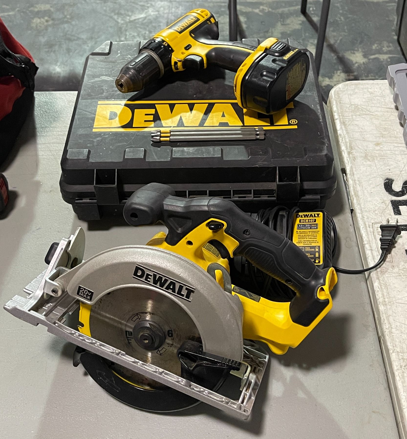 Group lot - DeWalt 20v Max 6.5" cordless skill saw (No battery) w/ charger - DeWalt 14.4v cordless drill (No battery) w/ case & misc bits