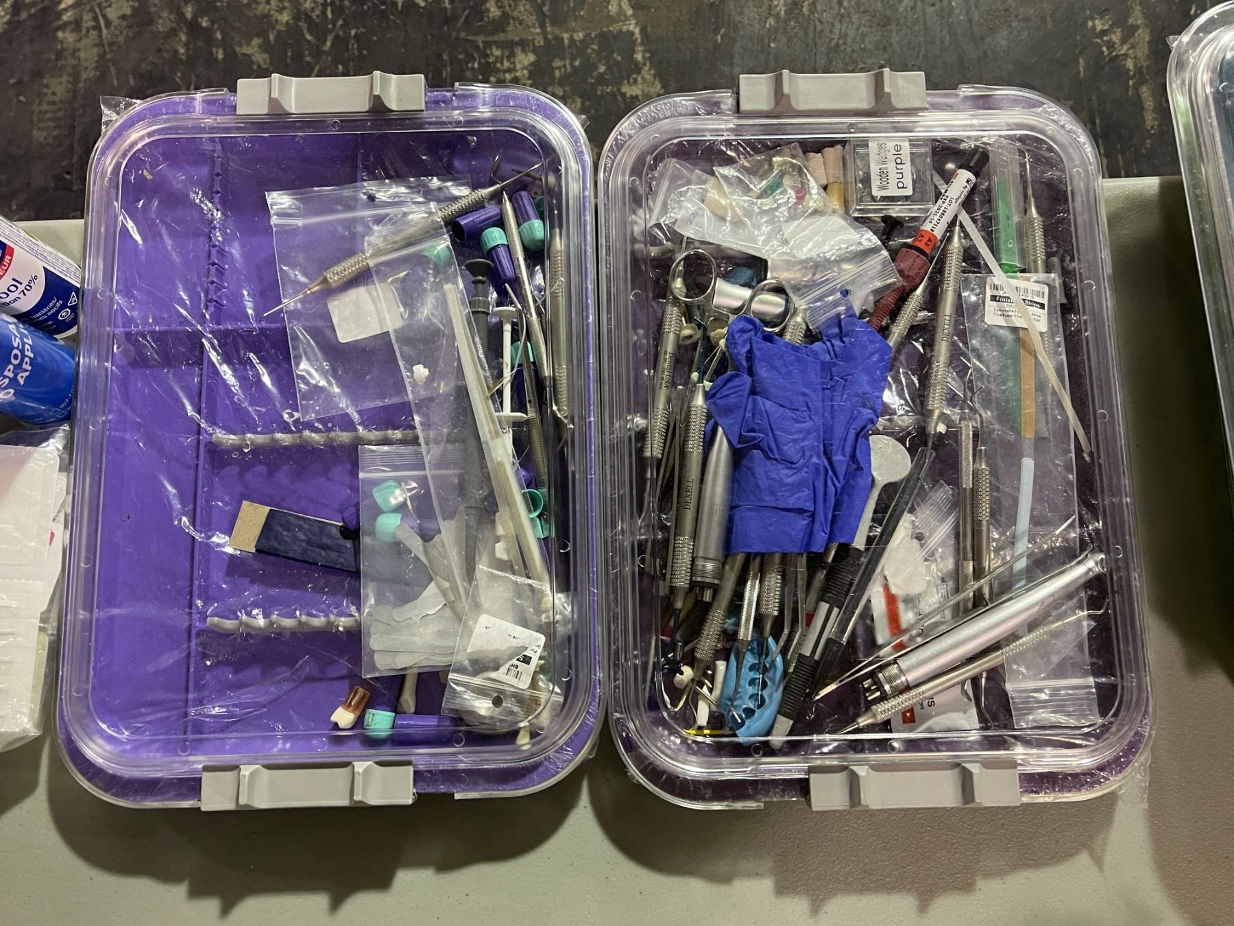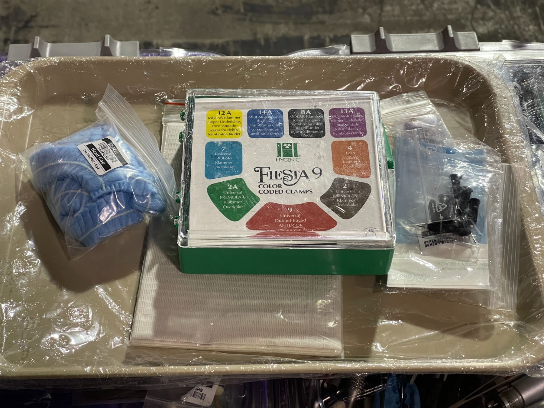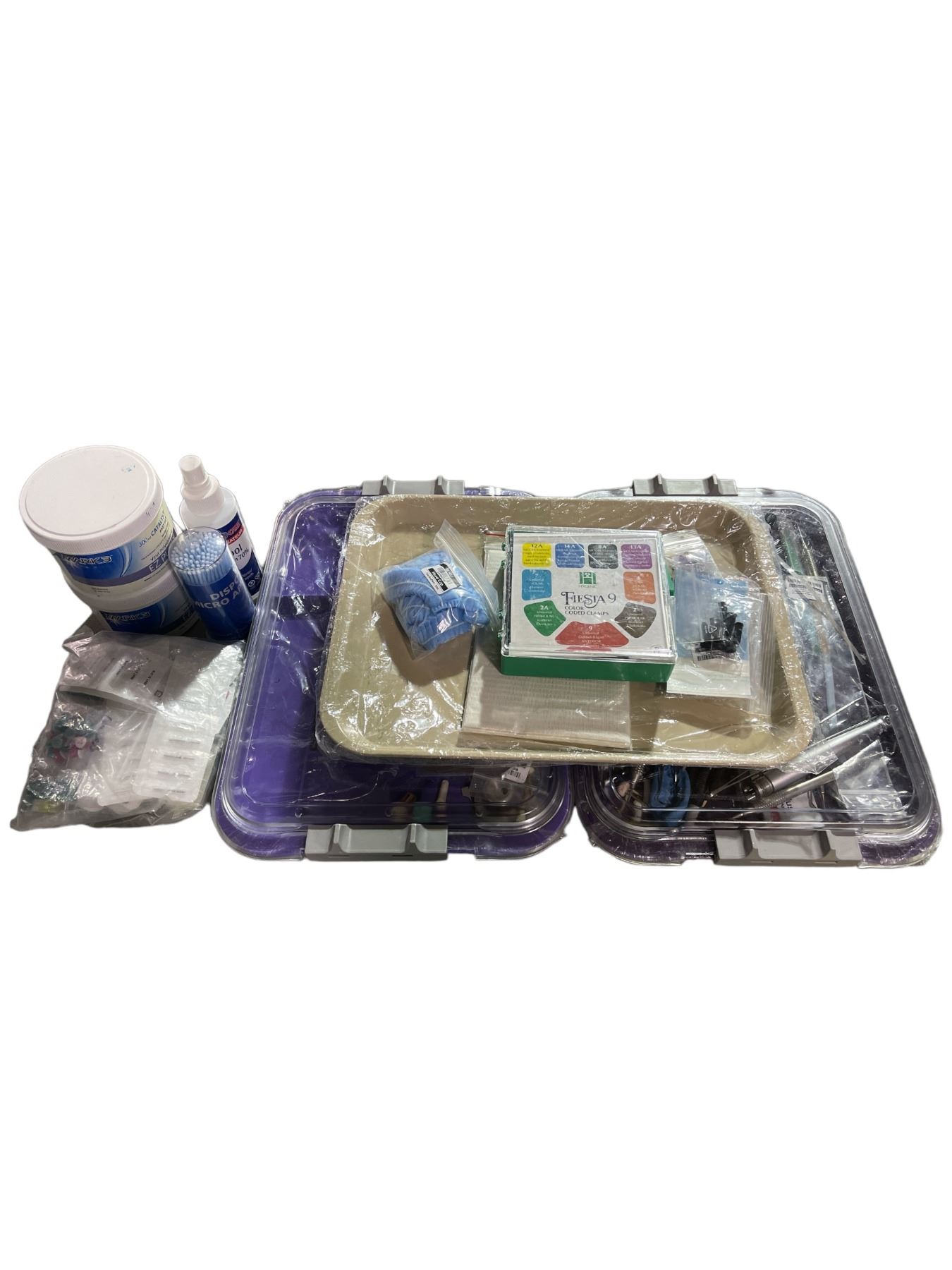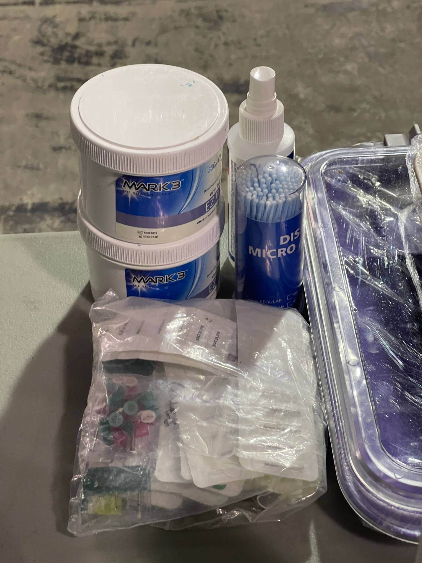 Group lot - Dental tray, x2 cases of misc dental supplies and tools, fast set impression catalyst, sterilizing alcohol (70%)