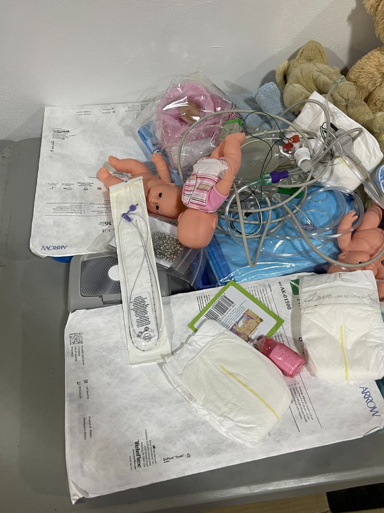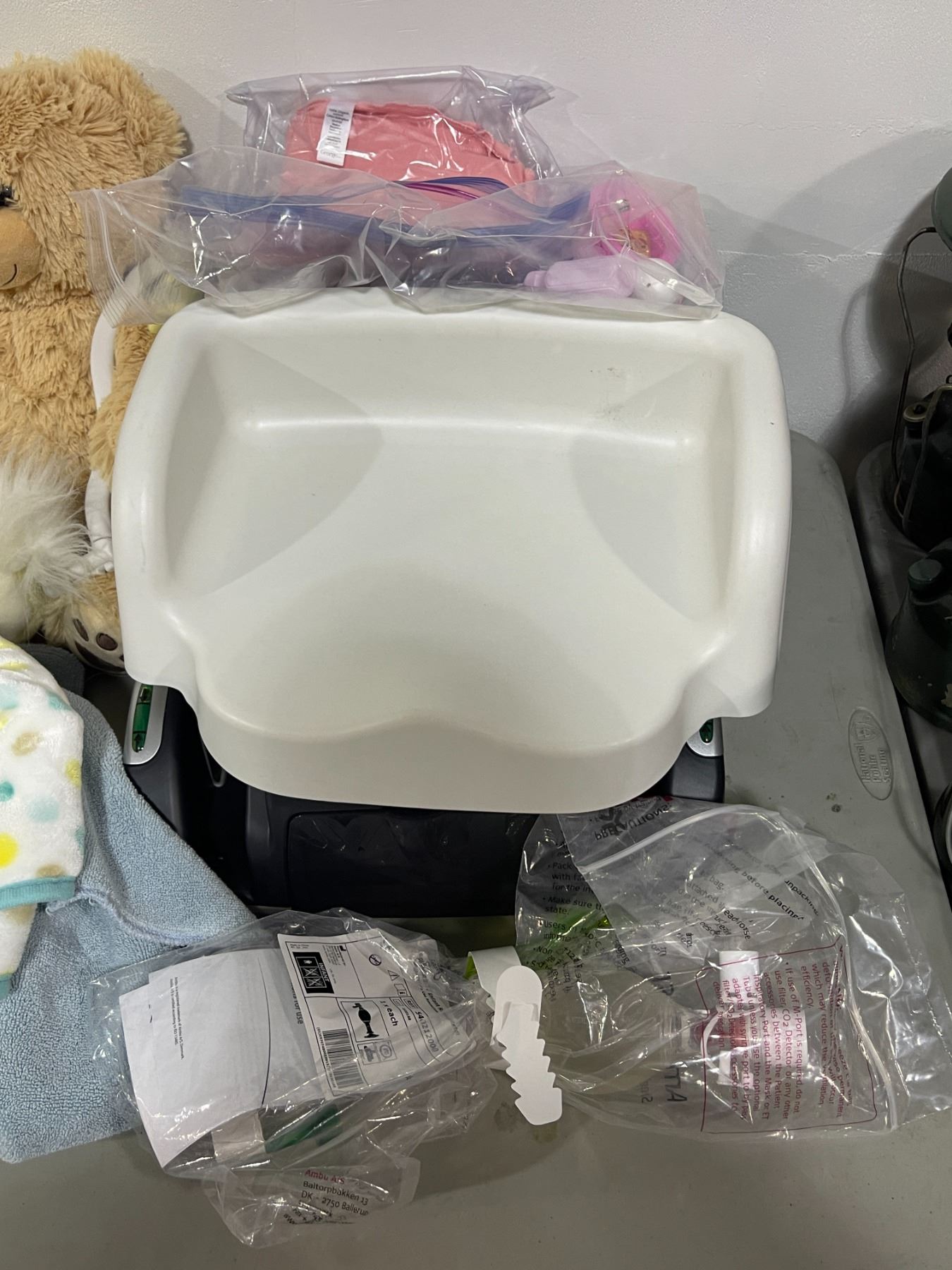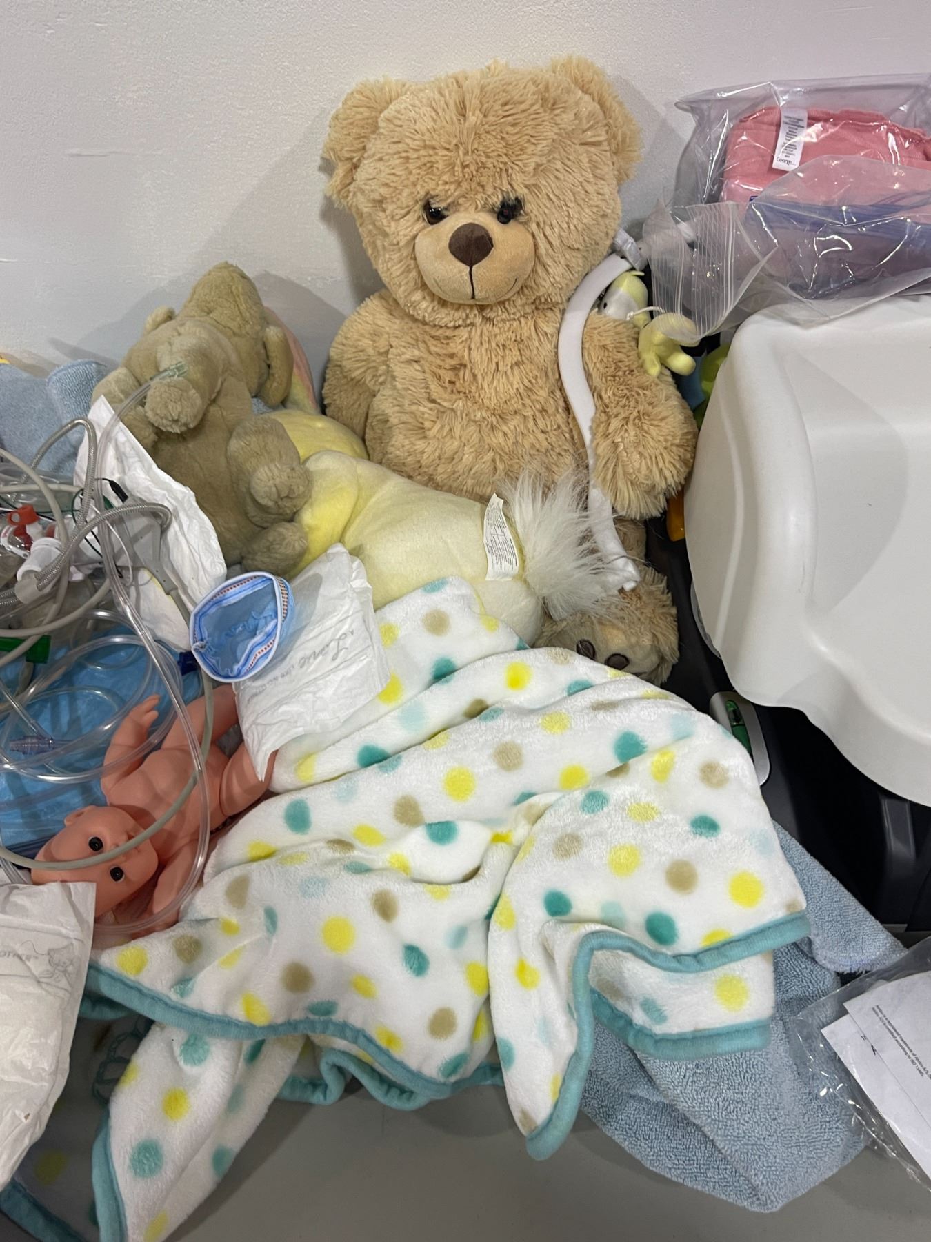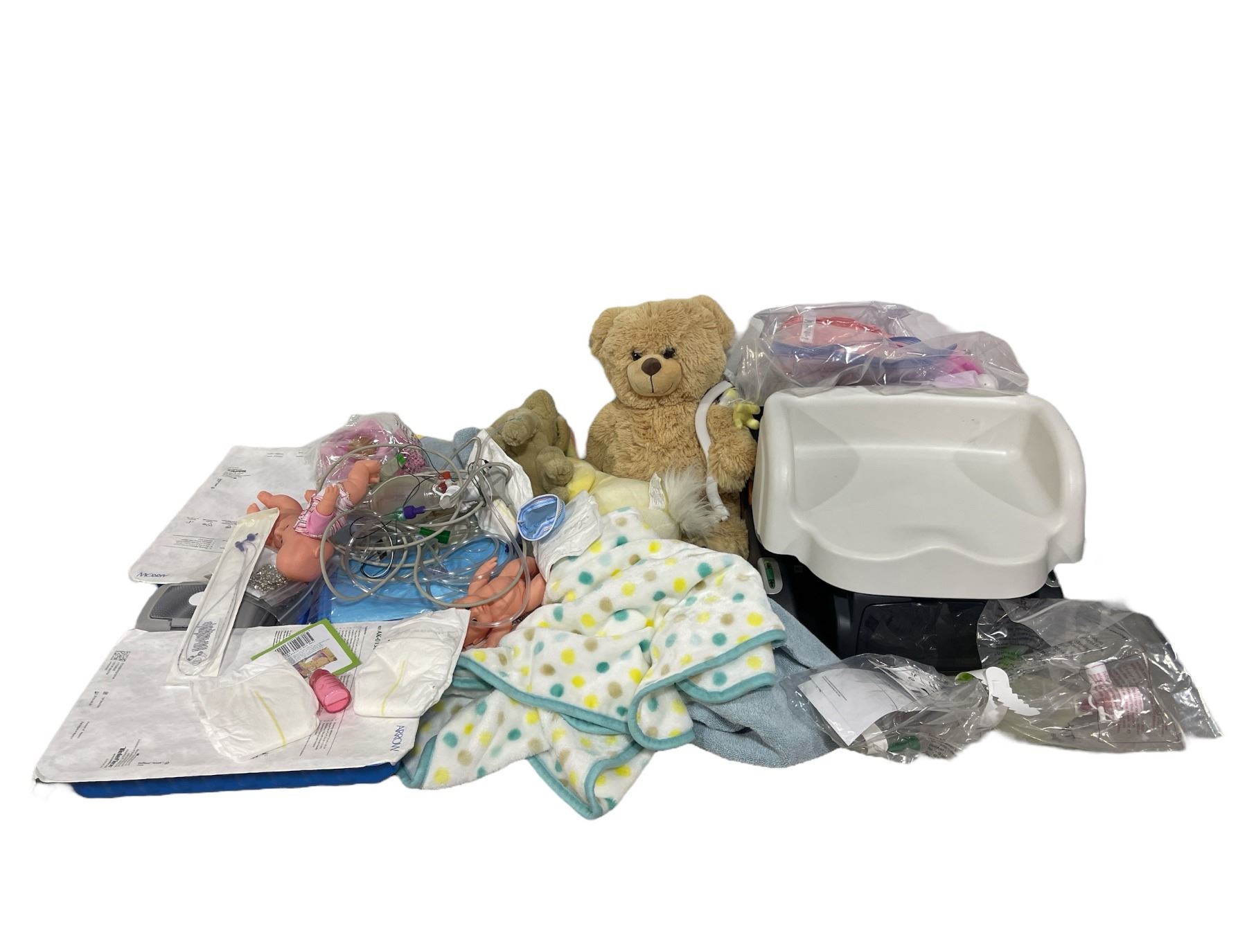 Group lot - Hero baby clothes / stuffed animals / booster seats / misc prop medical equipment
