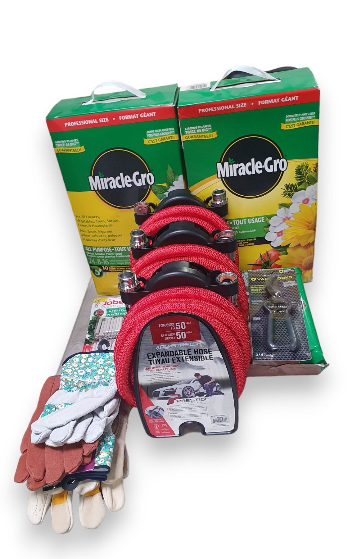 Group lot - Miracle Gro 24-8-16 - x3 Expandable 50' Hoses - Work Gloves - Garden Shears - Fertilizer