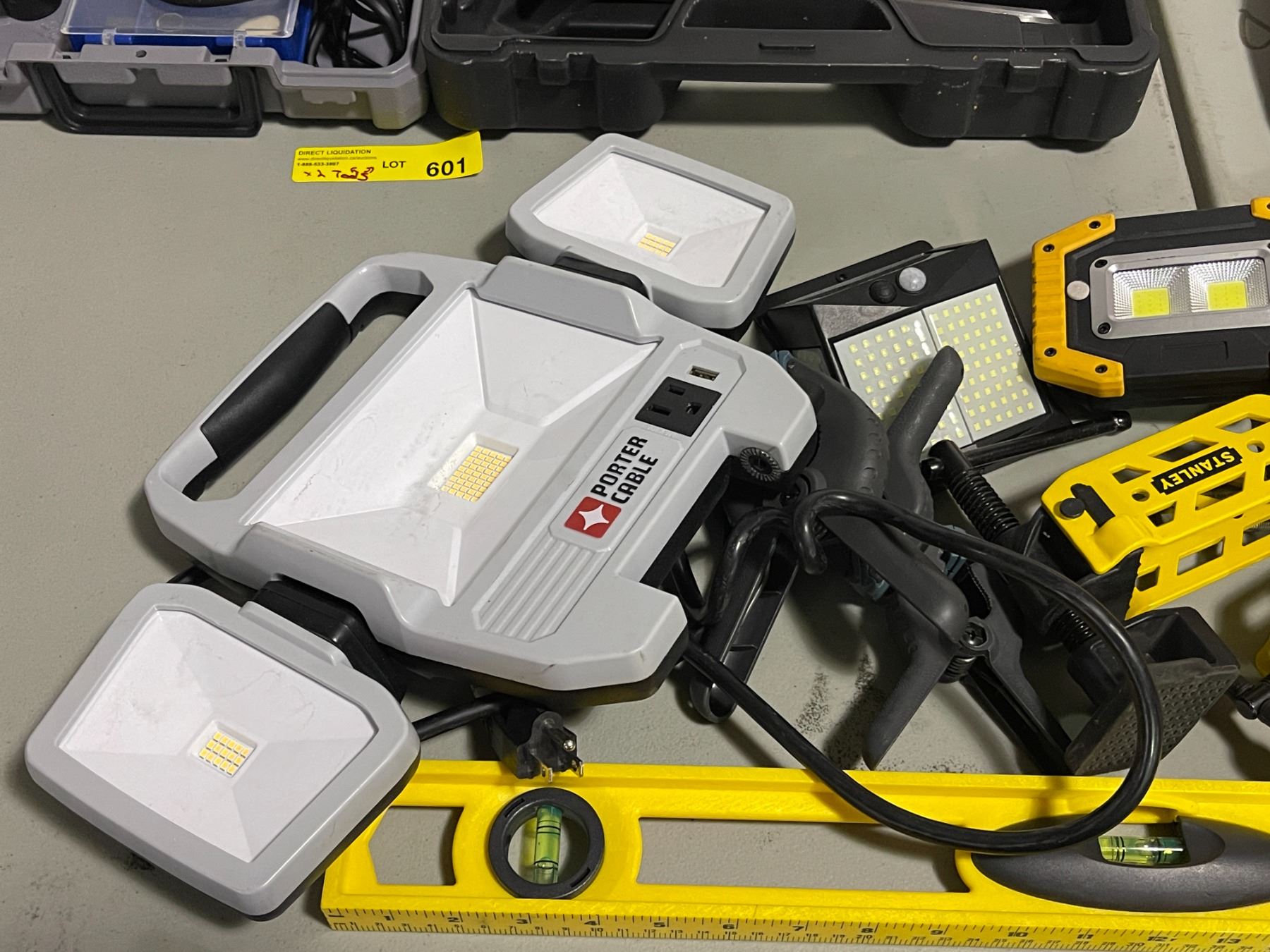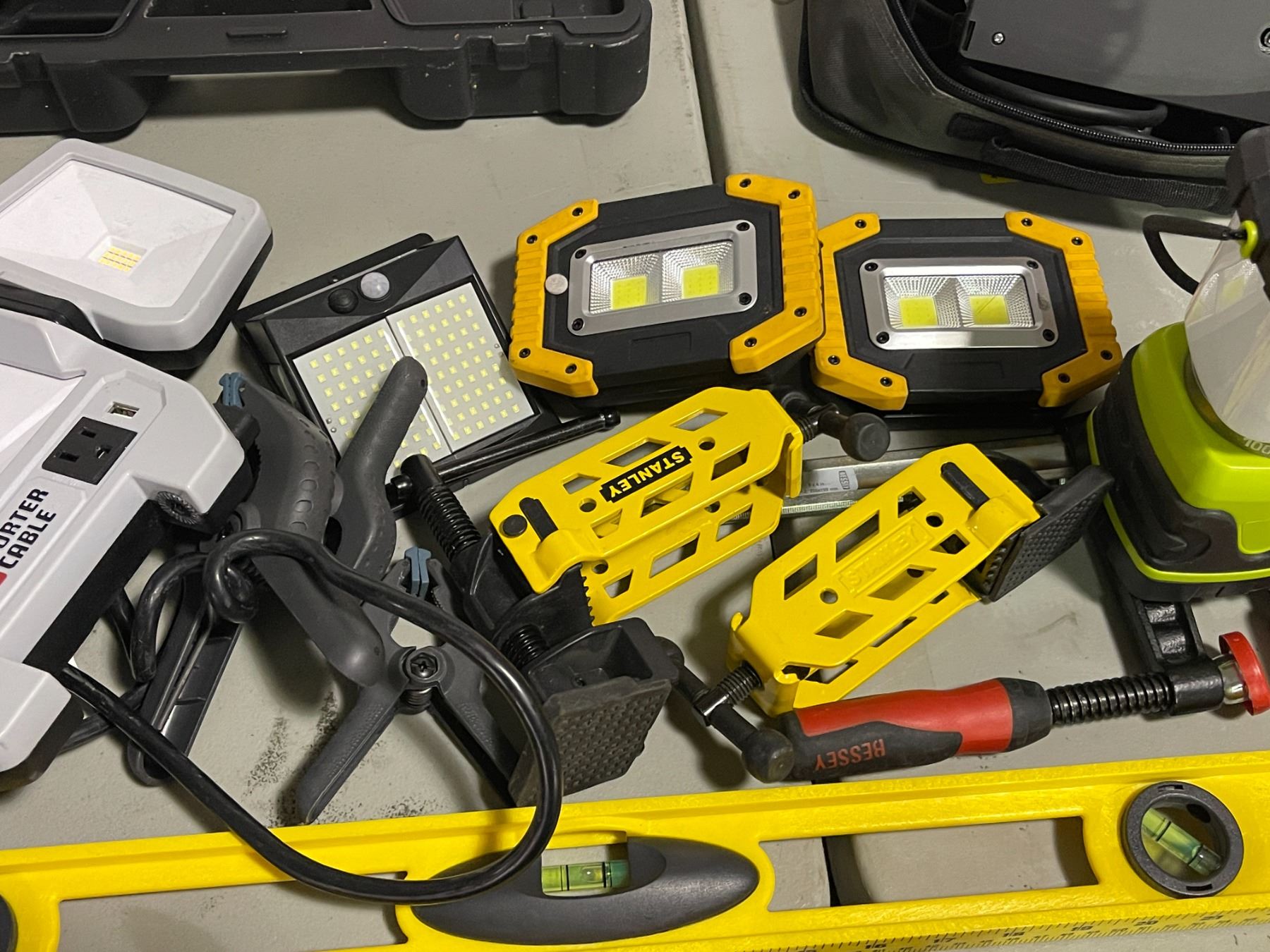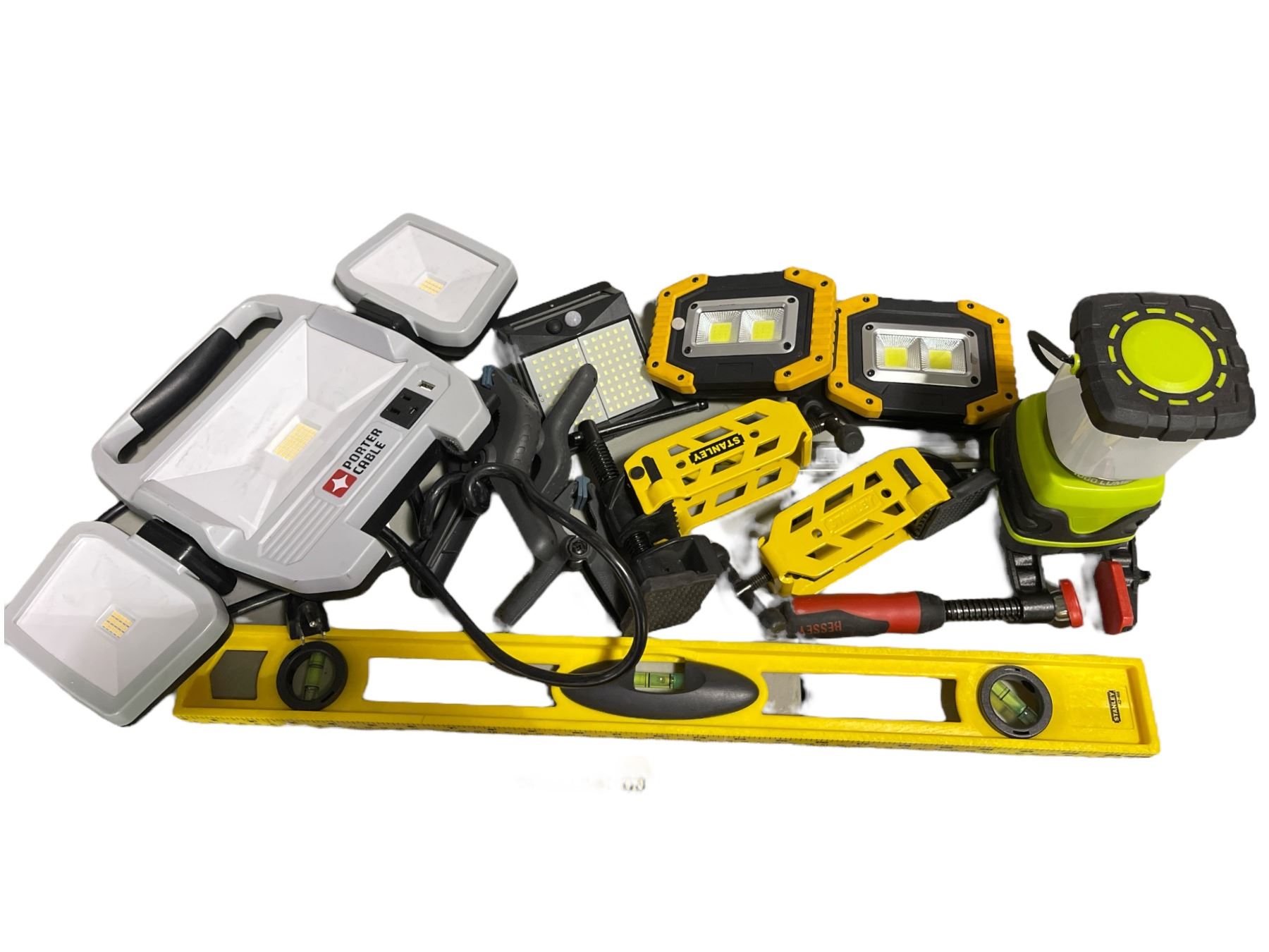 Group lot - Misc LED work lights, clamps, plastic 24" bubble level (Tested & Working)