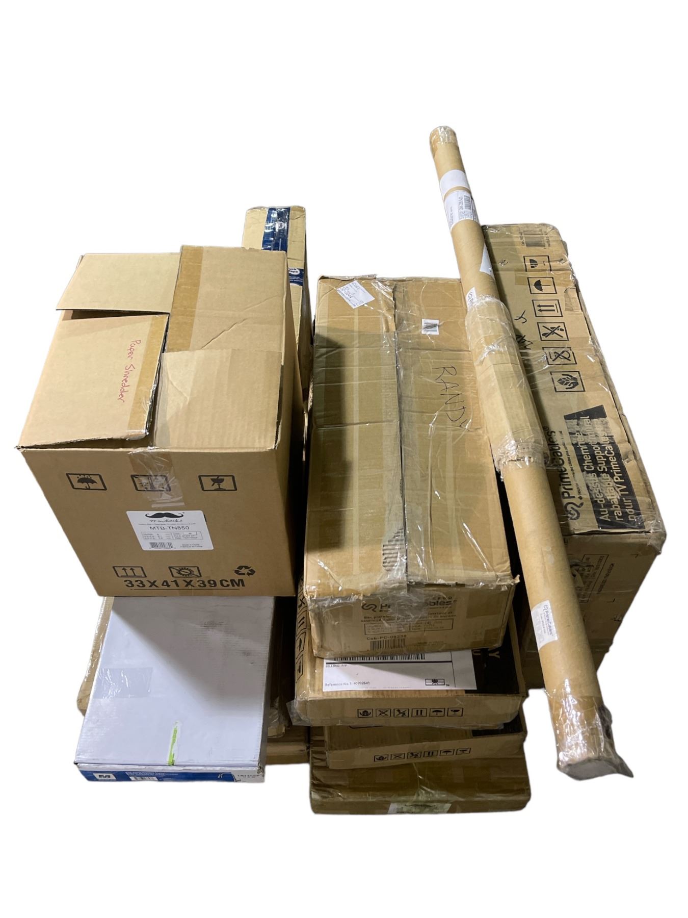 Group lot - Prime cables Cash drawer / TV Mount / Underdesk keyboard trays / Paper shredder / misc office items