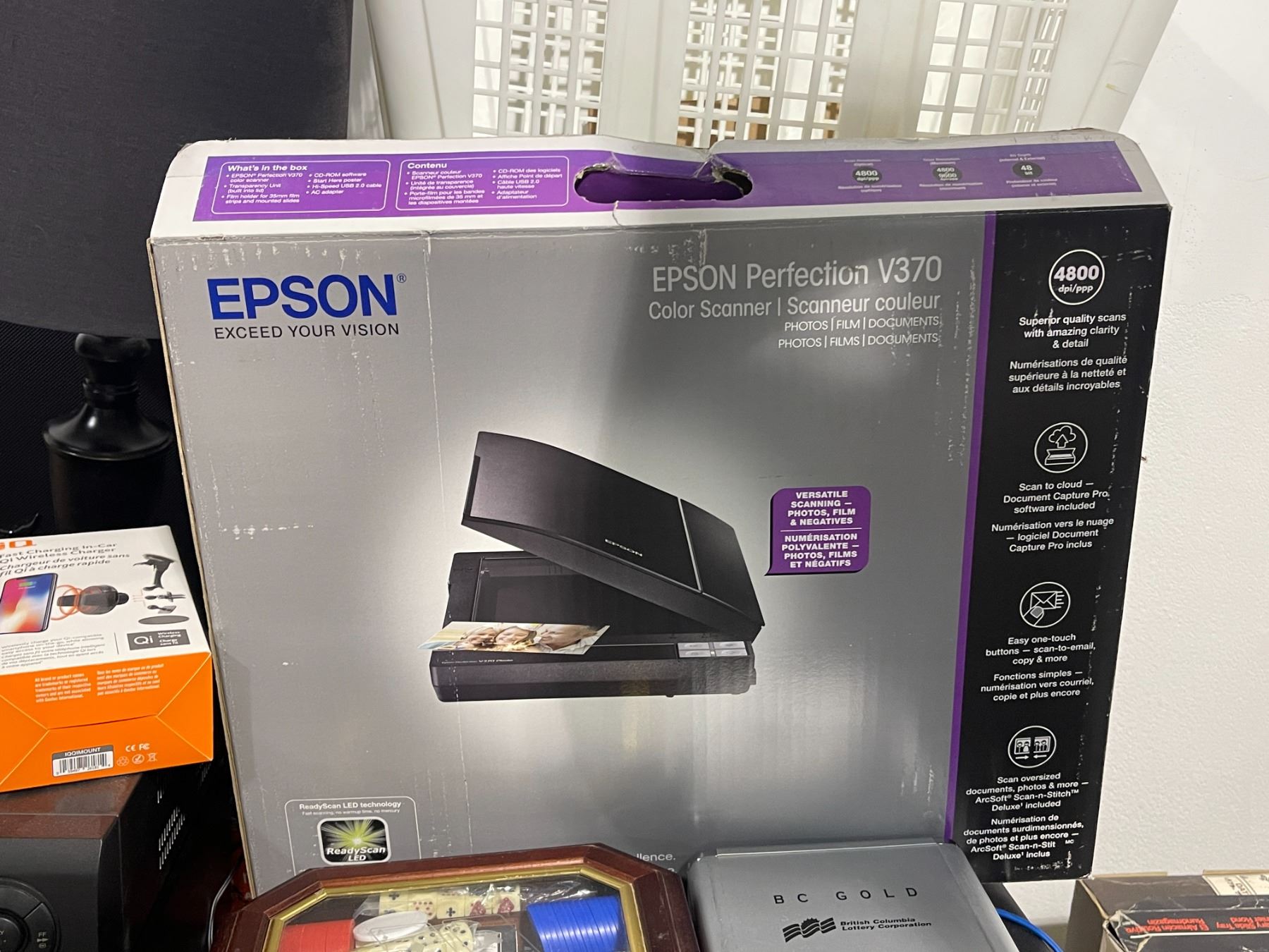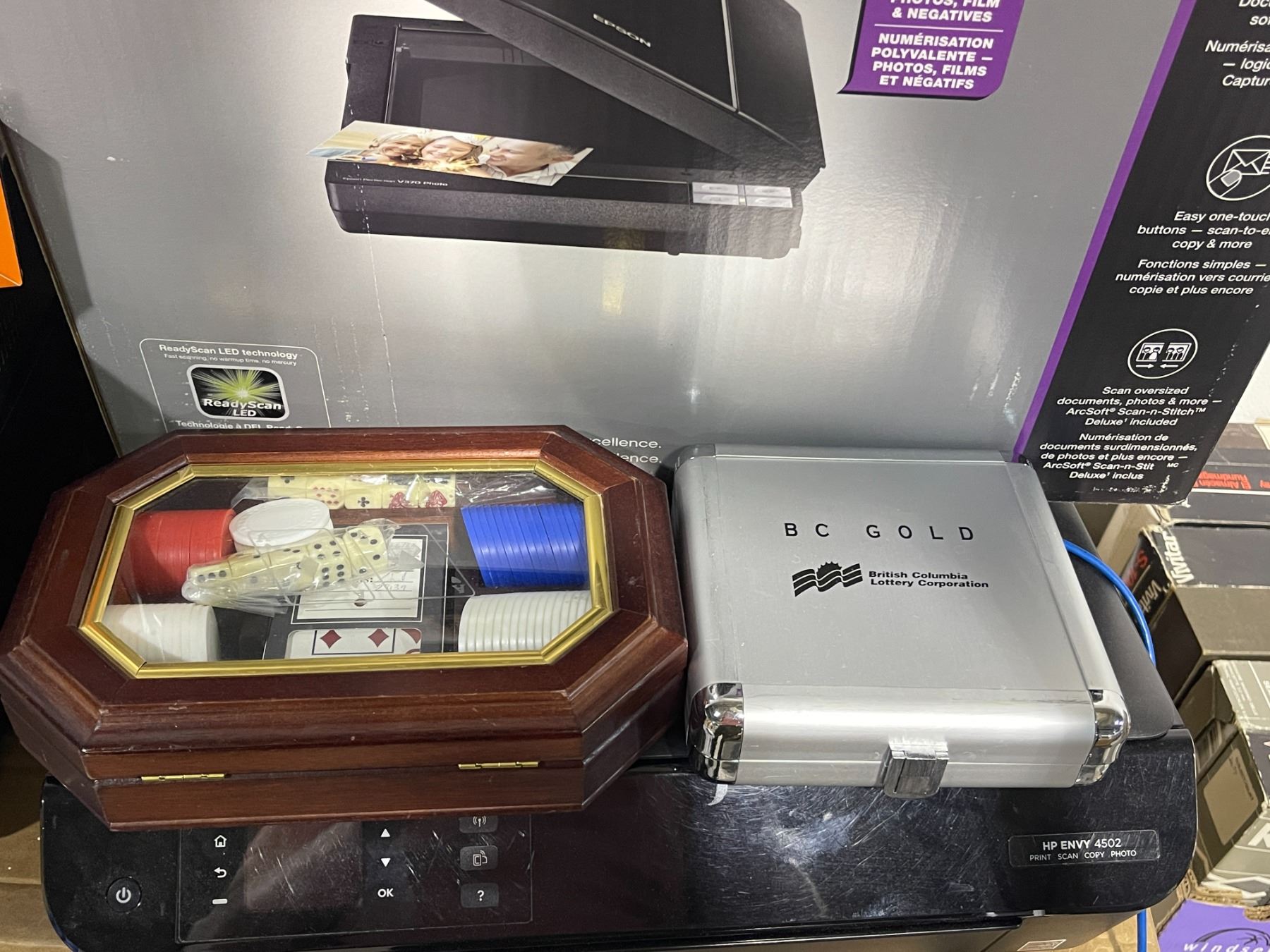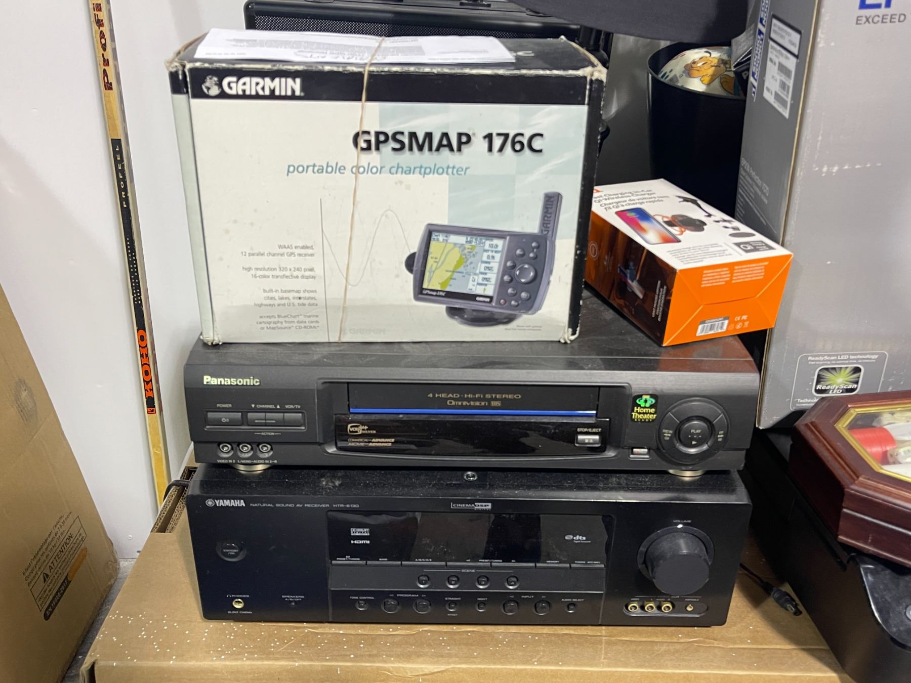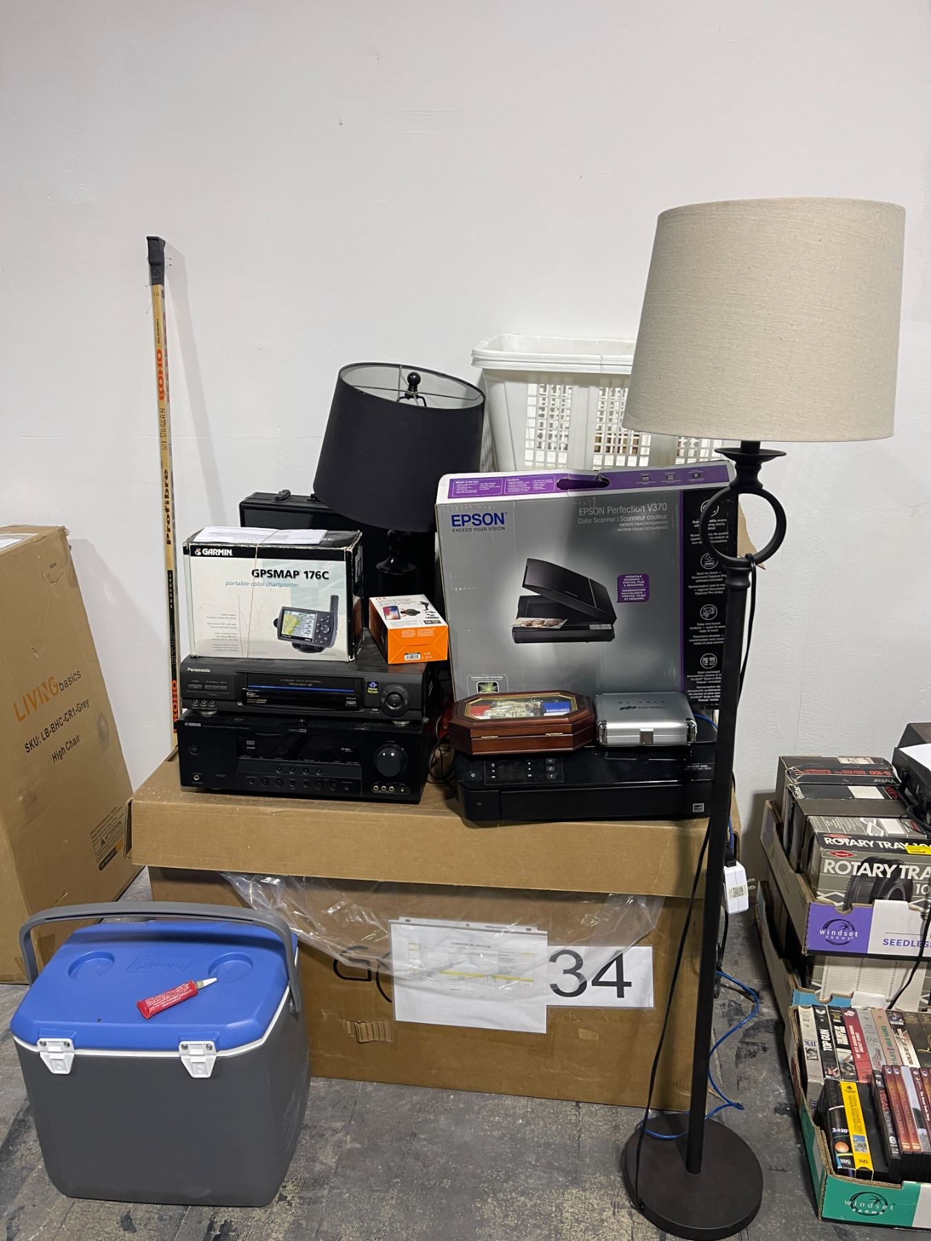 Group lot - Walkman / Old Phone / Poker set / Scanner / VHS player / Stereo amp / Lamp / Briefcase