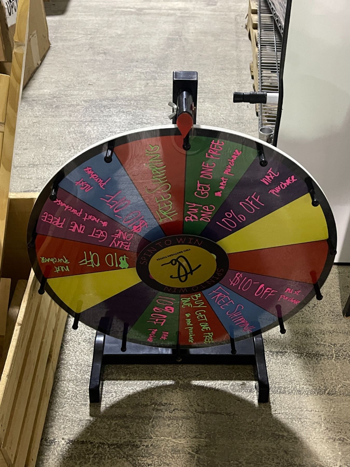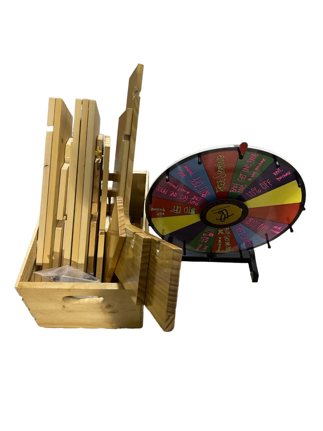 Group lot - Wooden display shelves (In pieces) - White board - Promotional "Wheel of Fortune" wheel