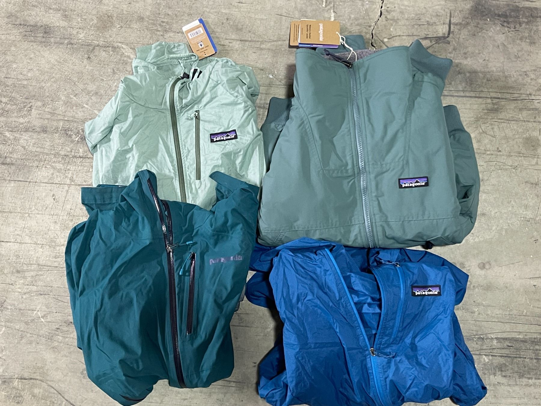 Group lot - x4 Patagonia Jacket/Windbreakers (Womens) - Approx Value : $450 - Blue (M) w/tags - Green (M) - Green (M) w/tags - Green Jacket (XS) w/tags